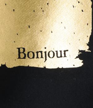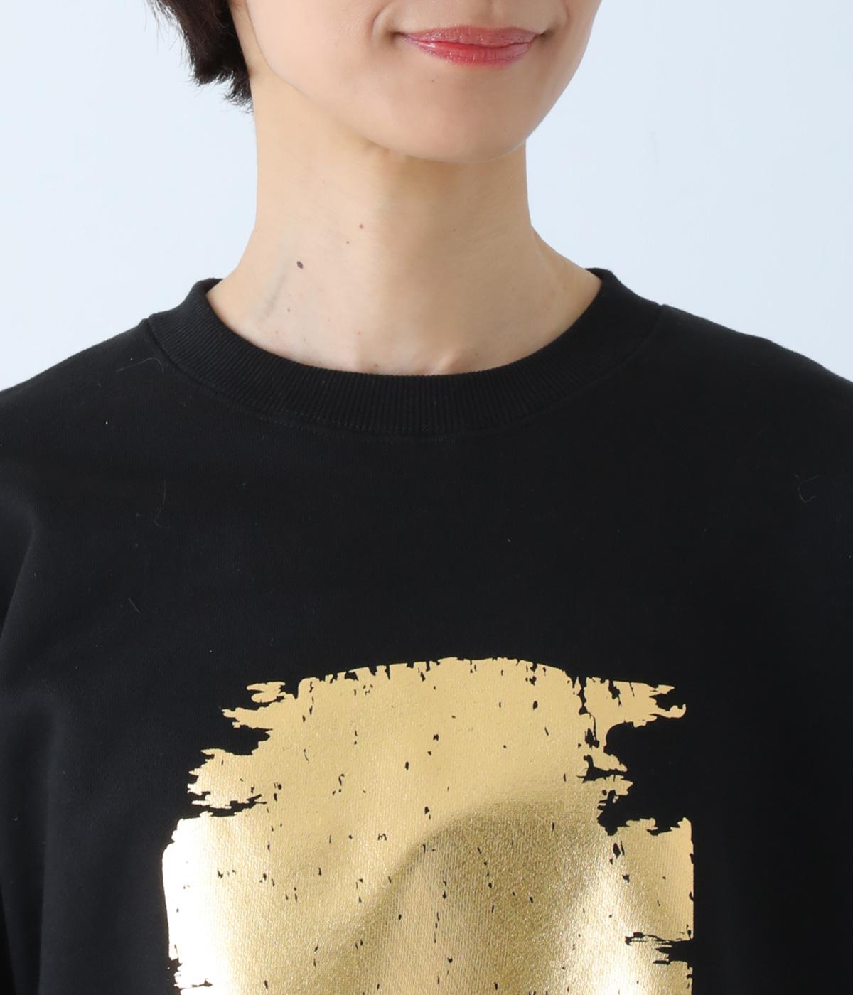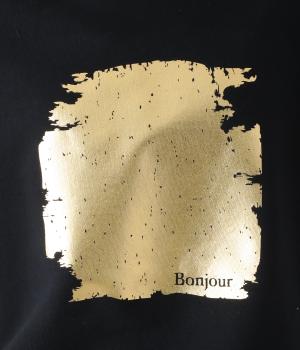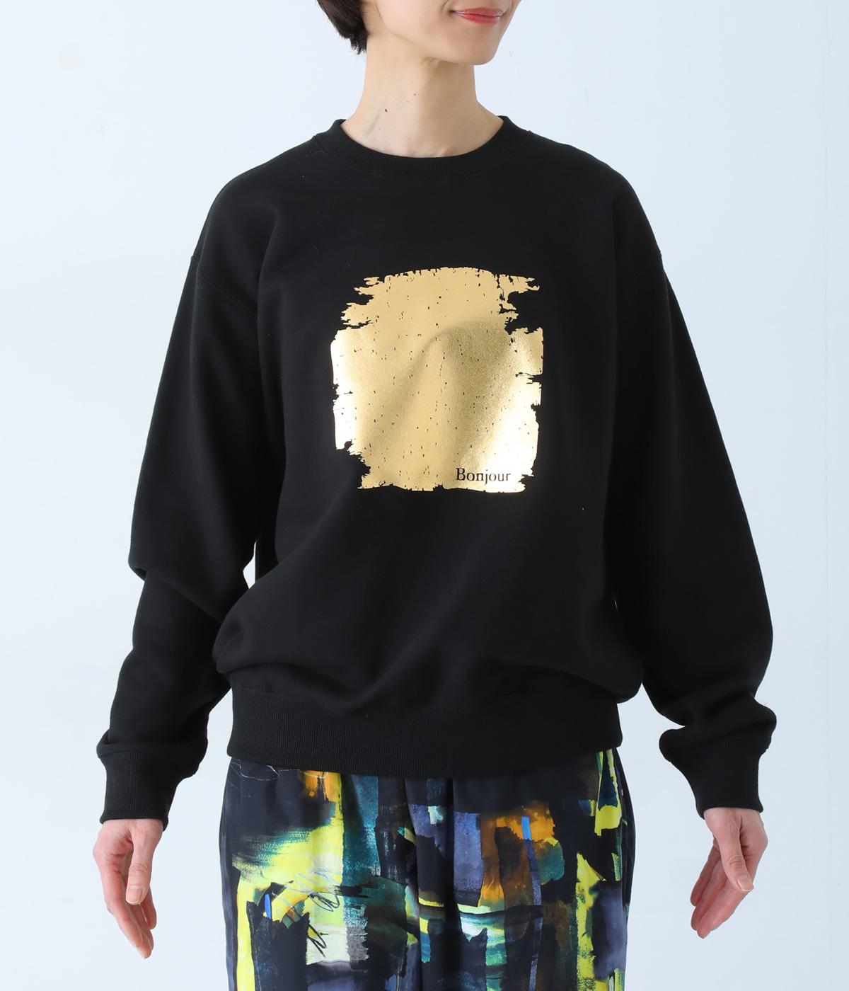 箔プリントがインパクトを放つプルオーバーに、さりげなくフランス語のメッセージをあしらいました。定番の型でボトムスを選ばず、着まわしのきく一枚。カジュアルなアイテムに華やかな個性をプラスした着映えトップスです。