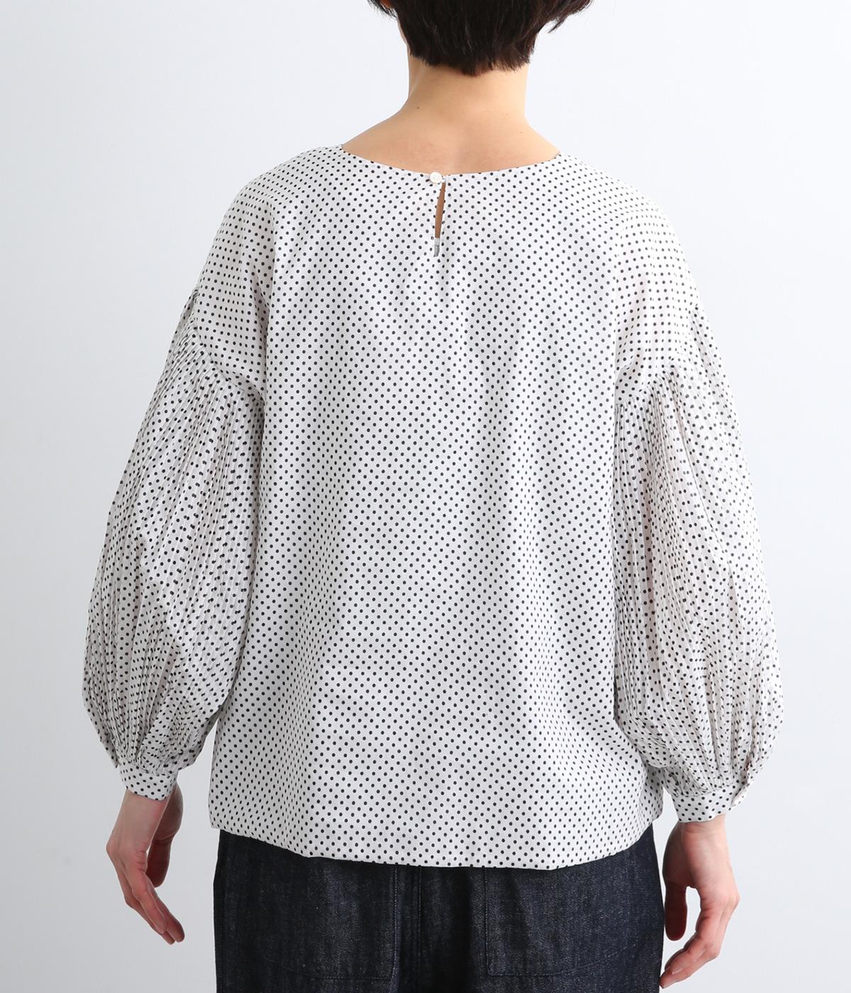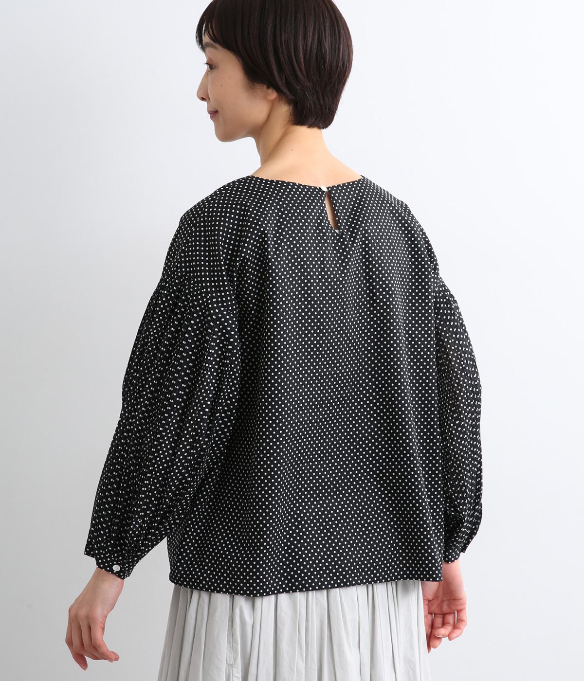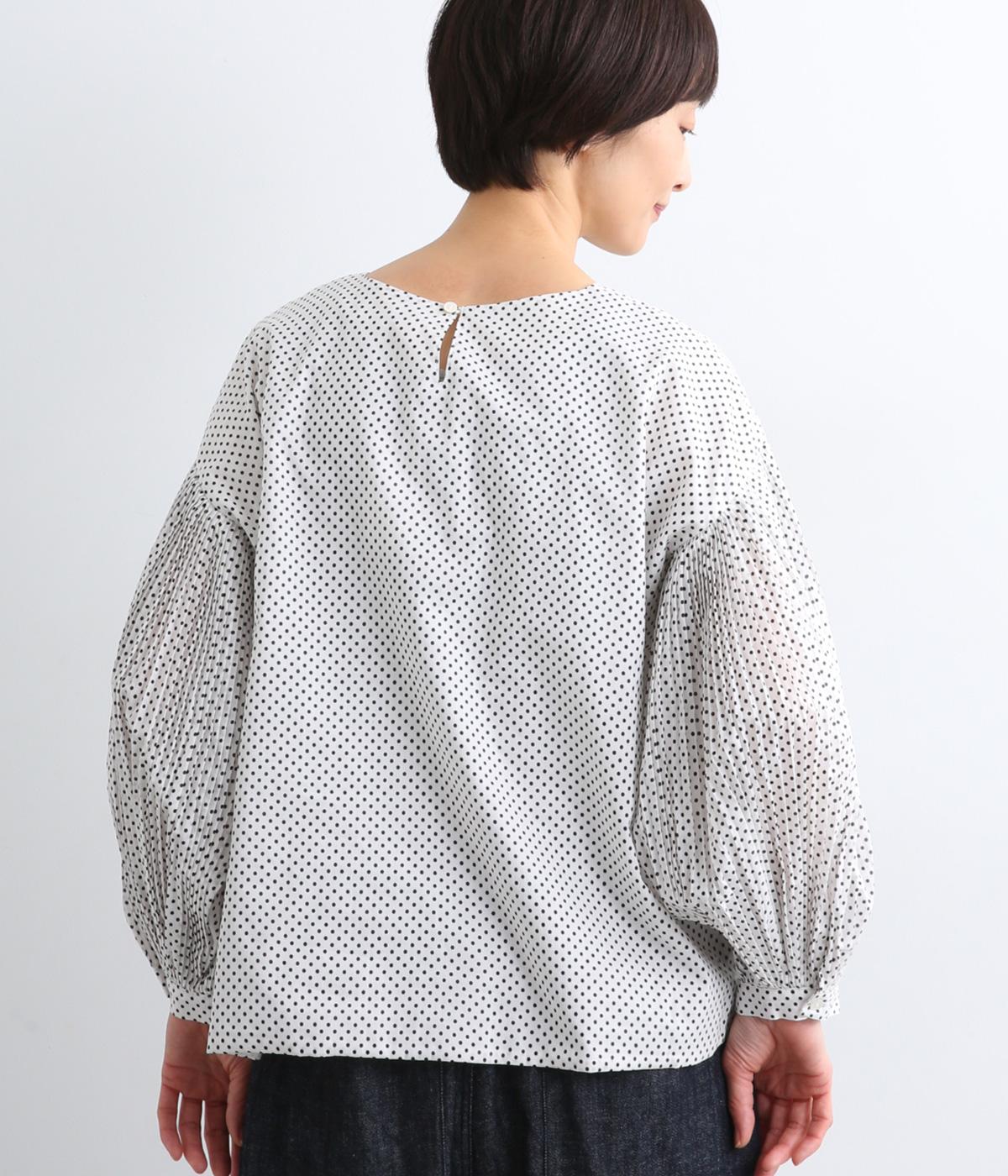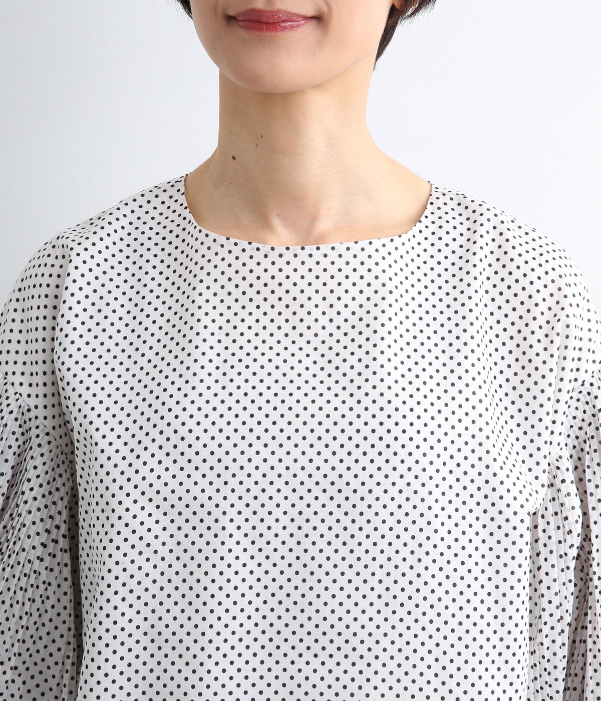 細かなドットローンが大人レトロな雰囲気を運ぶプルオーバー。プリーツをたっぷりほどこしたボリューム袖がポイントで、いつものスタイルからよそいきまで幅広いコーディネートがたのしめます。後ろ涙開きで頭の通りもスムーズ。