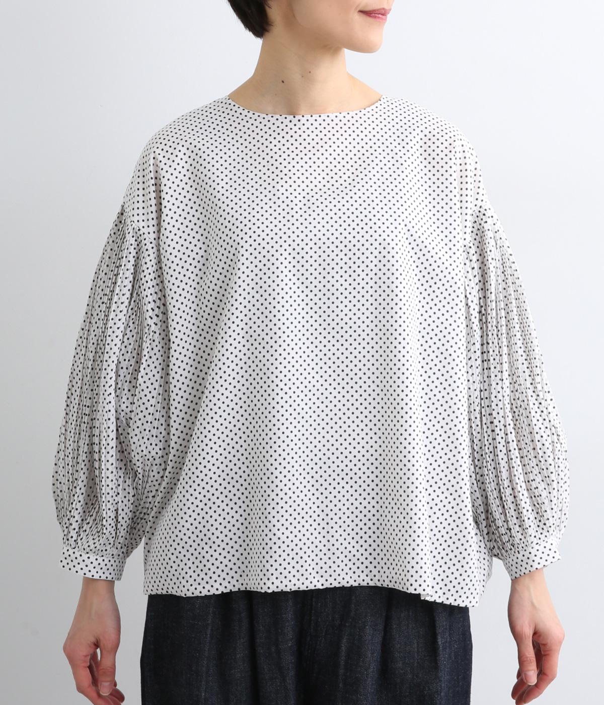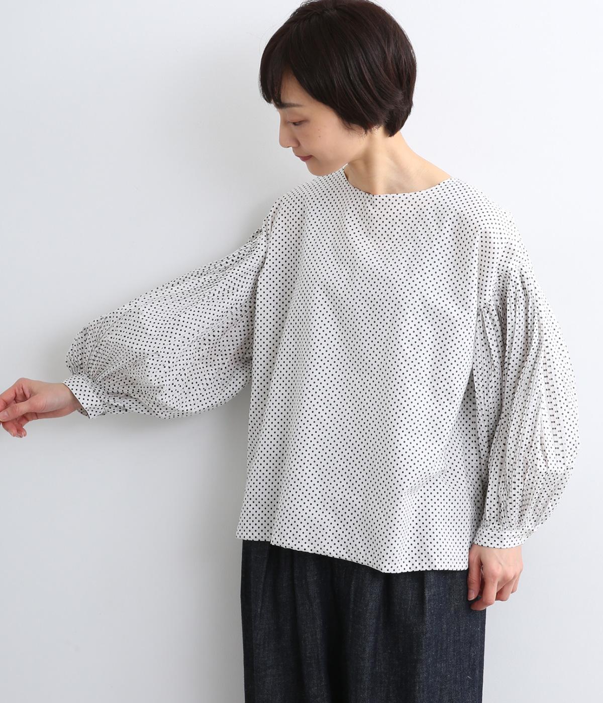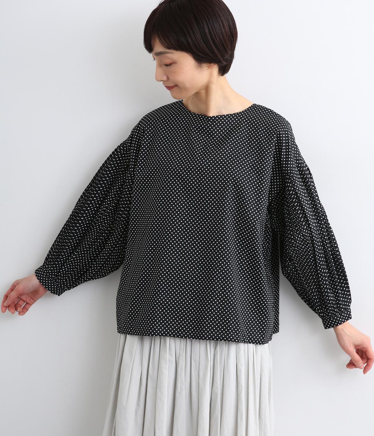 細かなドットローンが大人レトロな雰囲気を運ぶプルオーバー。プリーツをたっぷりほどこしたボリューム袖がポイントで、いつものスタイルからよそいきまで幅広いコーディネートがたのしめます。後ろ涙開きで頭の通りもスムーズ。
