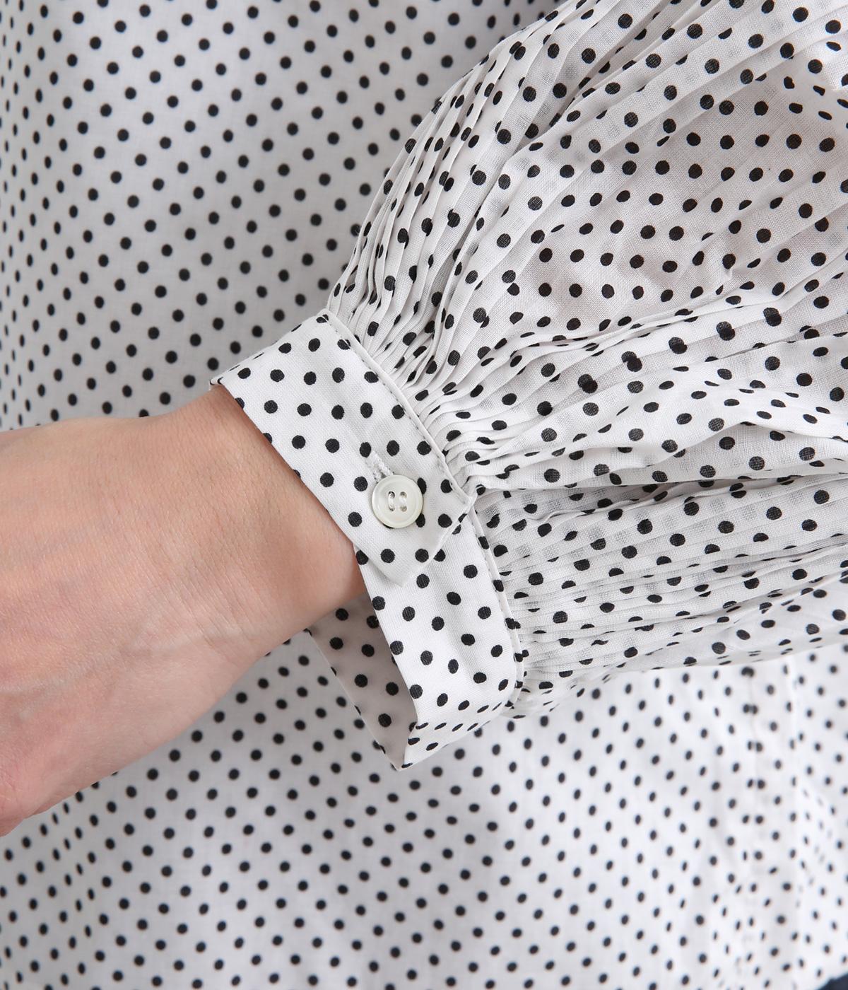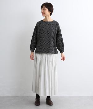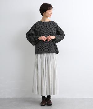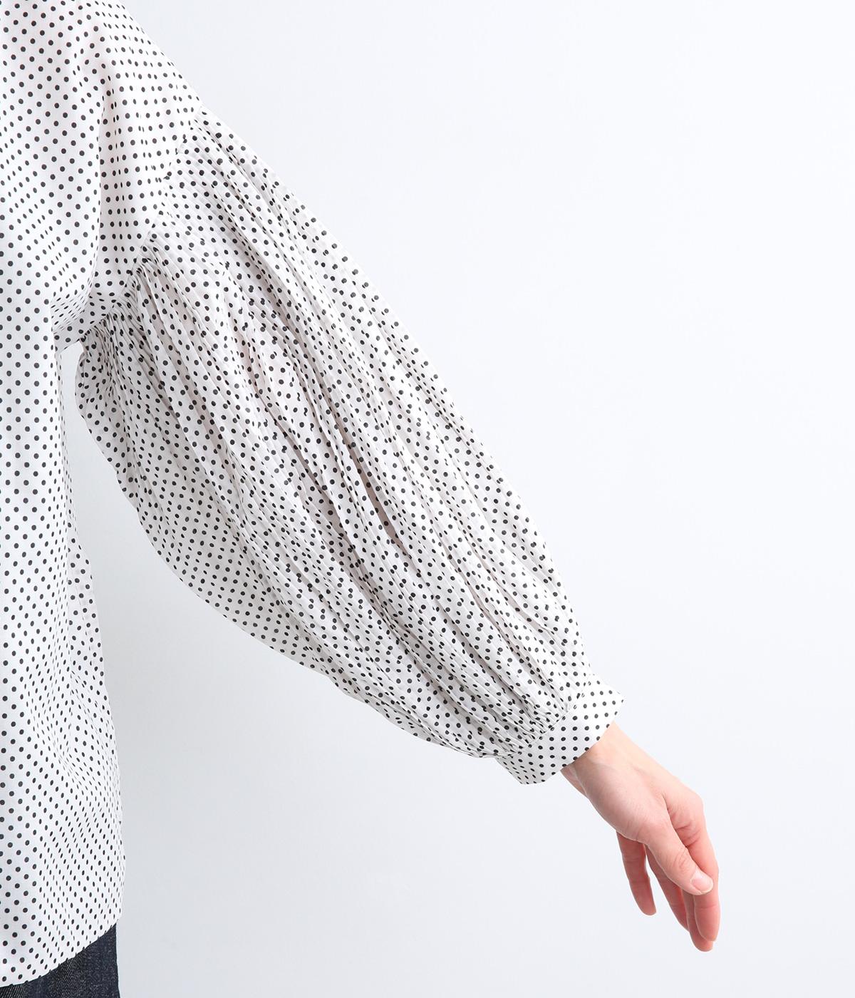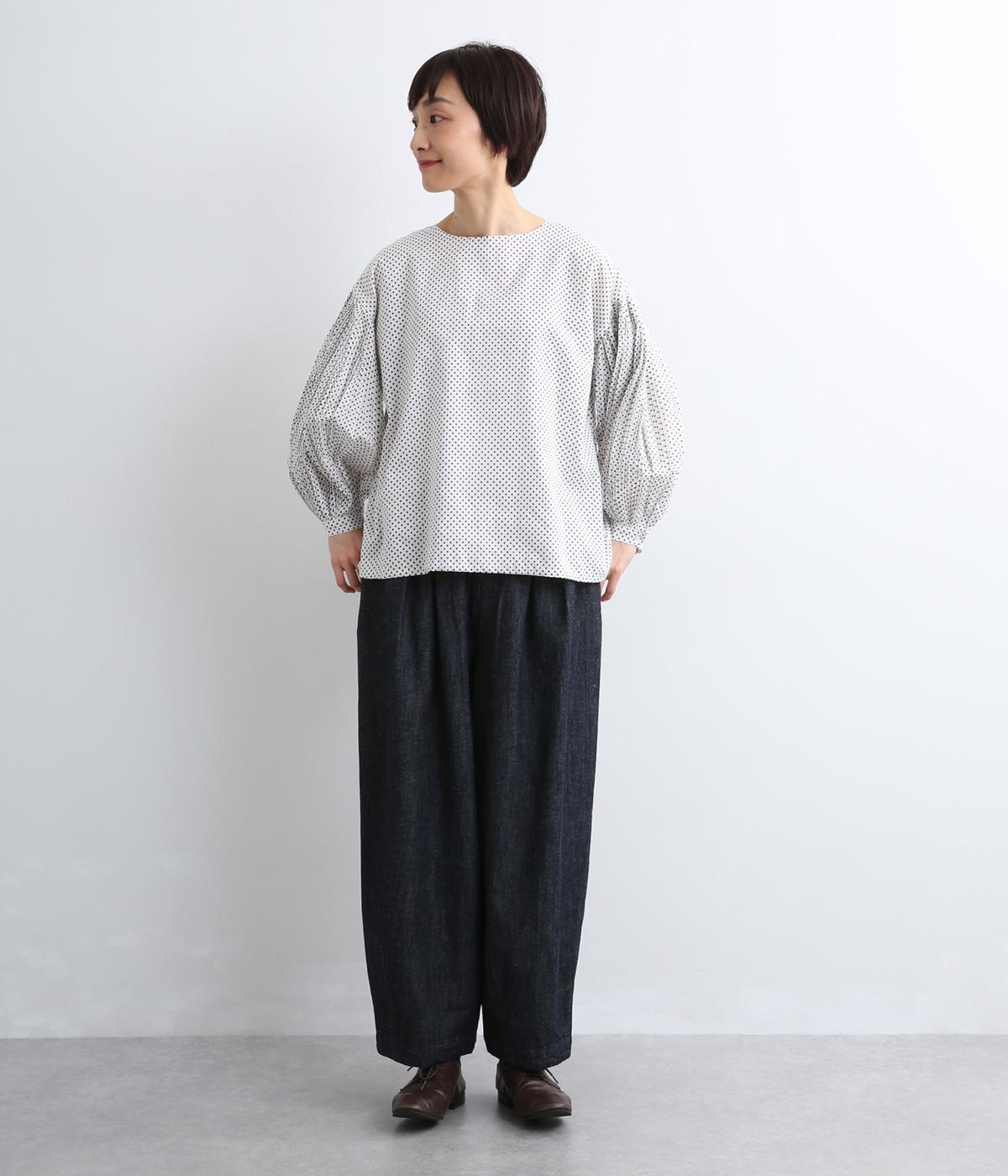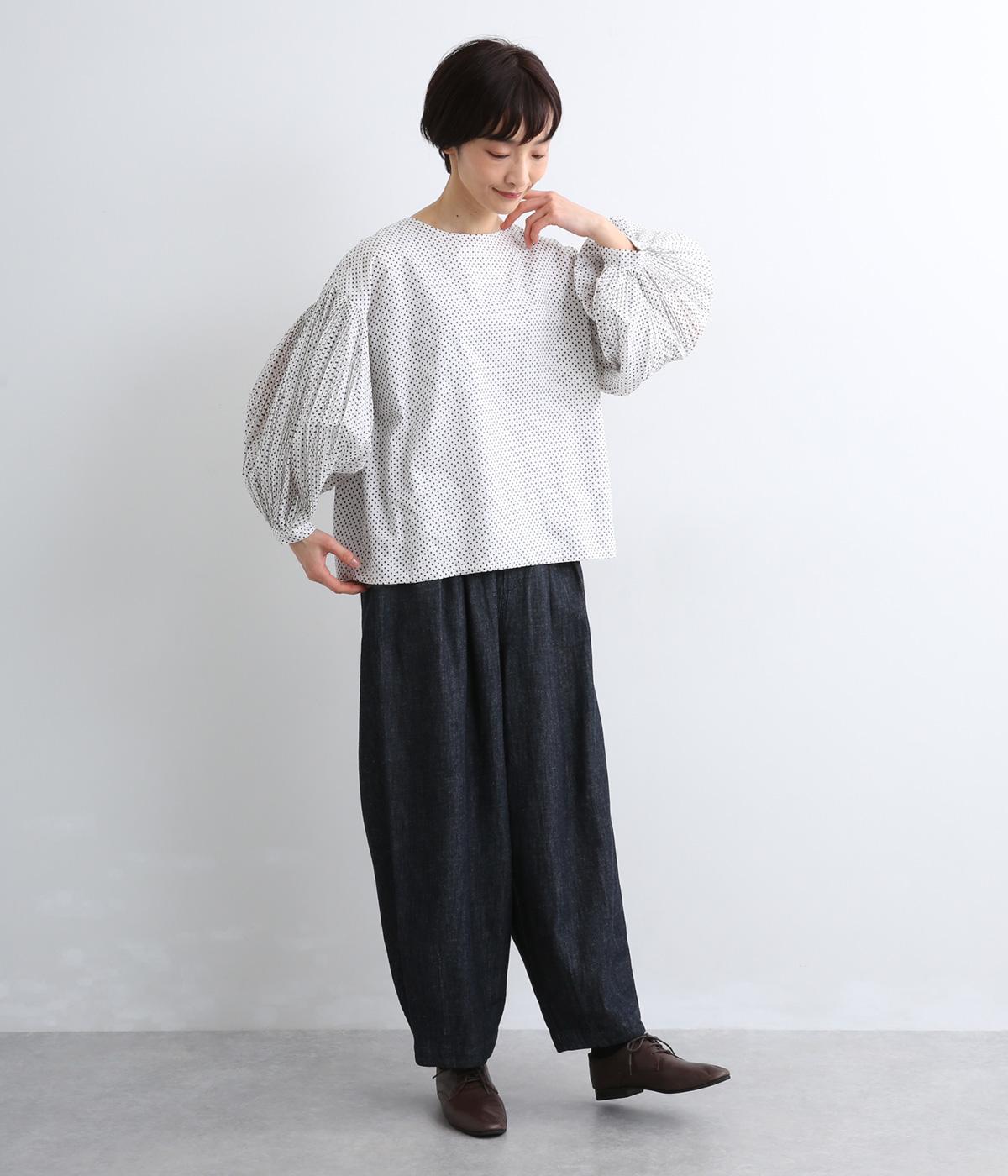 細かなドットローンが大人レトロな雰囲気を運ぶプルオーバー。プリーツをたっぷりほどこしたボリューム袖がポイントで、いつものスタイルからよそいきまで幅広いコーディネートがたのしめます。後ろ涙開きで頭の通りもスムーズ。