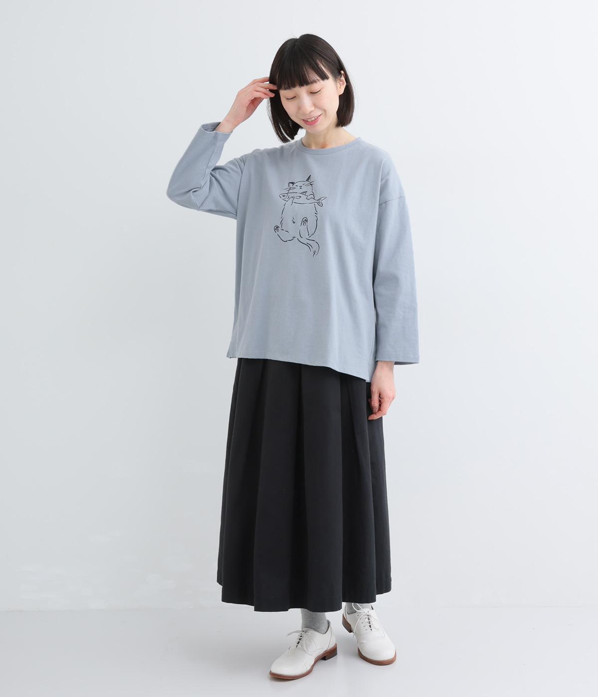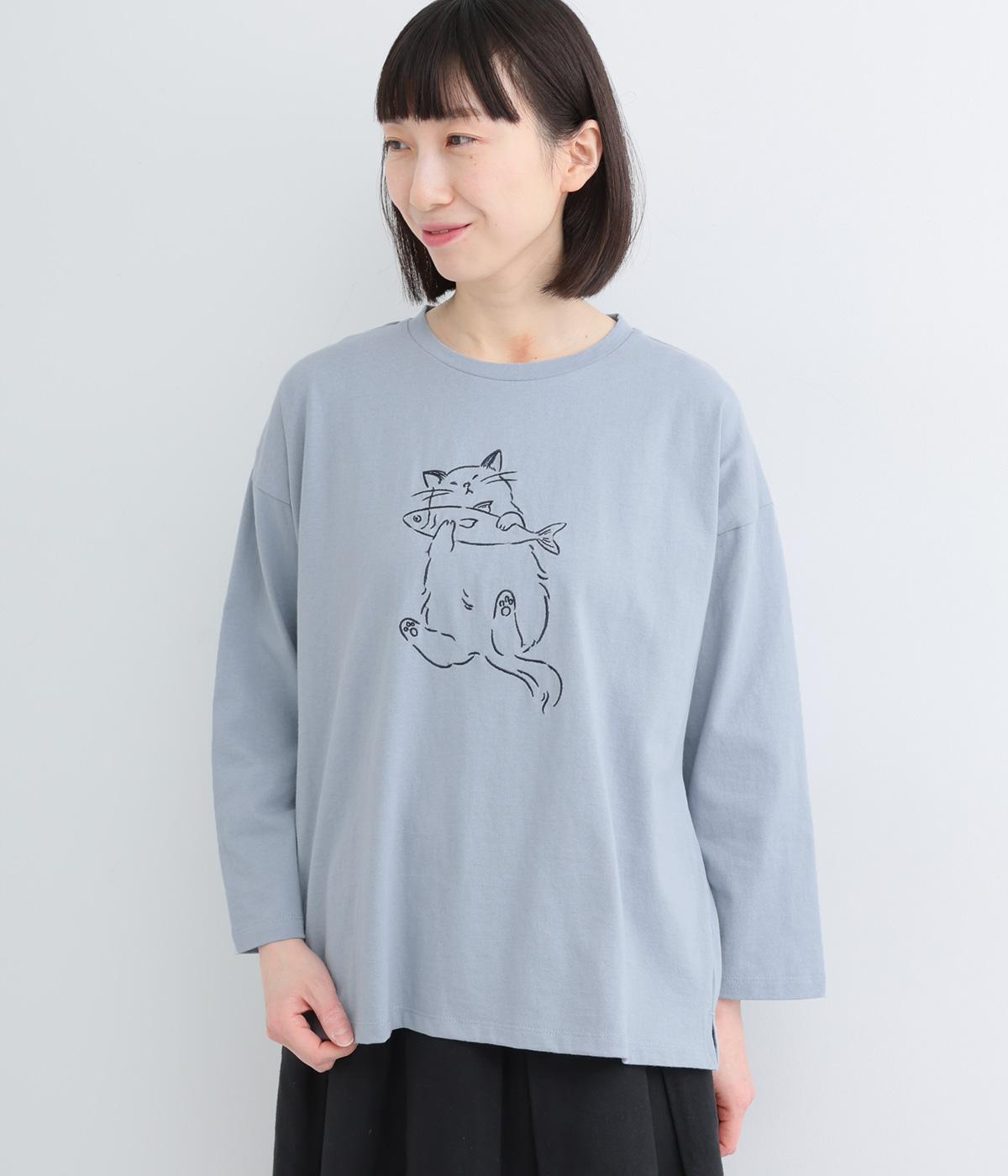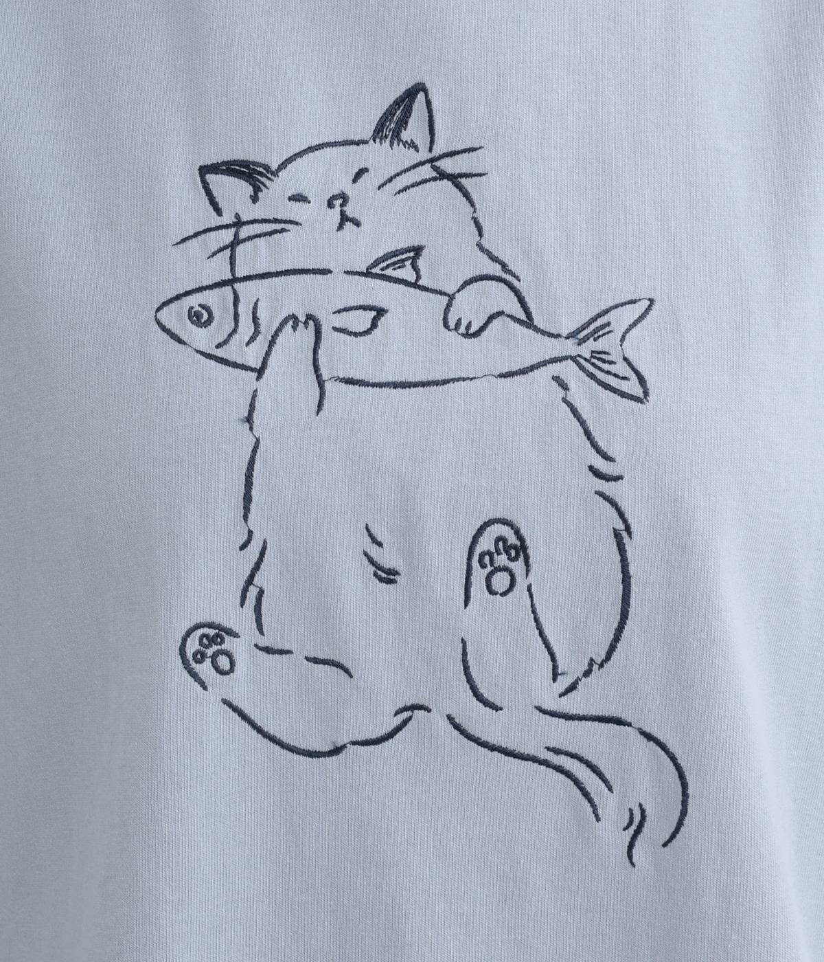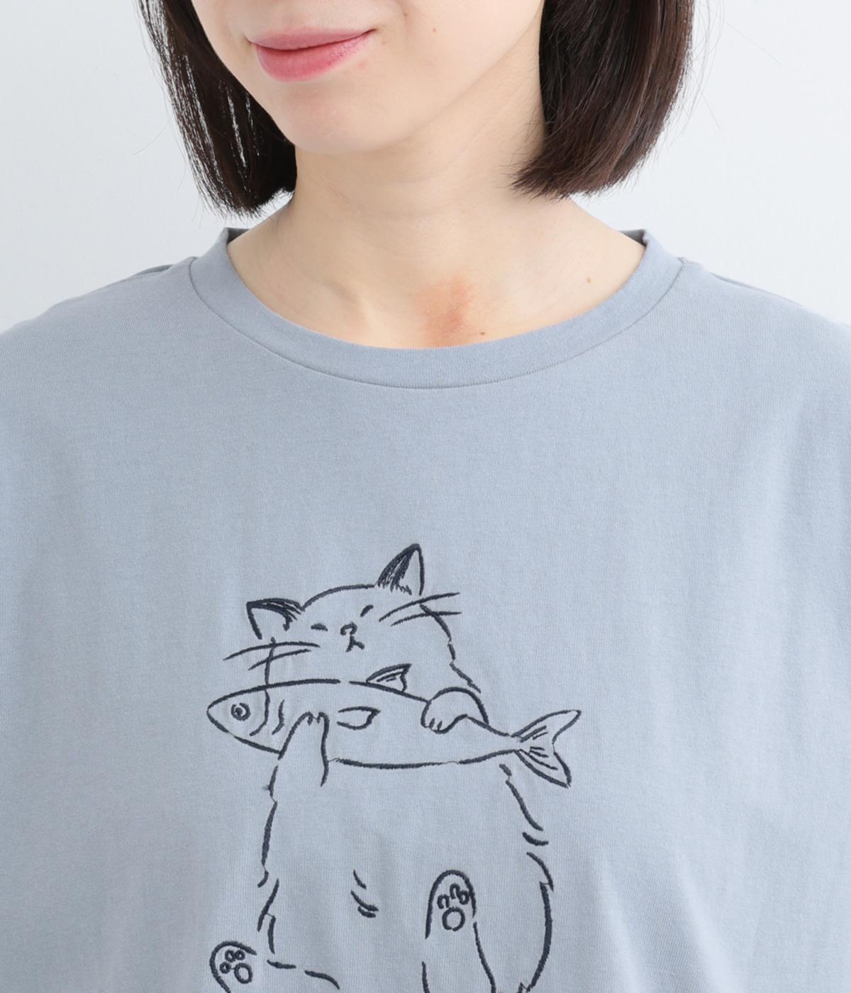 魚をつかんで離さない、味わい深い表情の猫を刺しゅうであしらいました。裾スリット入りで動きやすさも確保。洗いざらしのようなナチュラルな風合いと8分袖が、抜け感のあるこなれた雰囲気を醸します。
