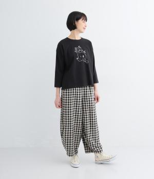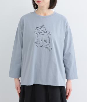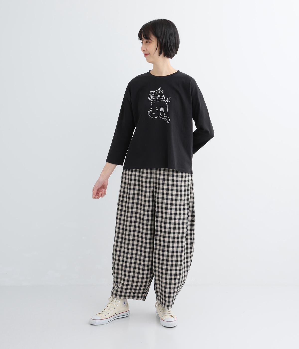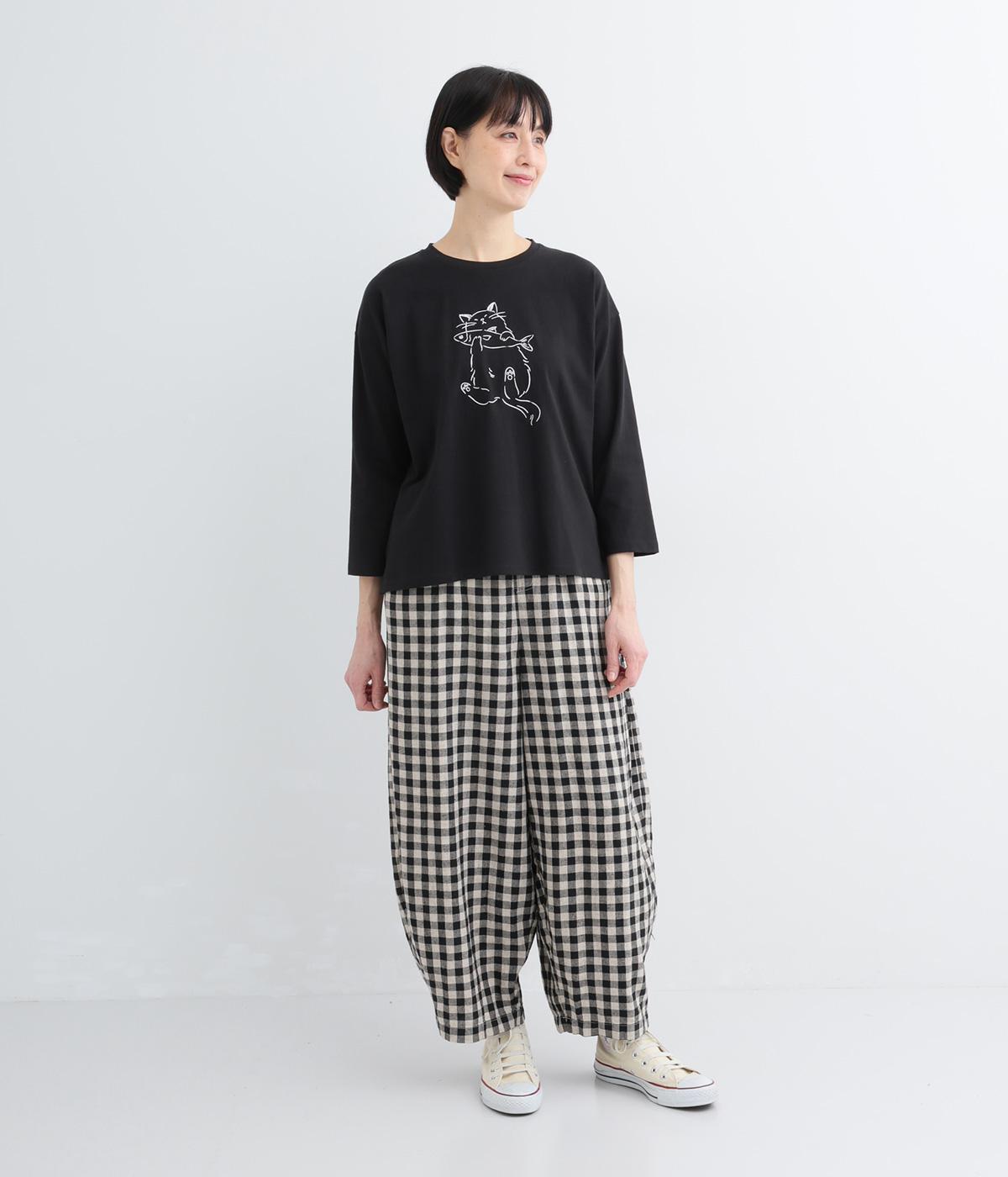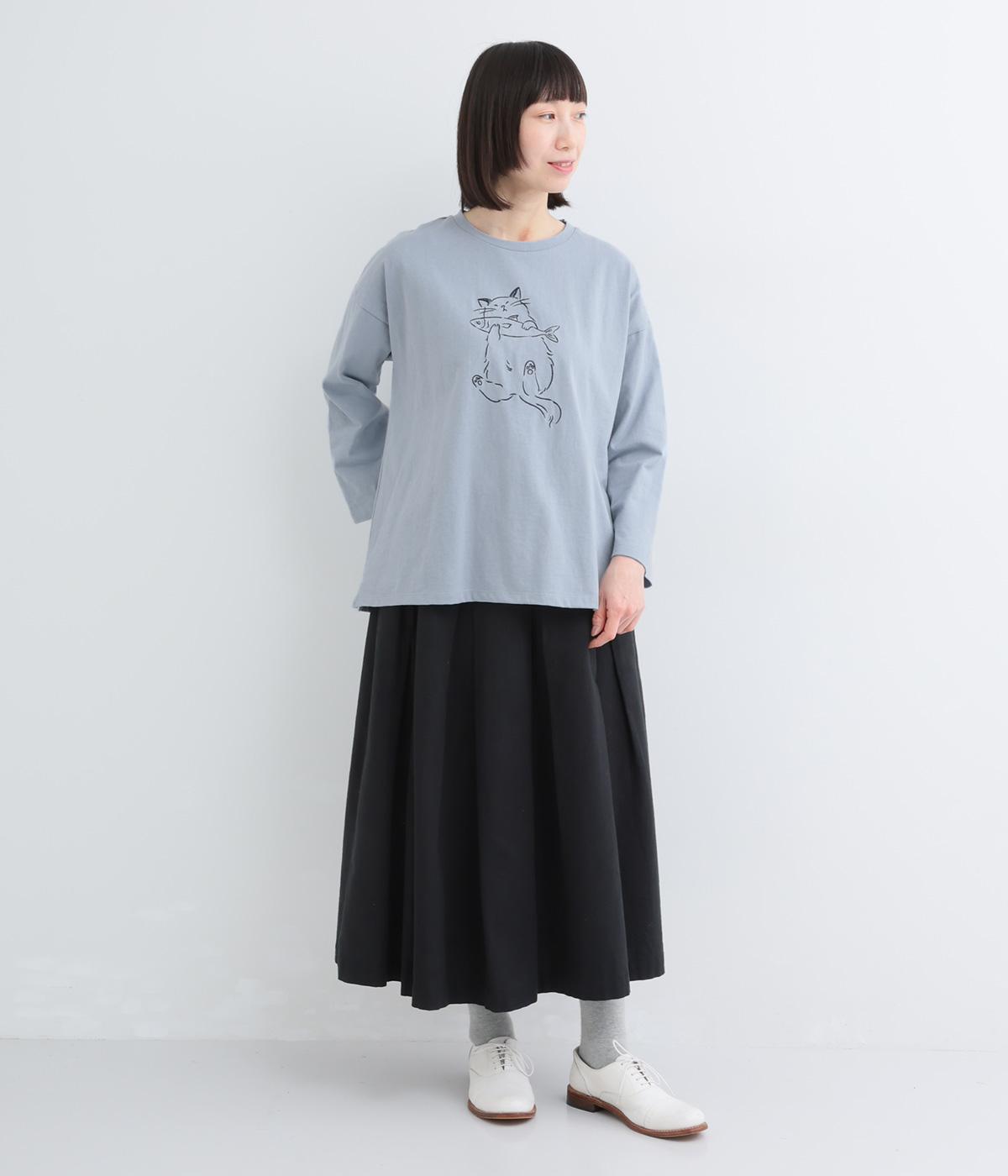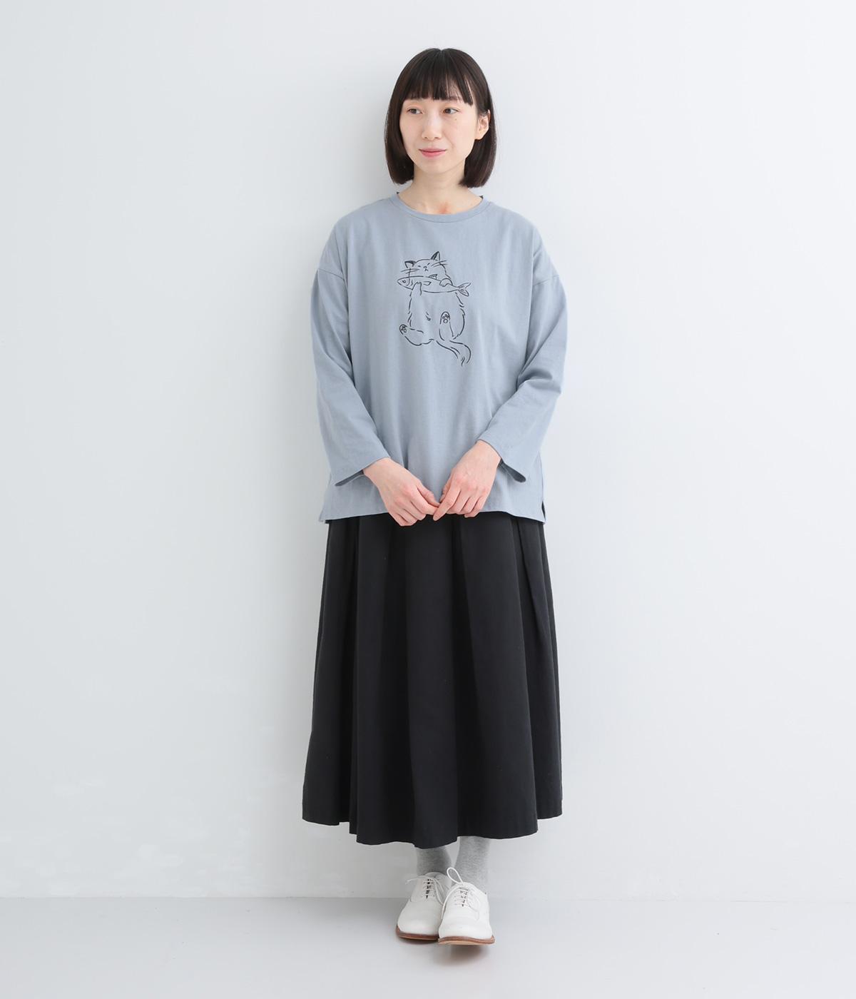 魚をつかんで離さない、味わい深い表情の猫を刺しゅうであしらいました。裾スリット入りで動きやすさも確保。洗いざらしのようなナチュラルな風合いと8分袖が、抜け感のあるこなれた雰囲気を醸します。