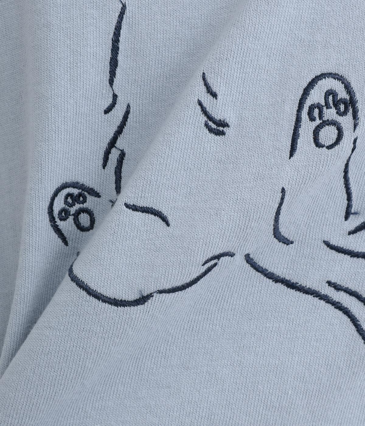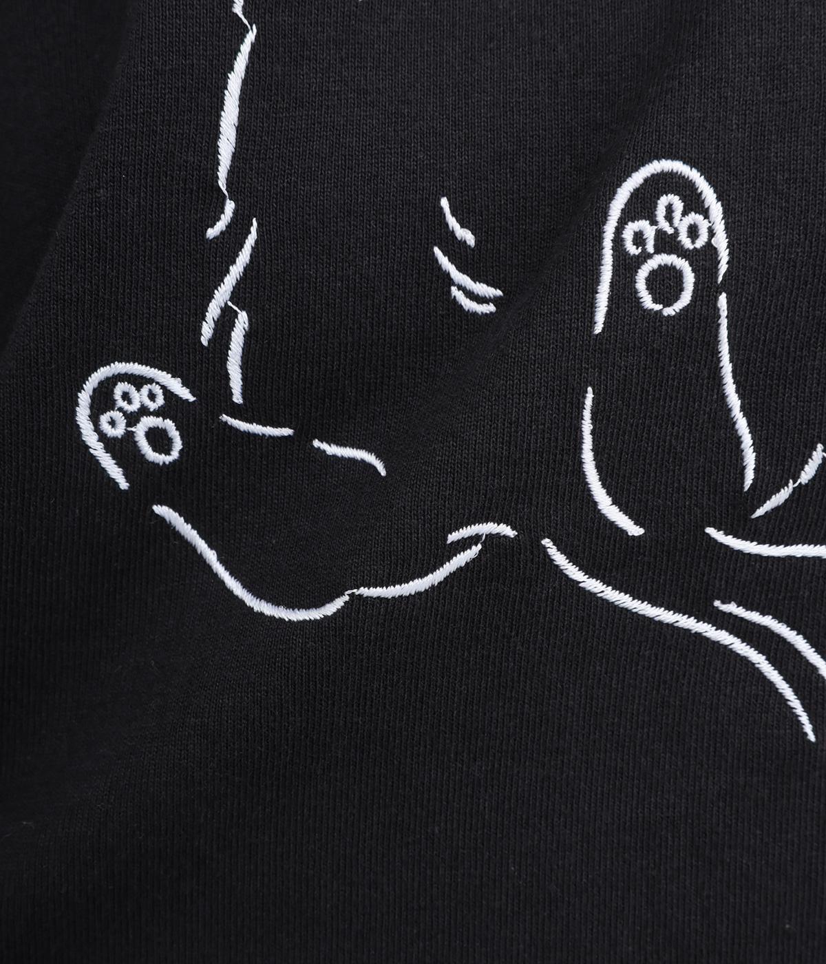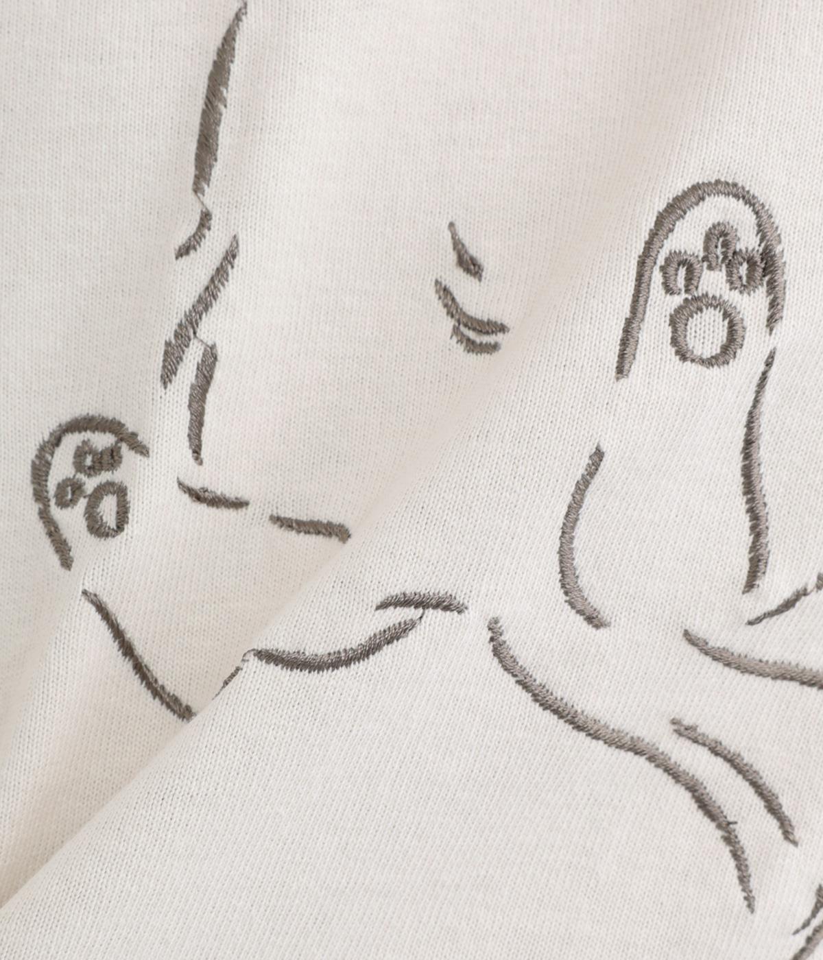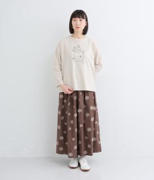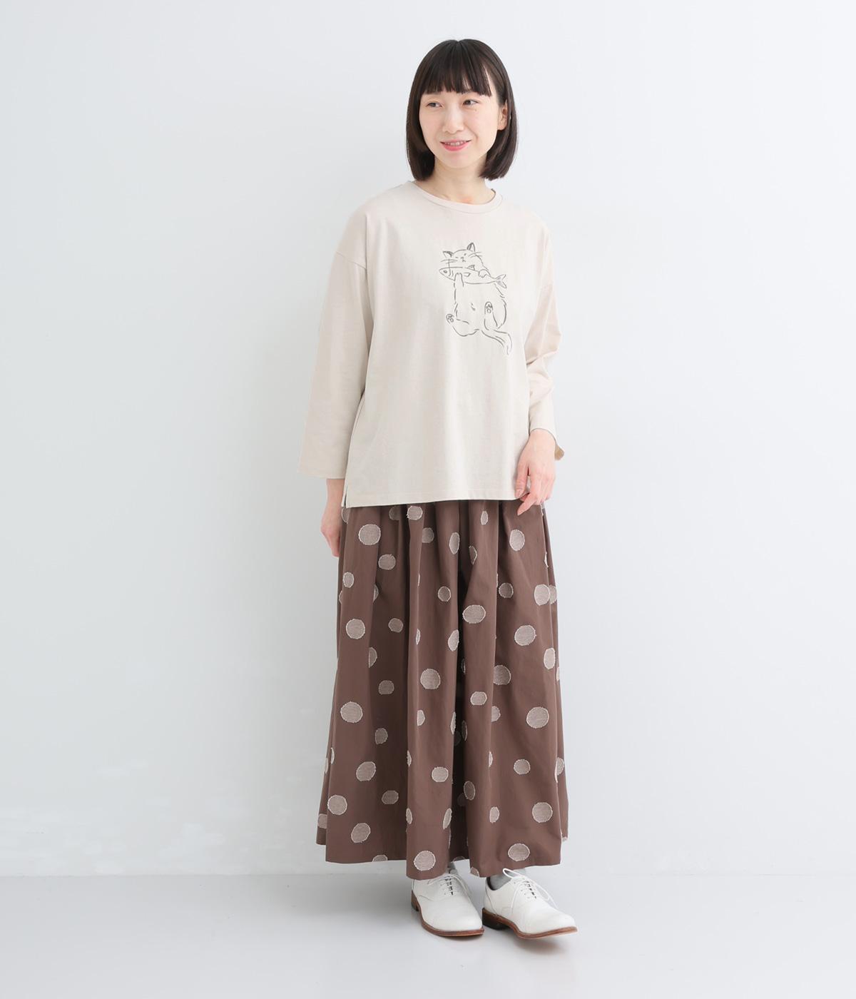 魚をつかんで離さない、味わい深い表情の猫を刺しゅうであしらいました。裾スリット入りで動きやすさも確保。洗いざらしのようなナチュラルな風合いと8分袖が、抜け感のあるこなれた雰囲気を醸します。