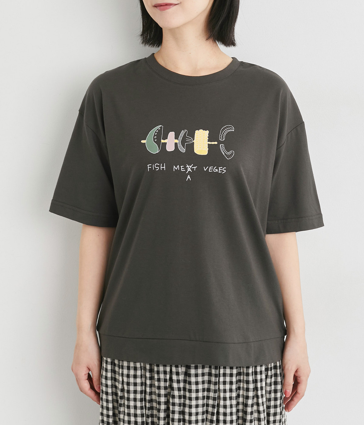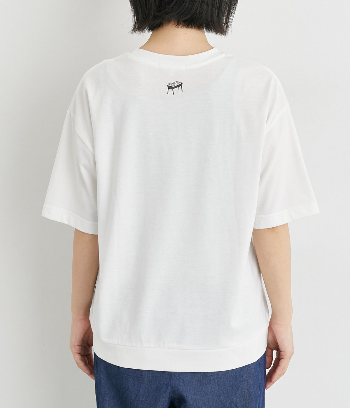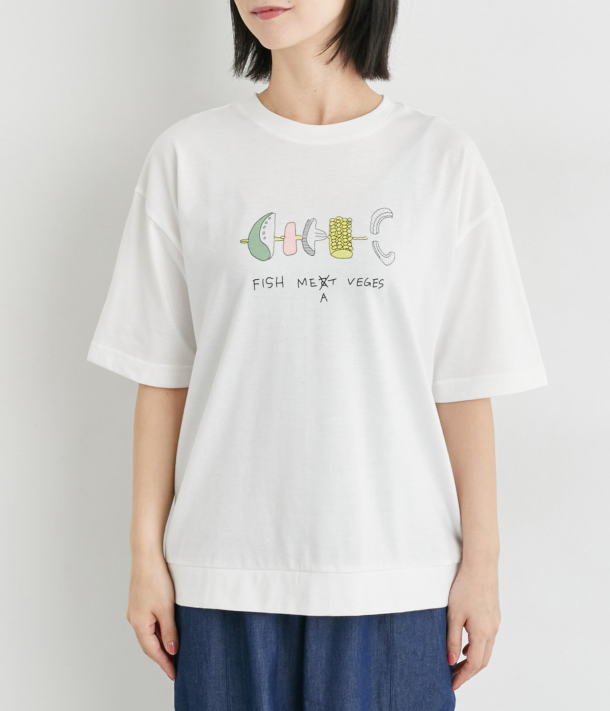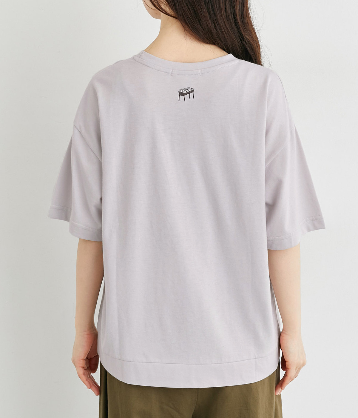 魚の形をした野菜とお肉が並んだBBQデザインのTシャツです。ゆったりめのサイズ感でユニセックスで楽しめる仕上がりに。後ろ襟ぐりにはBBQコンロのワンポイント刺しゅうを入れてアソビ心をきかせました。