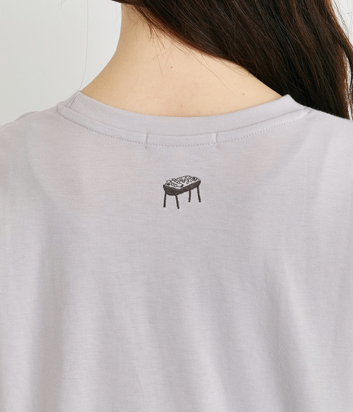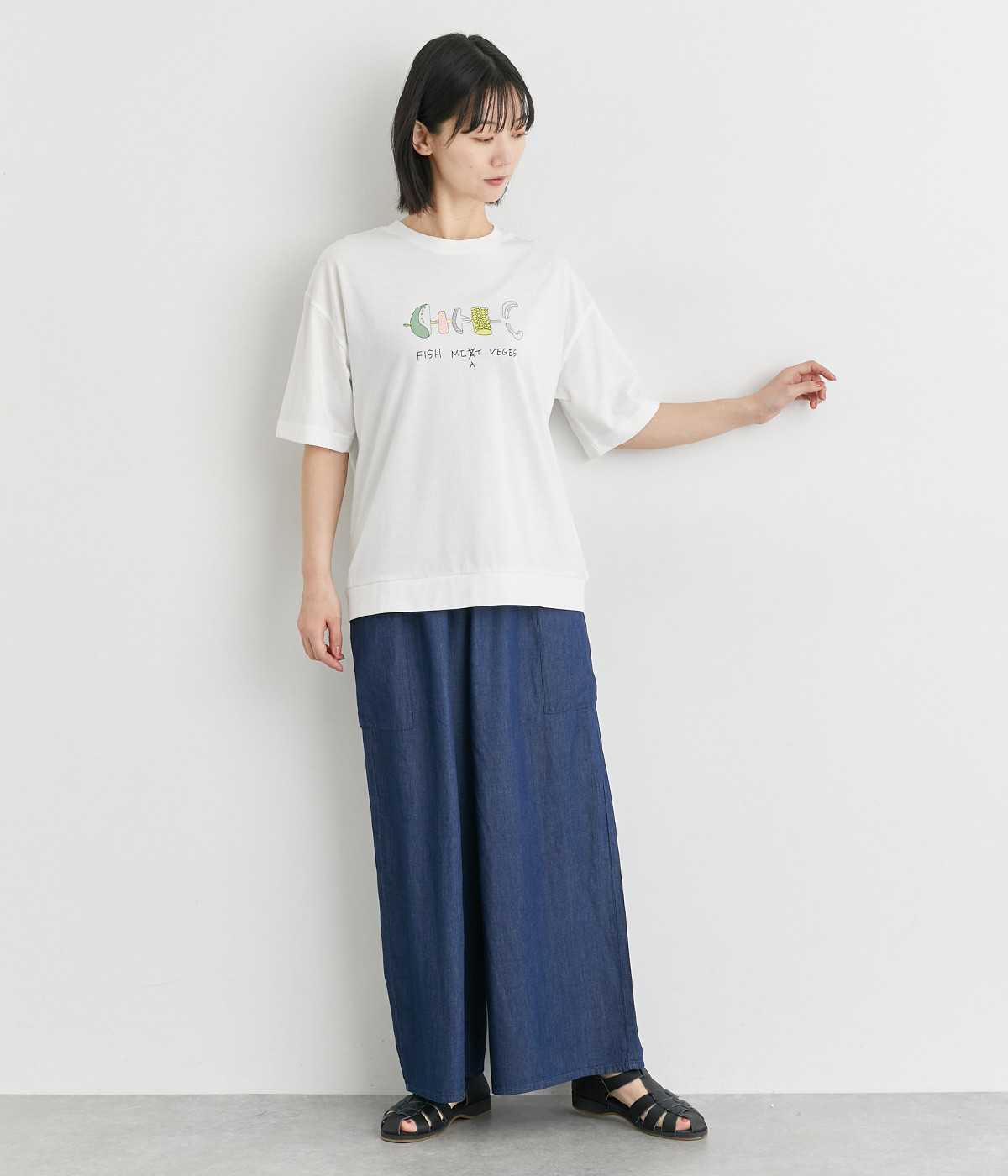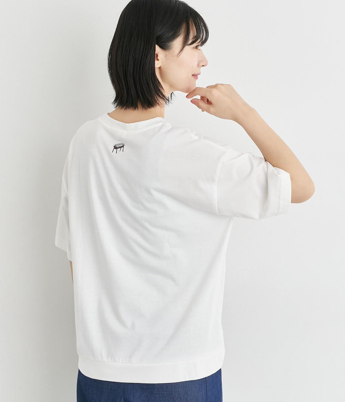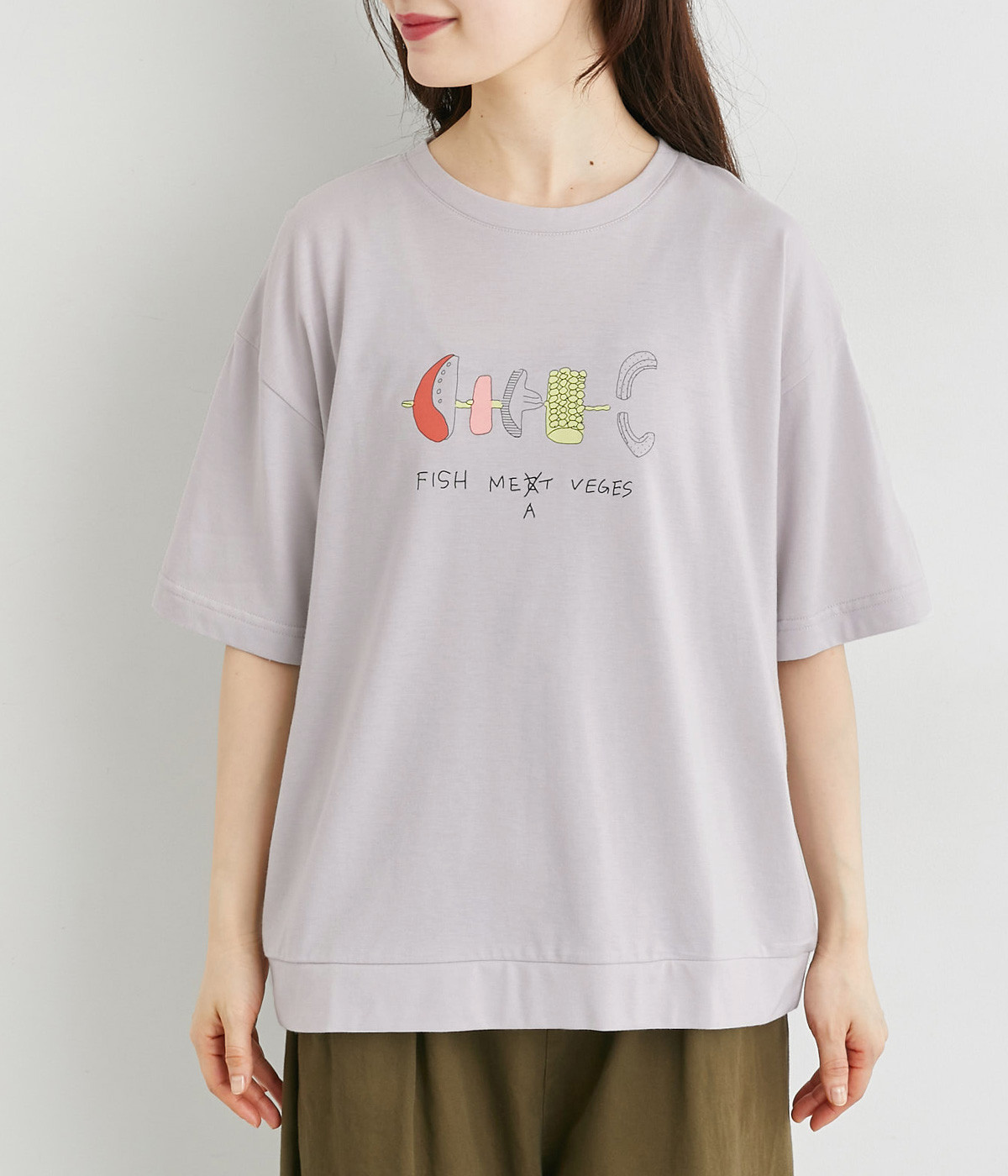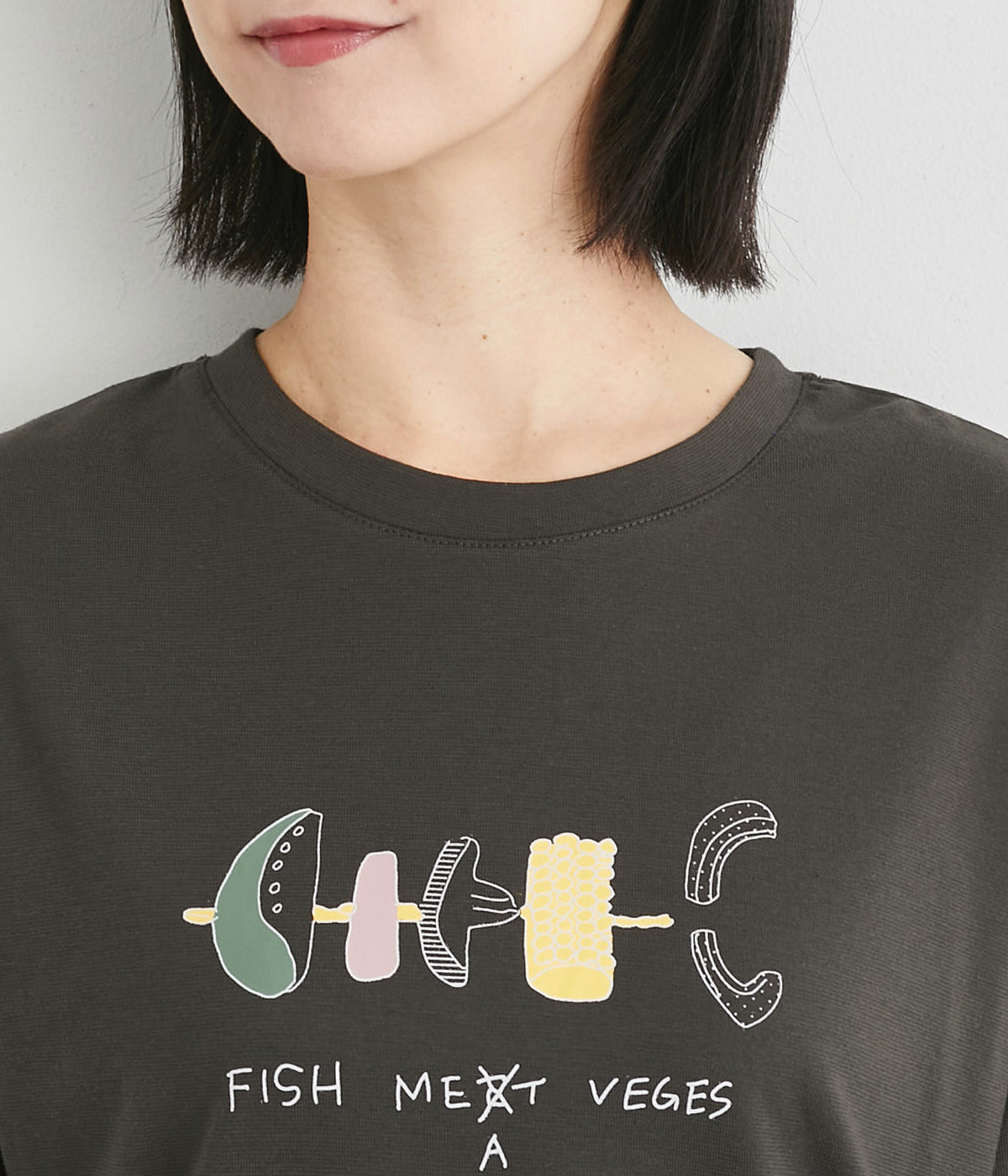 魚の形をした野菜とお肉が並んだBBQデザインのTシャツです。ゆったりめのサイズ感でユニセックスで楽しめる仕上がりに。後ろ襟ぐりにはBBQコンロのワンポイント刺しゅうを入れてアソビ心をきかせました。
