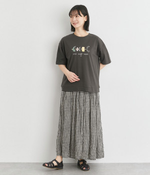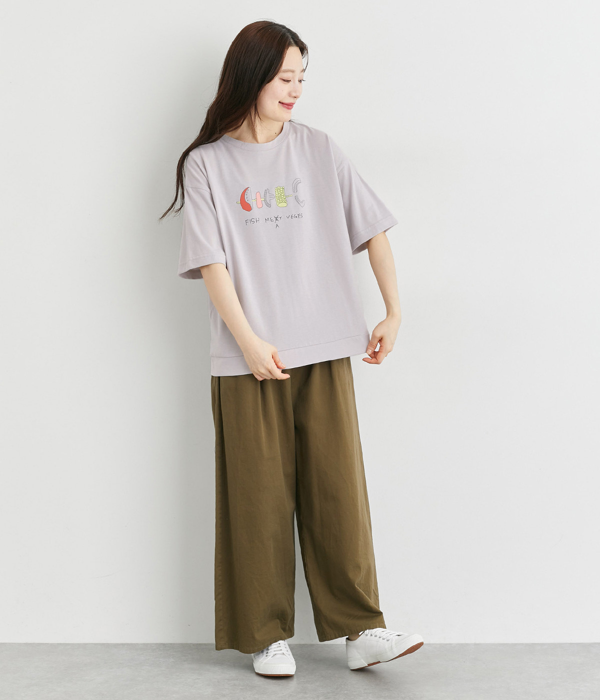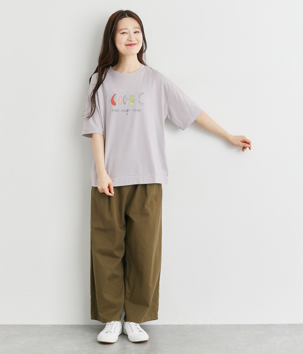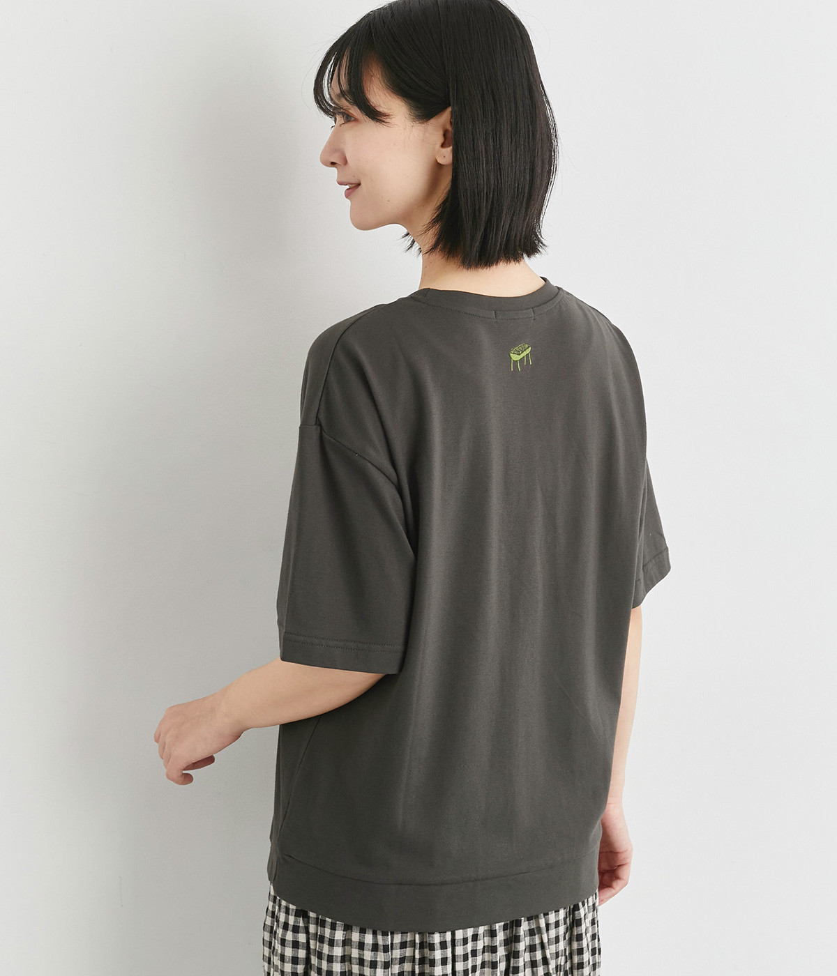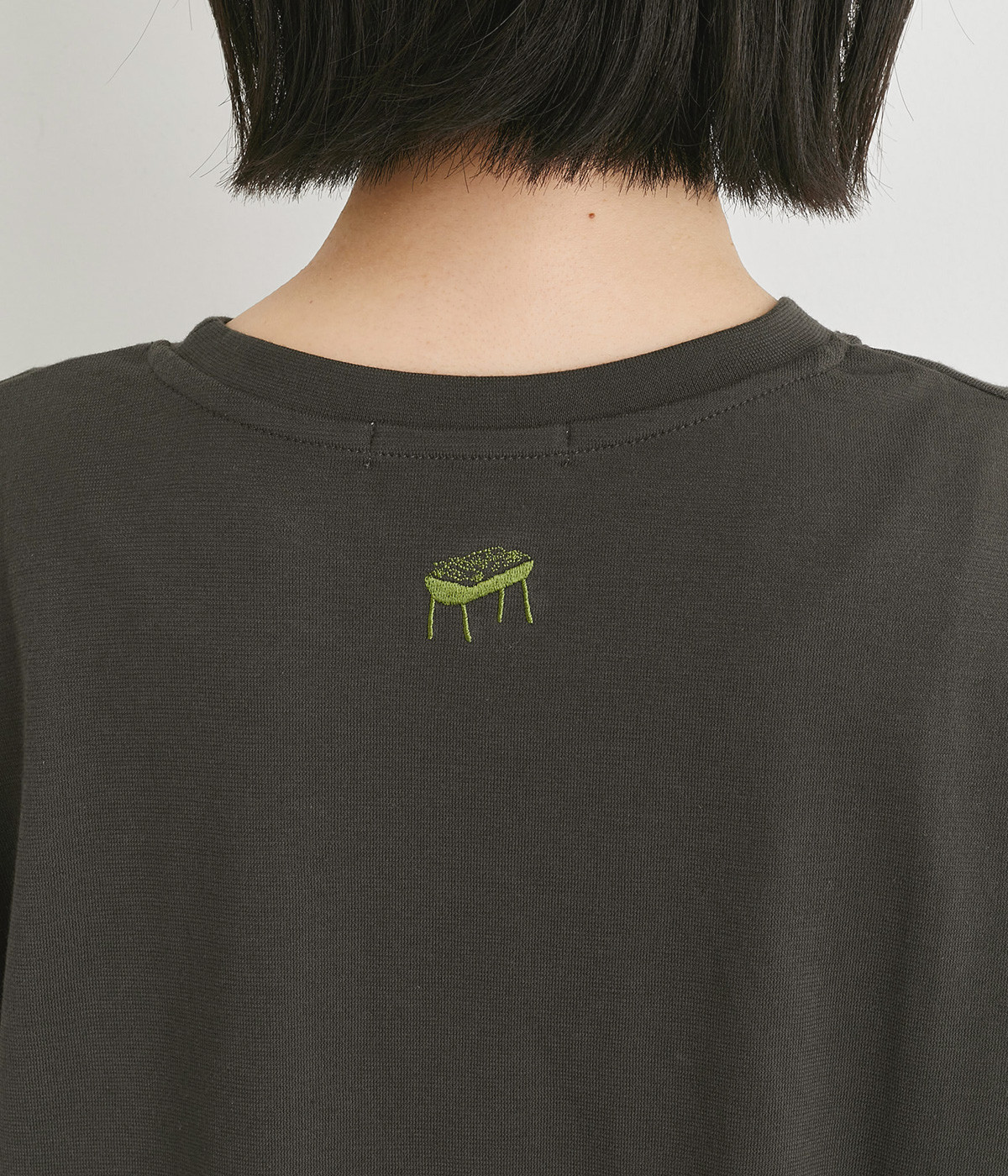 魚の形をした野菜とお肉が並んだBBQデザインのTシャツです。ゆったりめのサイズ感でユニセックスで楽しめる仕上がりに。後ろ襟ぐりにはBBQコンロのワンポイント刺しゅうを入れてアソビ心をきかせました。