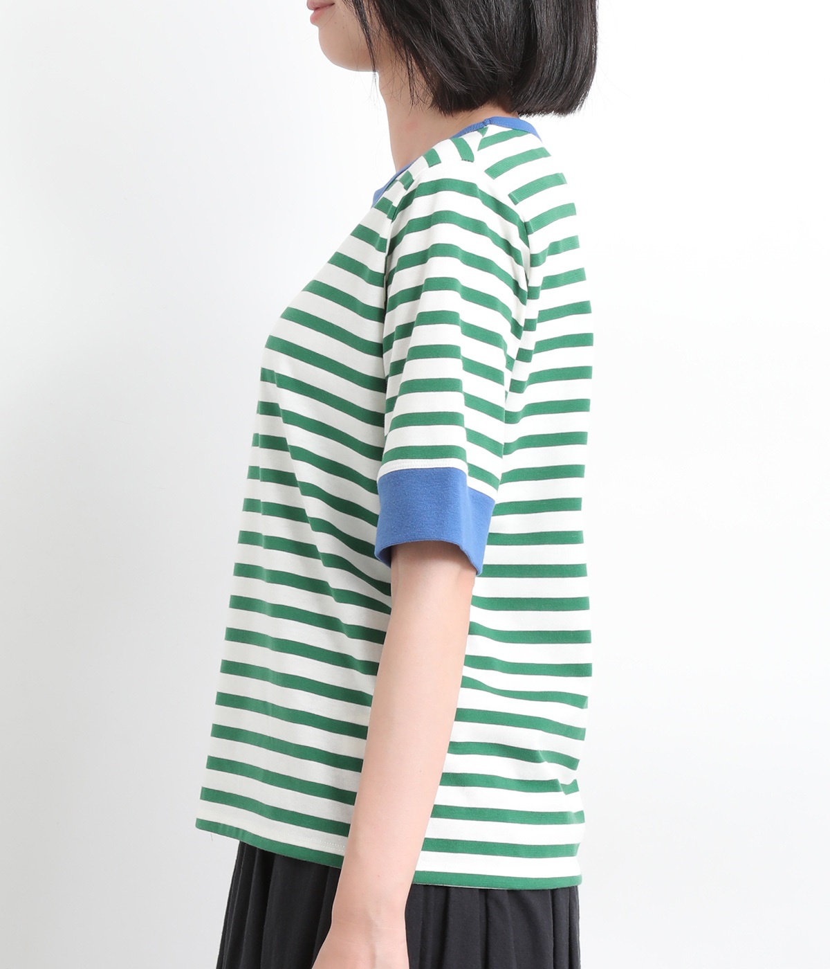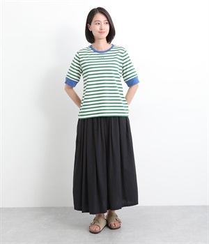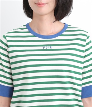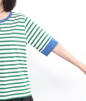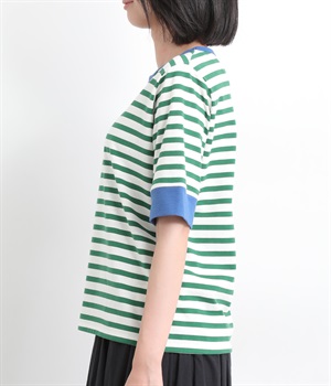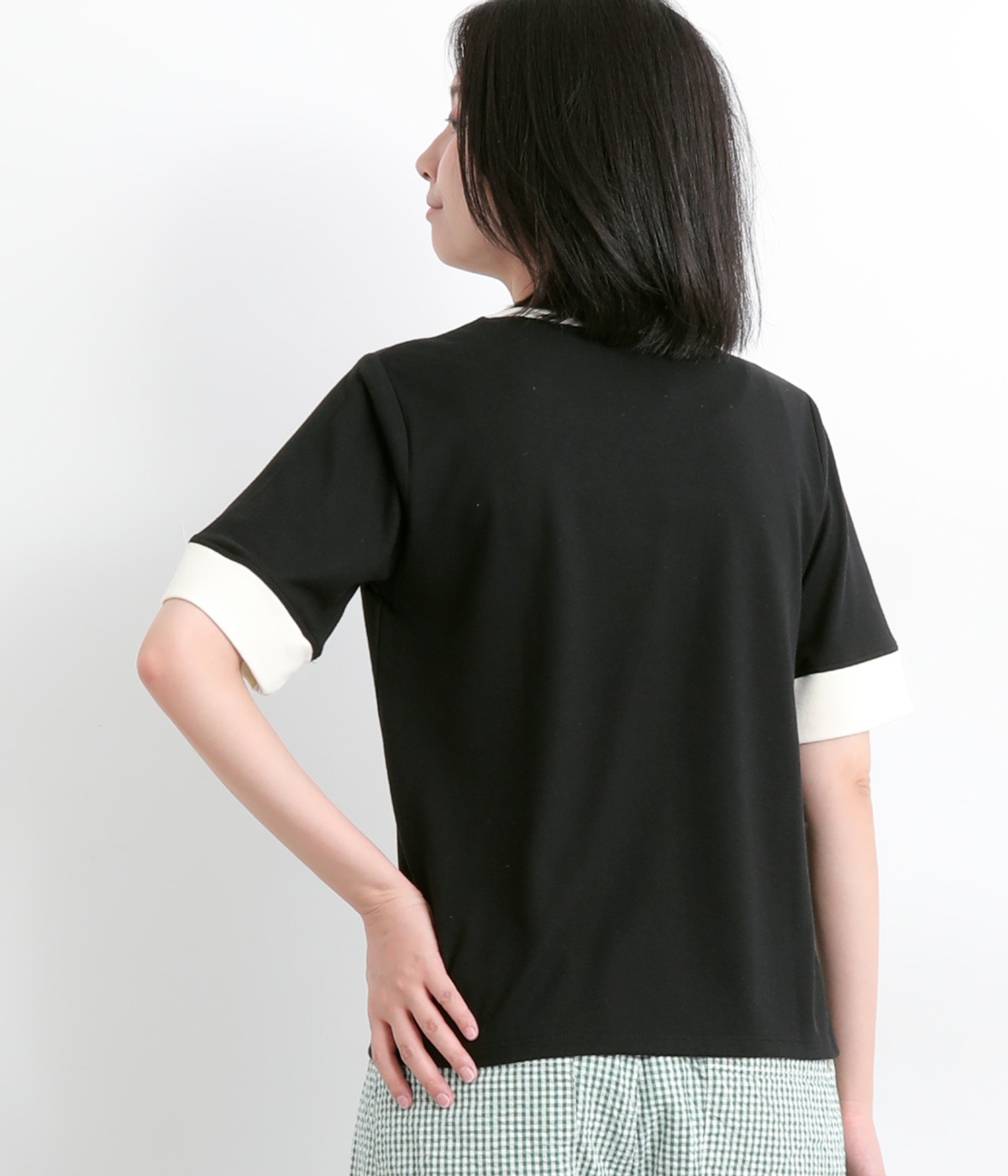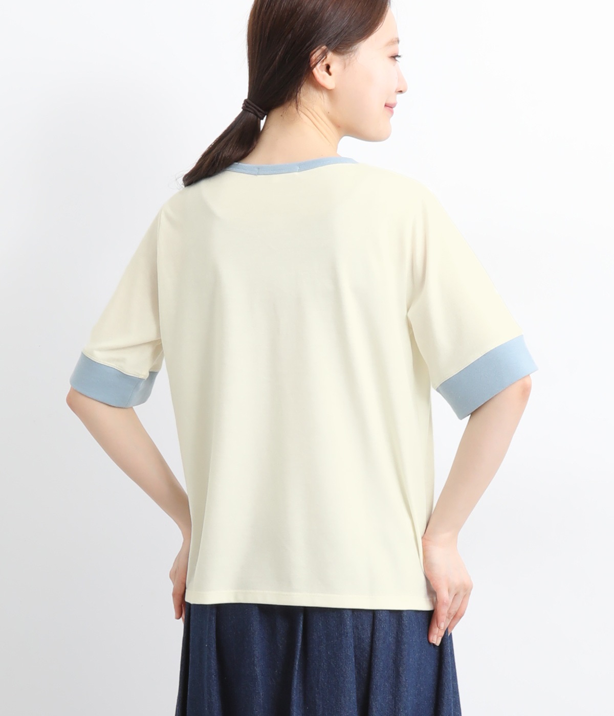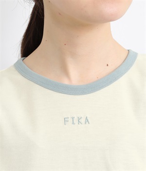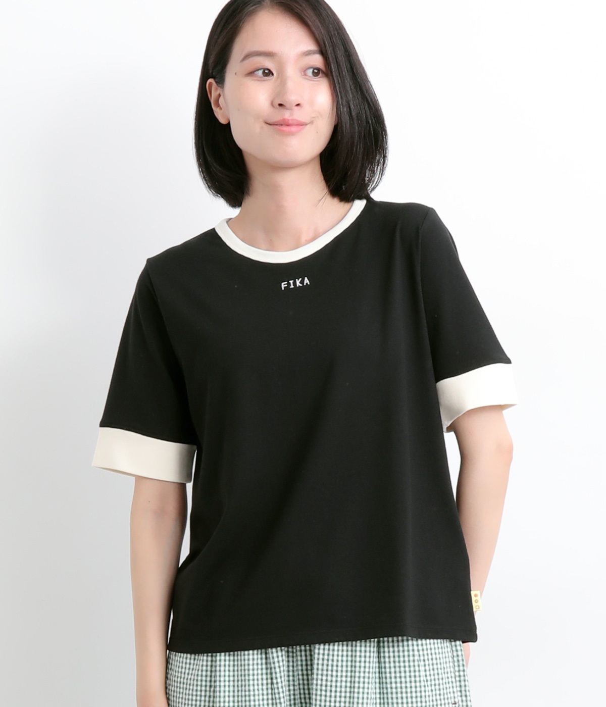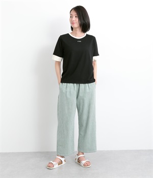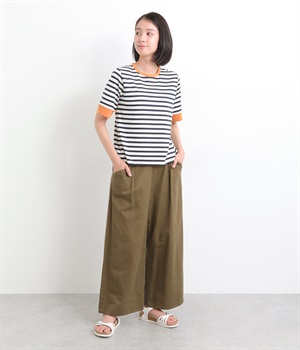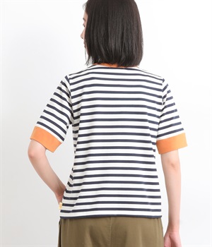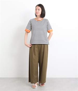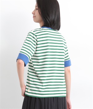 襟ぐりと袖口の配色デザインがきいているリンガーTシャツです。色を合わせた胸元のワンポイント刺しゅうも◎。ボックスシルエットでカジュアルに着やすく、どこかレトロ感のあるカラーリングでお洒落な着こなしに。