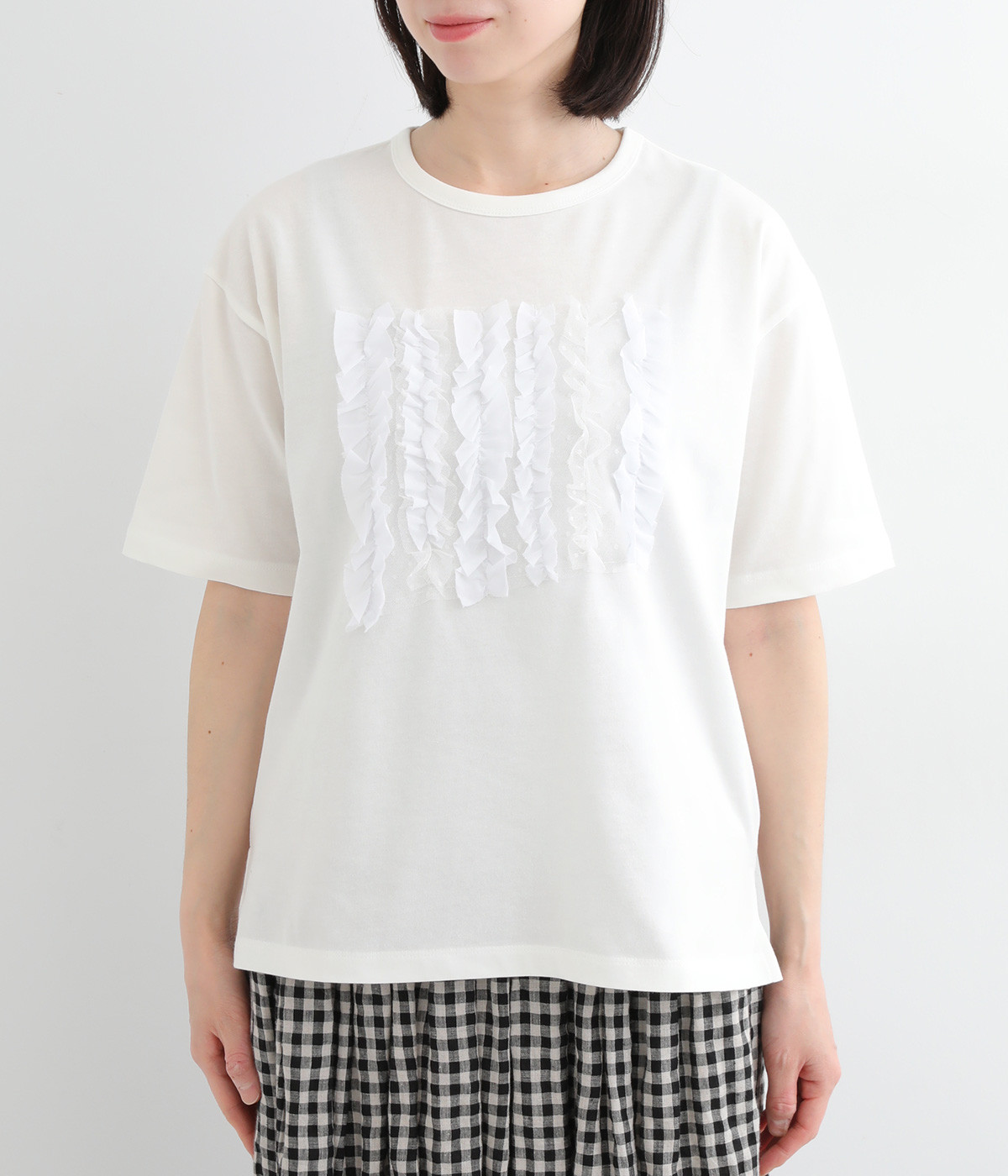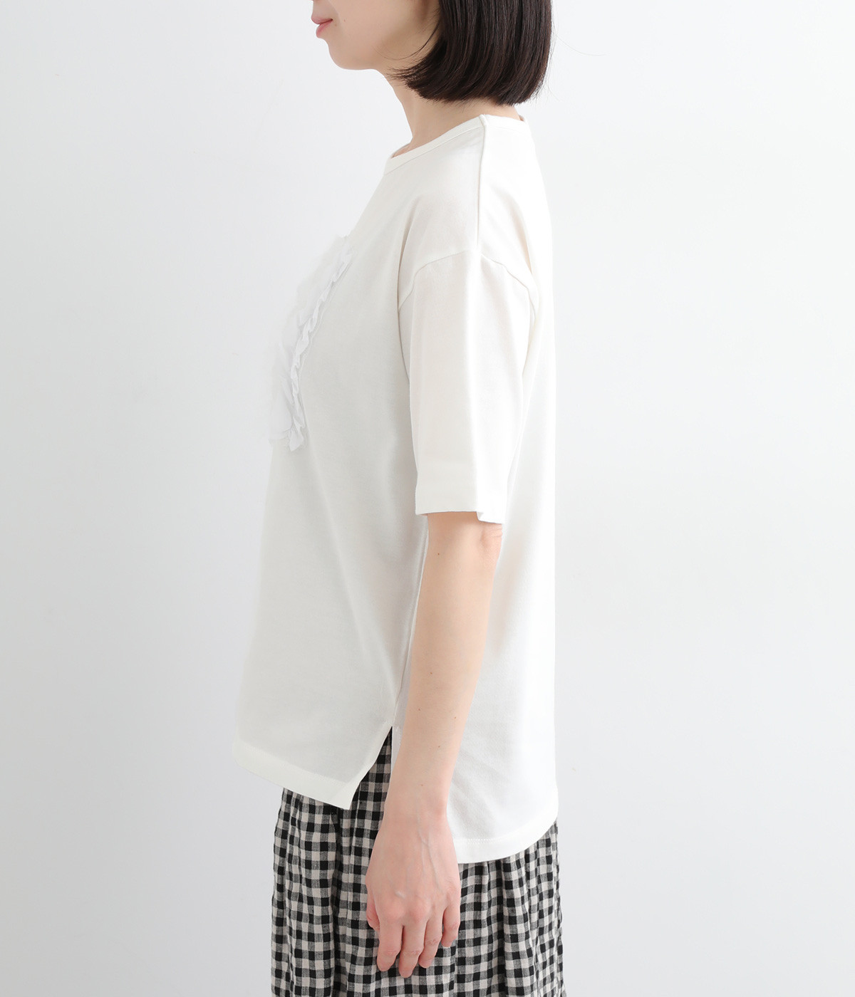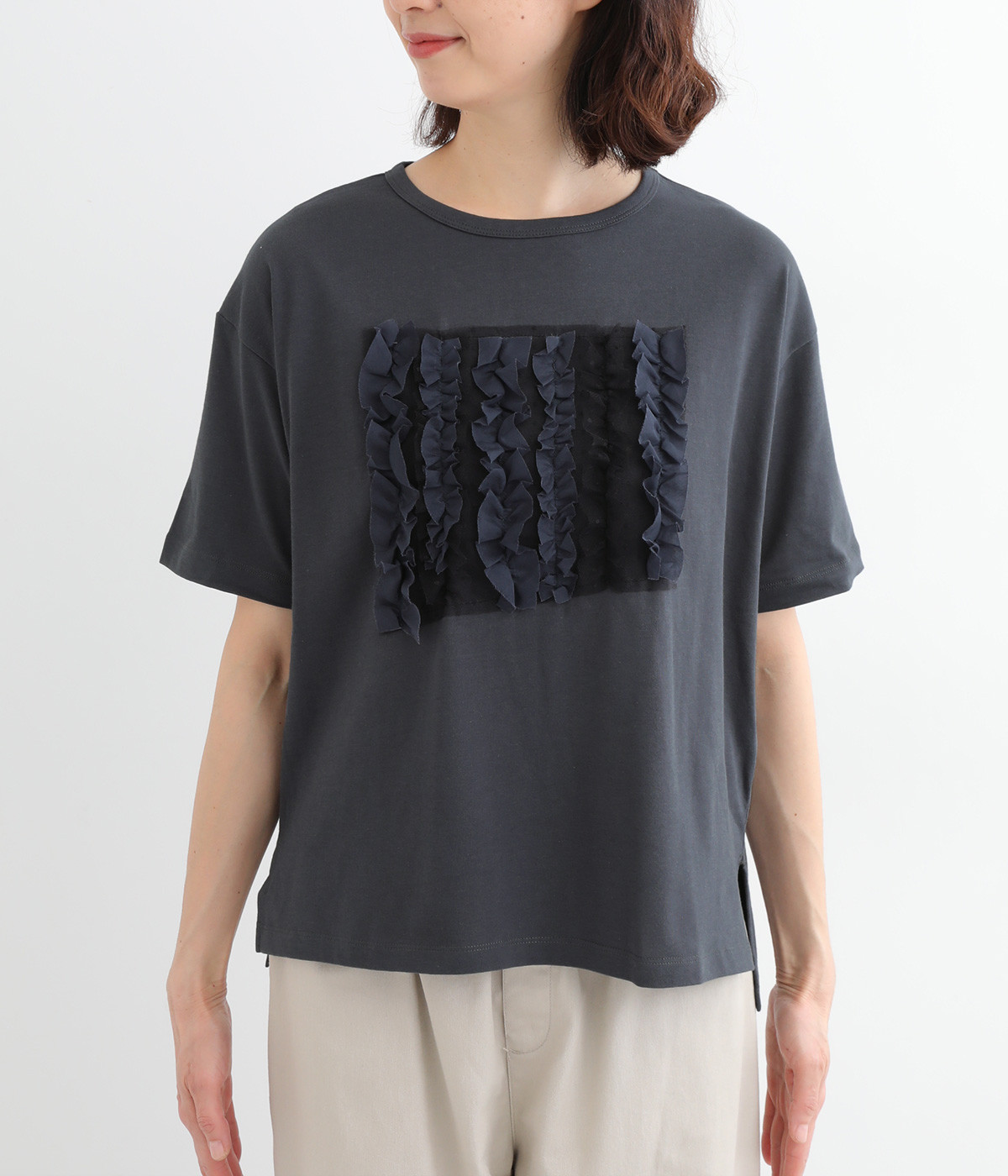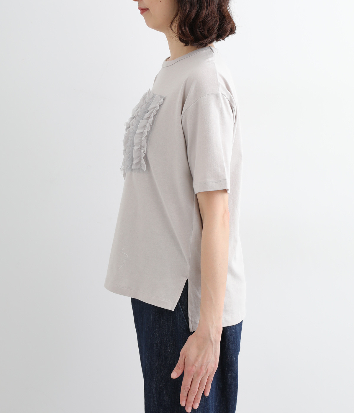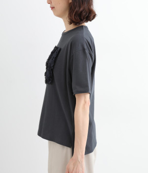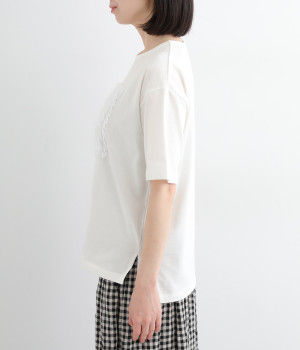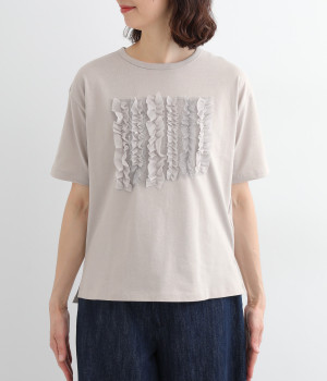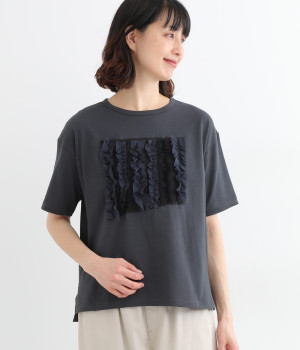 フロントに異素材のフリルを縫いつけたTシャツです。Tシャツを主役に、シンプルにパンツとの合わせでも遊び心のきいたスタイリングに仕上がります。サイドにさりげなく入ったスリットでこなれ感もプラス。