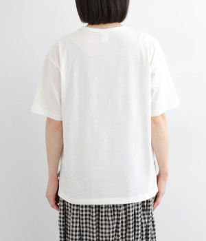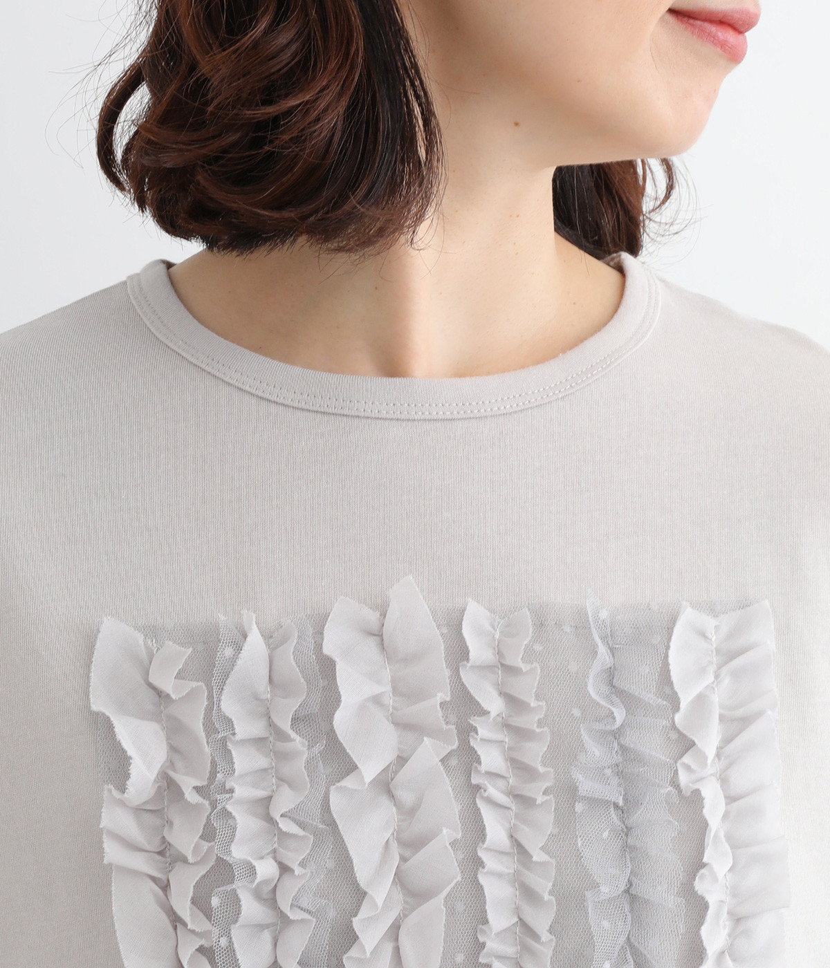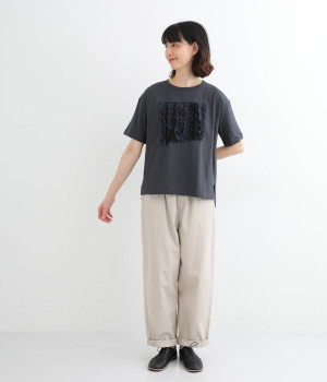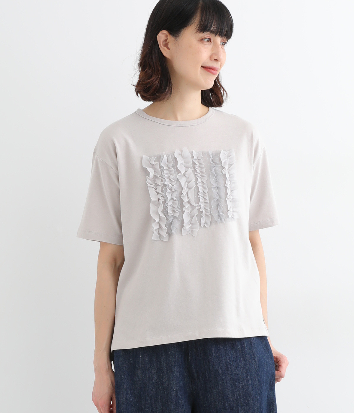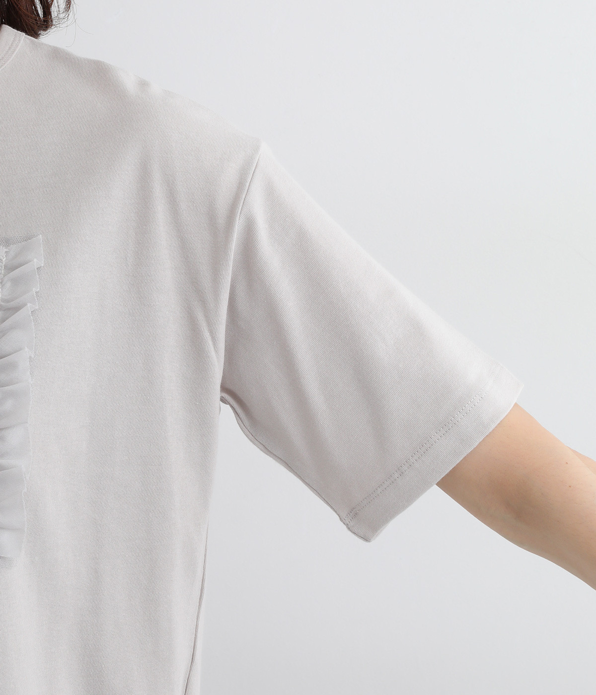 フロントに異素材のフリルを縫いつけたTシャツです。Tシャツを主役に、シンプルにパンツとの合わせでも遊び心のきいたスタイリングに仕上がります。サイドにさりげなく入ったスリットでこなれ感もプラス。