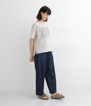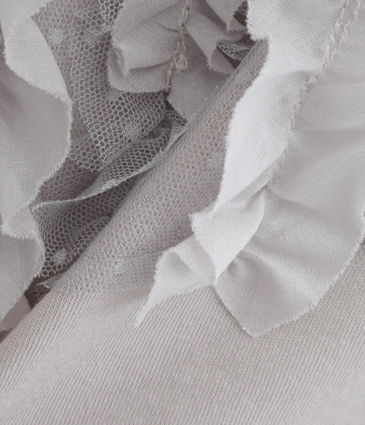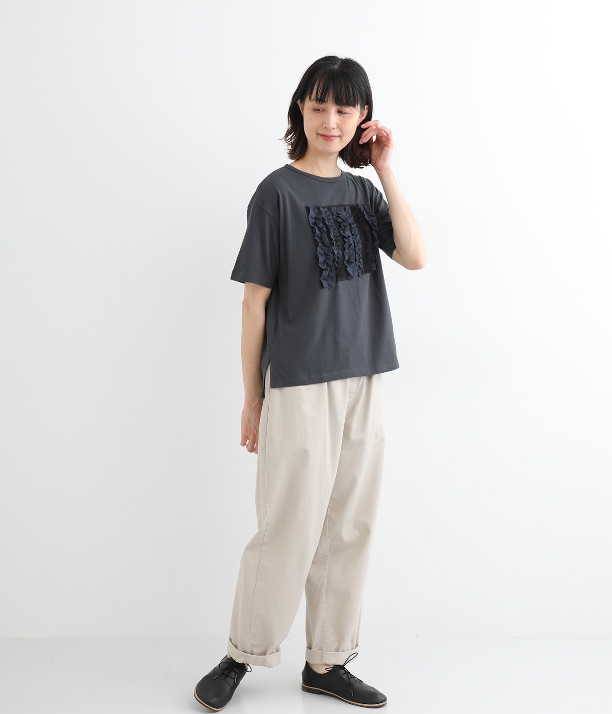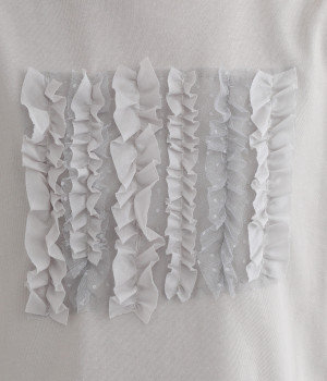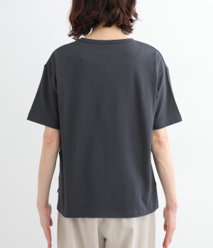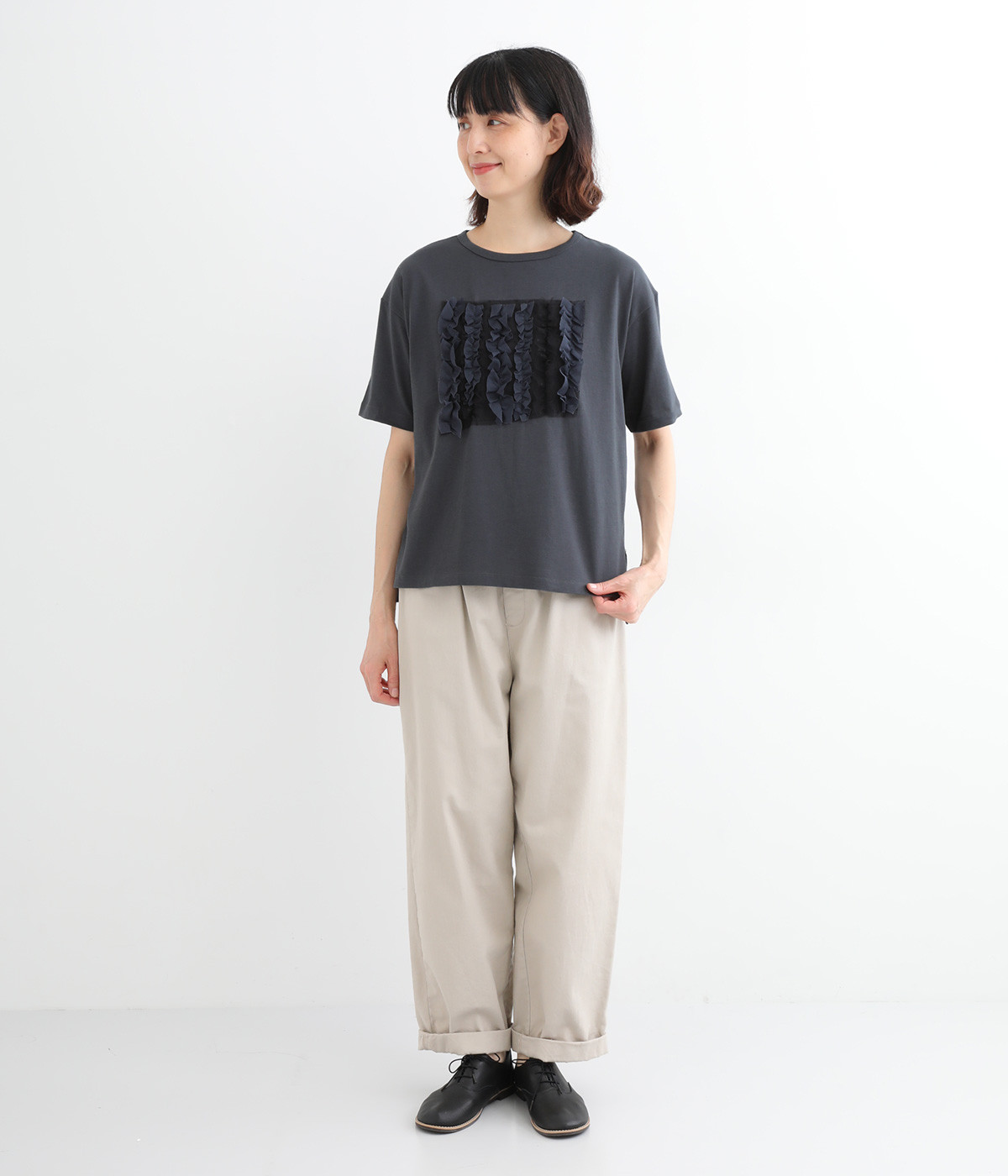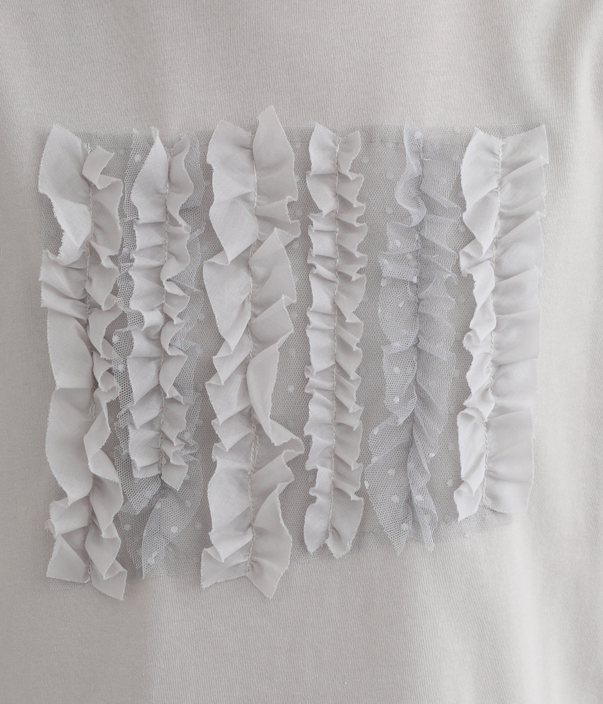 フロントに異素材のフリルを縫いつけたTシャツです。Tシャツを主役に、シンプルにパンツとの合わせでも遊び心のきいたスタイリングに仕上がります。サイドにさりげなく入ったスリットでこなれ感もプラス。