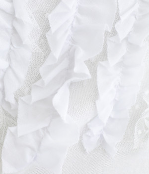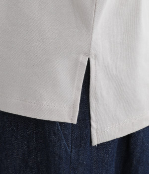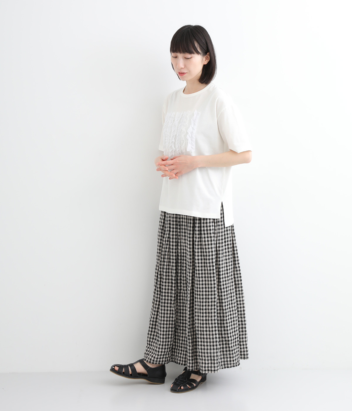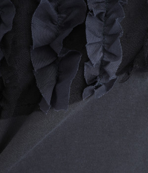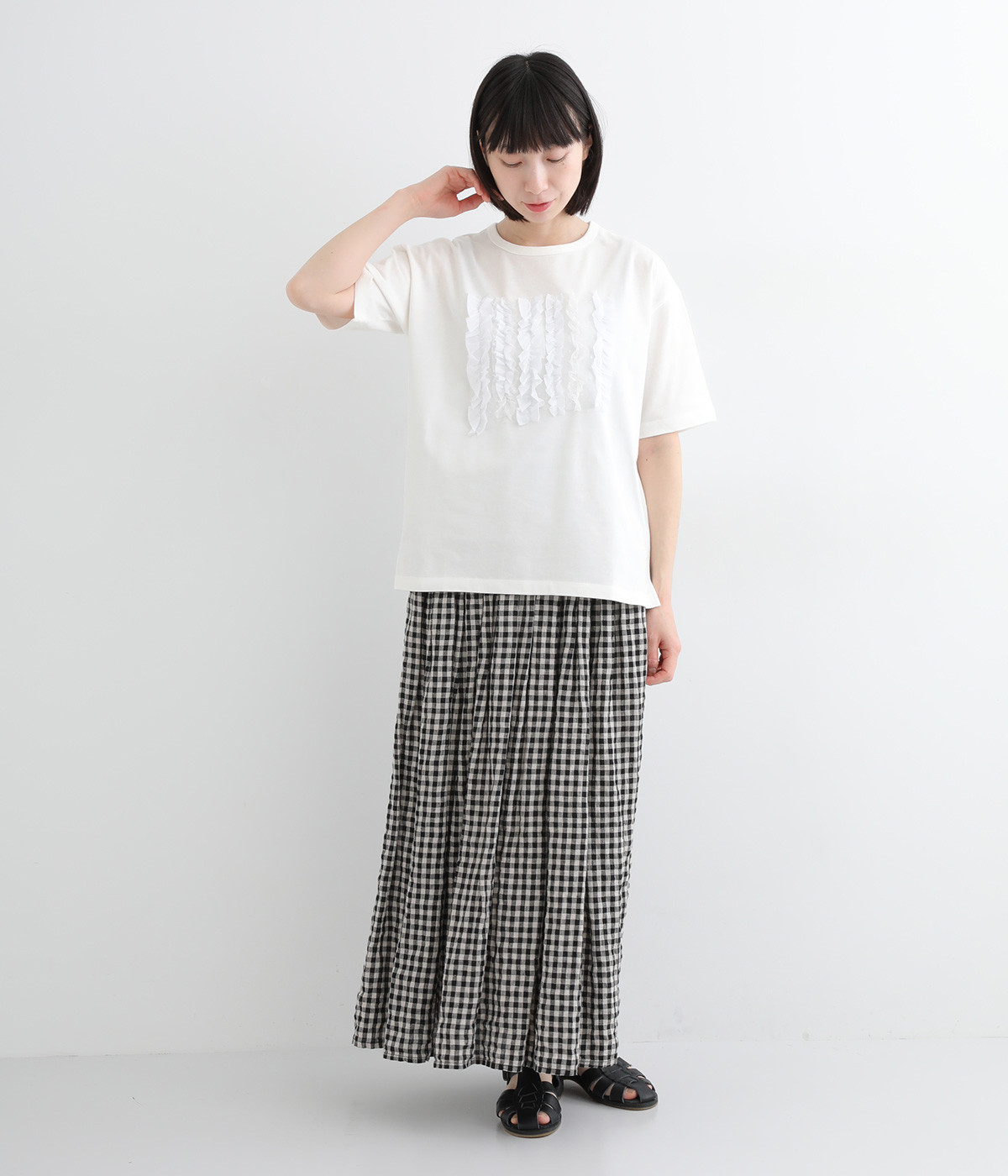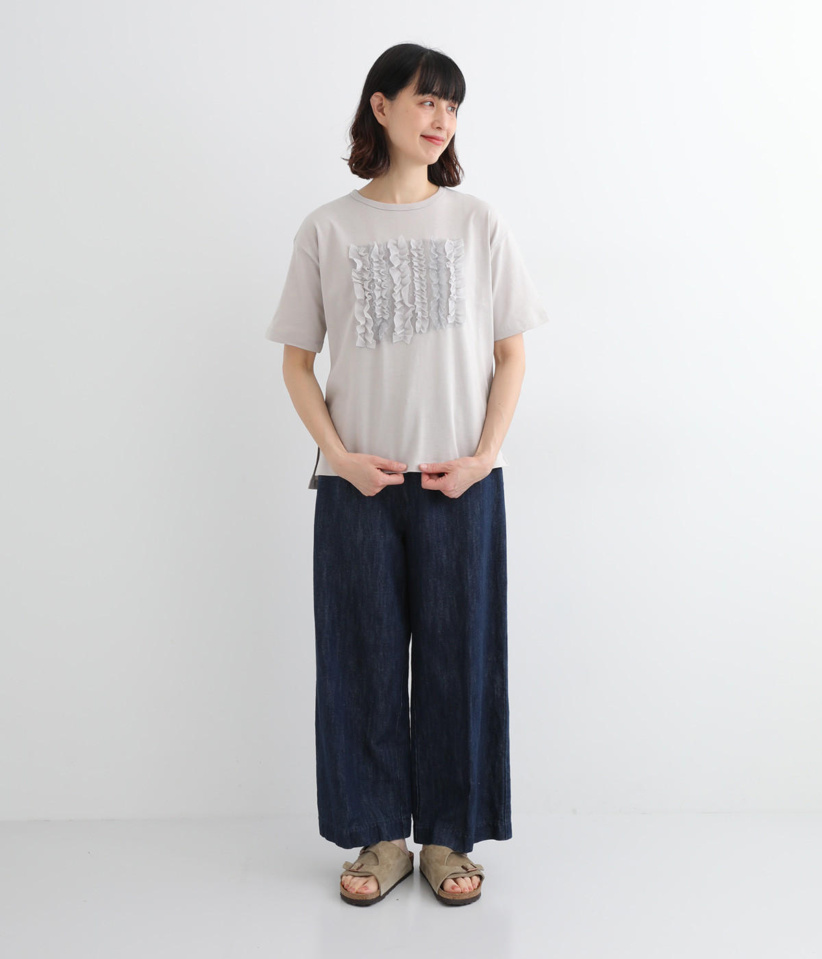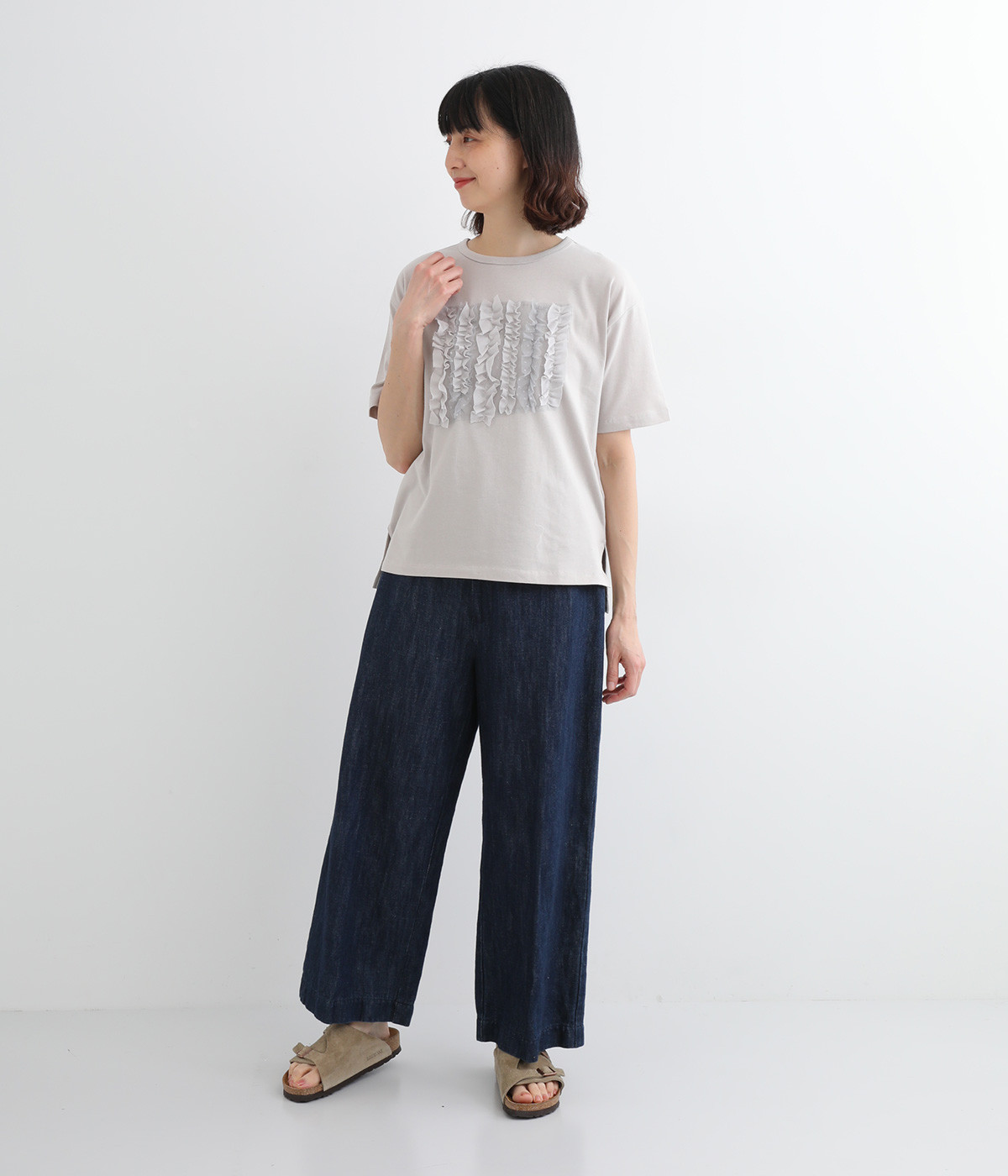 フロントに異素材のフリルを縫いつけたTシャツです。Tシャツを主役に、シンプルにパンツとの合わせでも遊び心のきいたスタイリングに仕上がります。サイドにさりげなく入ったスリットでこなれ感もプラス。