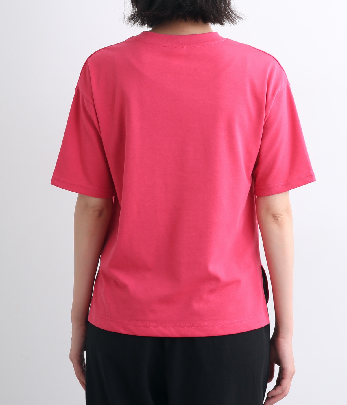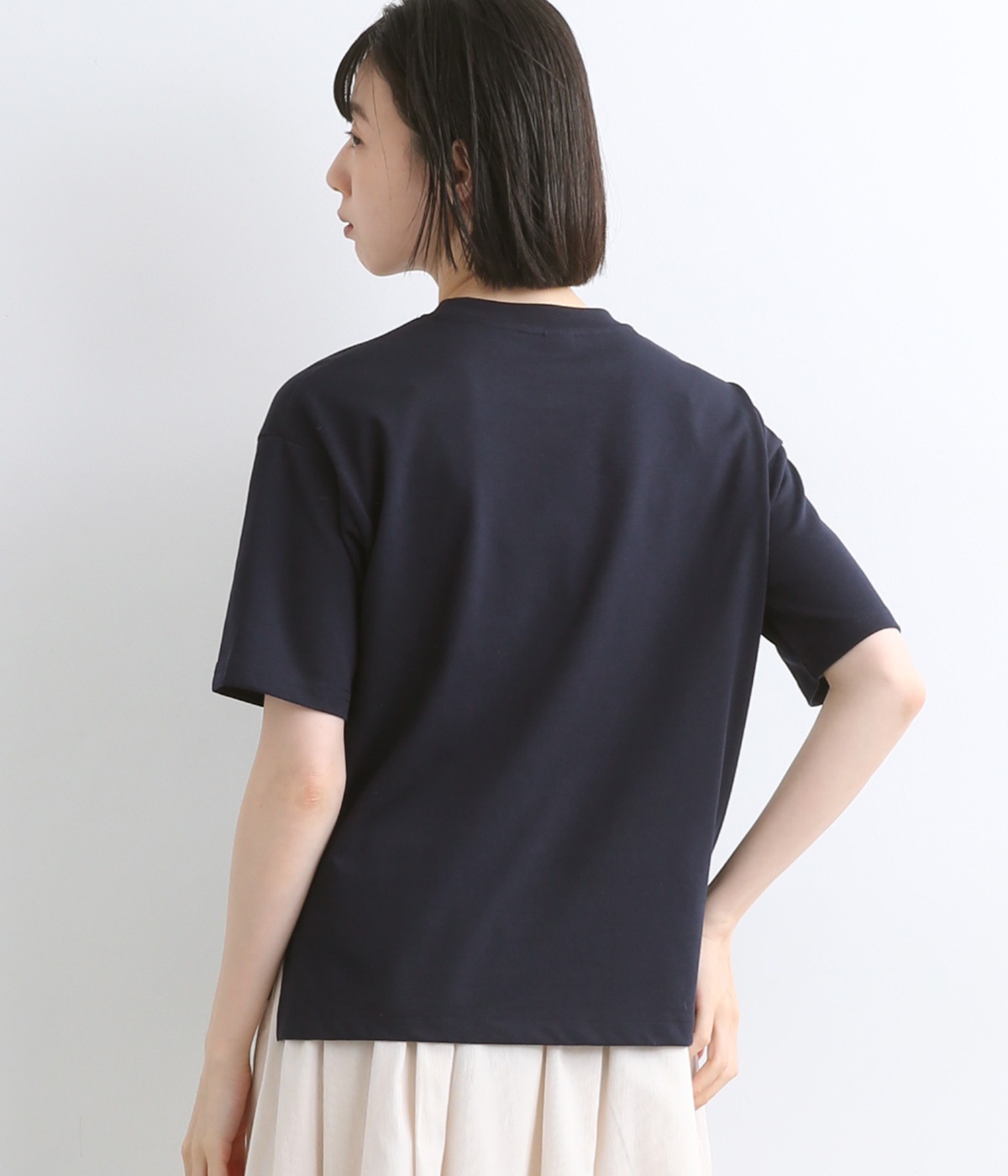 なめらかでやわらかな肌触りが着心地の良さを約束するコットン混紡の天竺生地を使用しています。薄めの中厚手生地でラフに着こなしやすい生地感です。