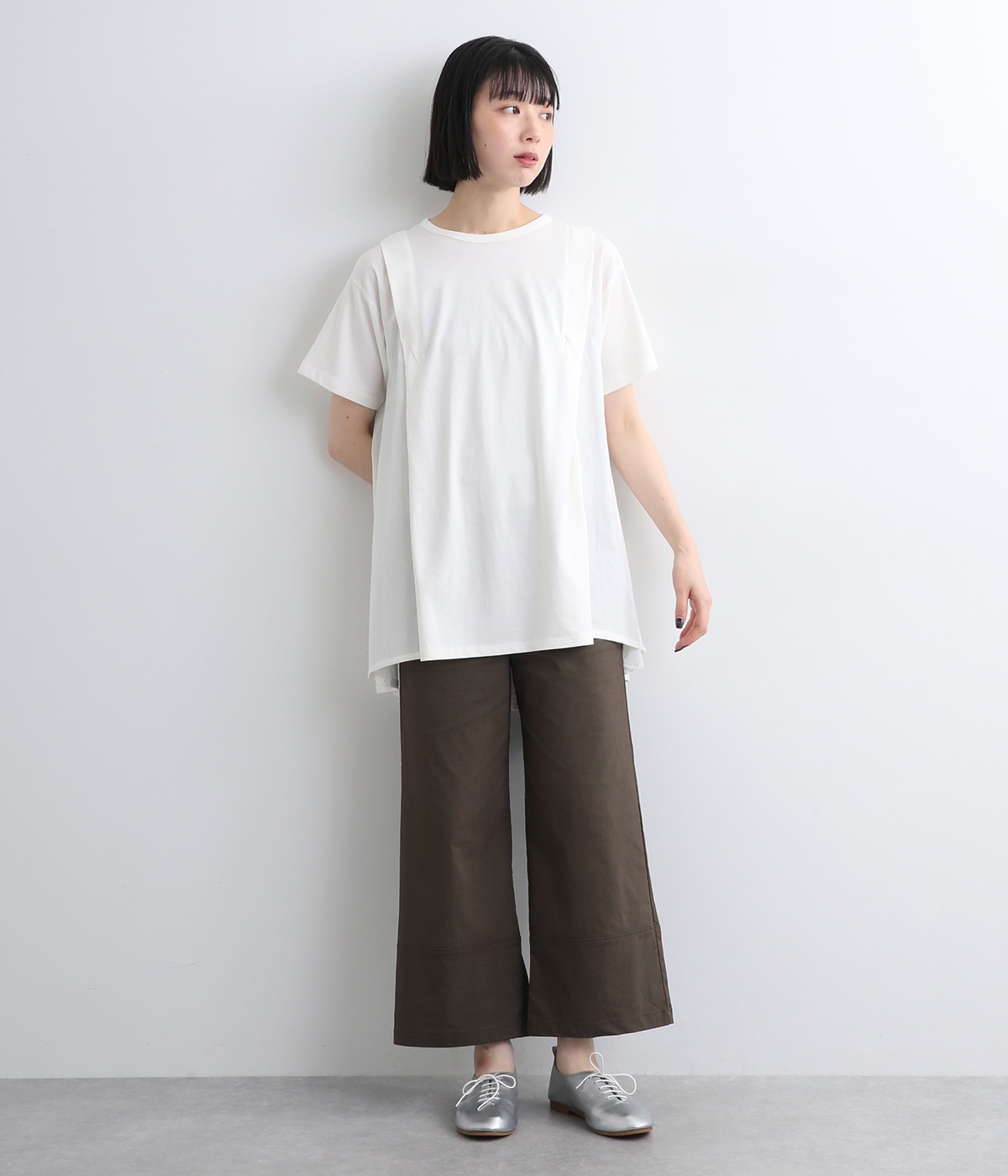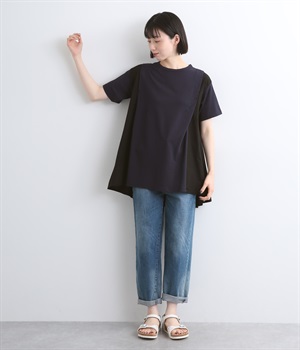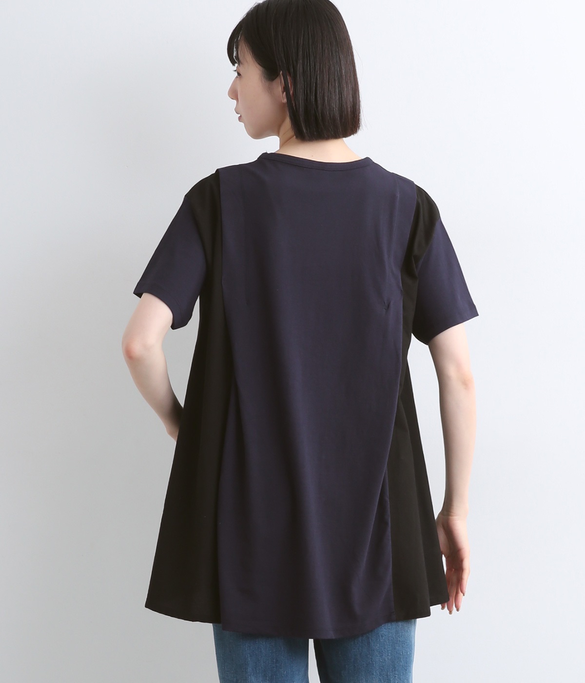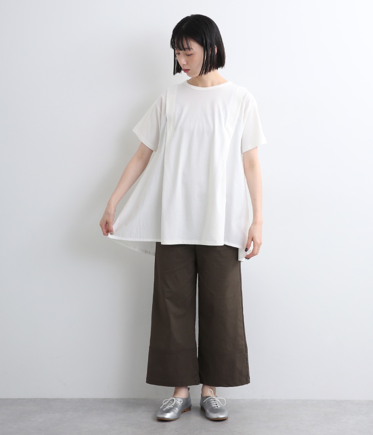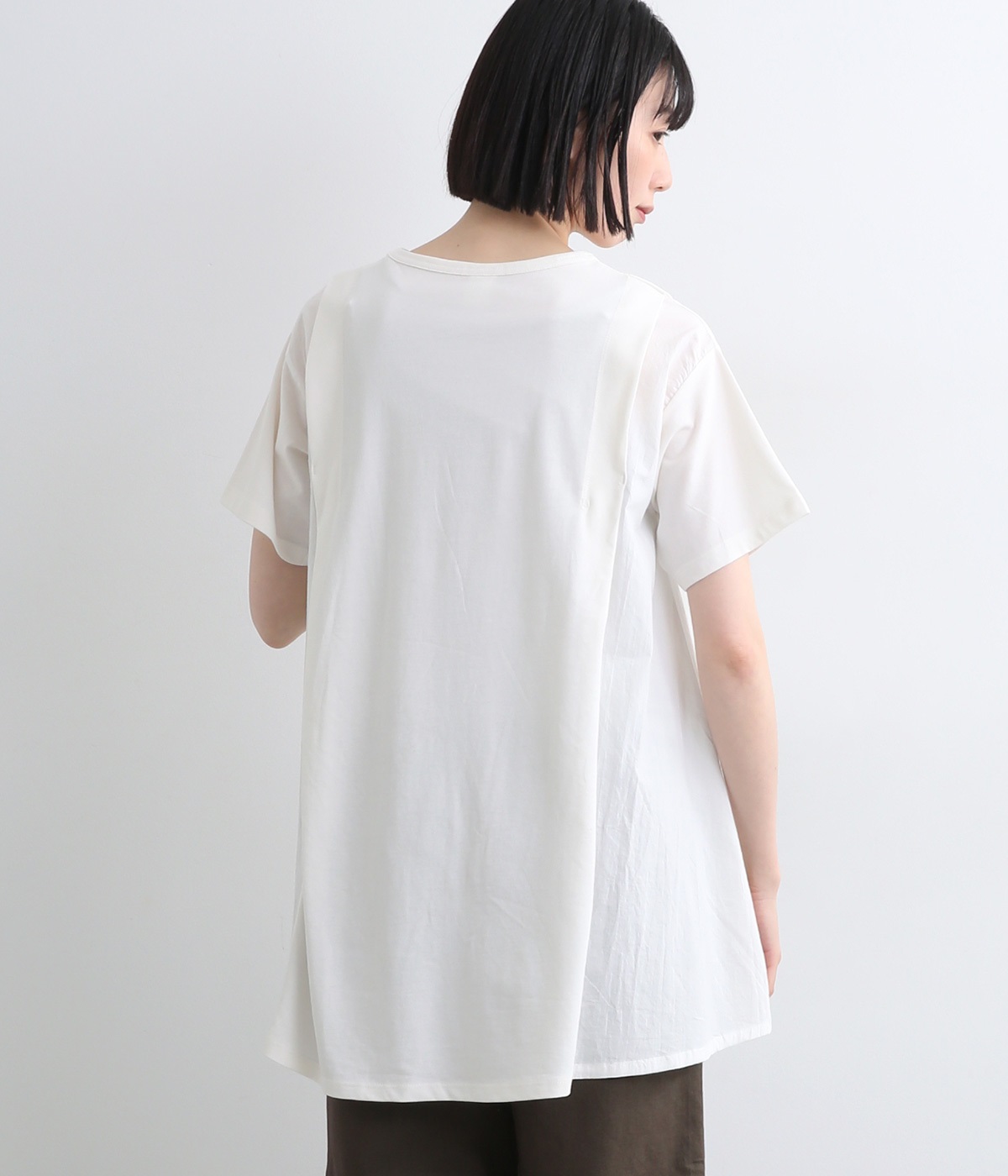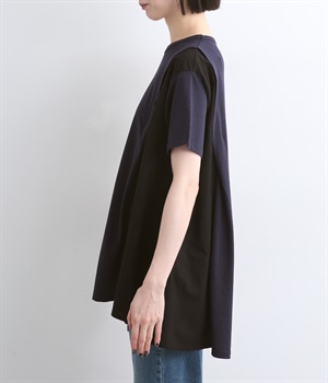カジュアルテイストな天竺をベースにしながらも、布帛生地を組み合わせたフレアシルエットが華やかな一枚。同色系でまとめつつさり気なく変化をつけたデザインが品のいい印象です。ボトムとのレイヤードがたのしめるやや長めの着丈も◎。