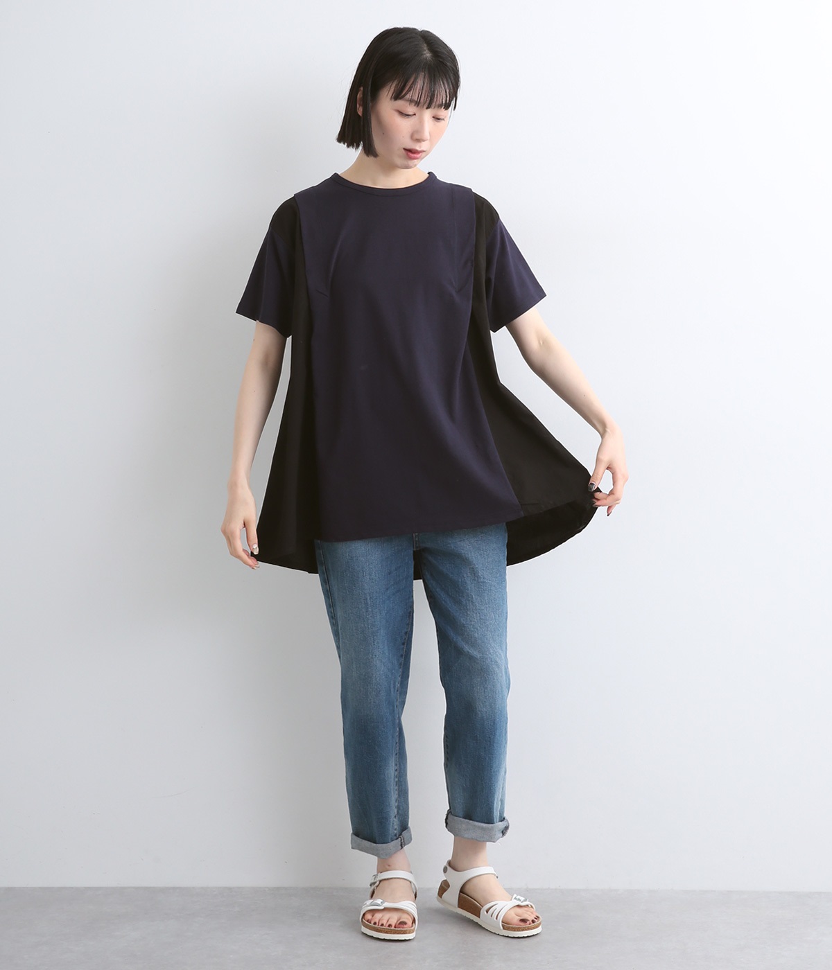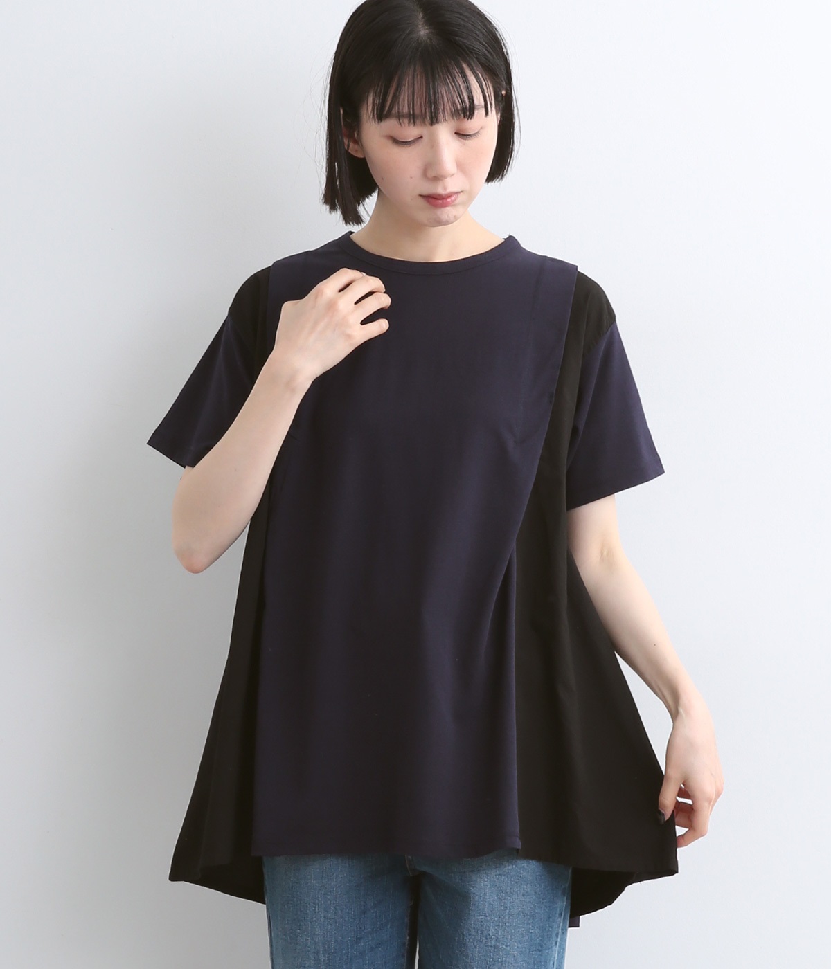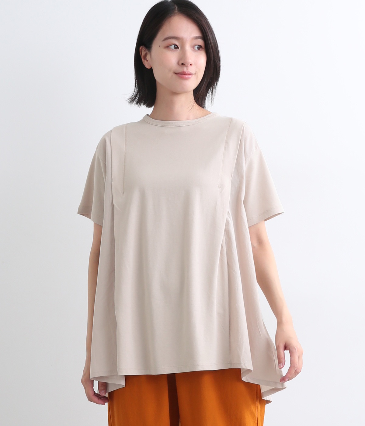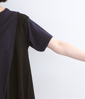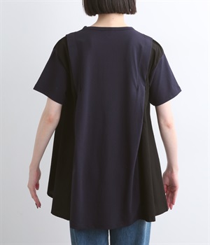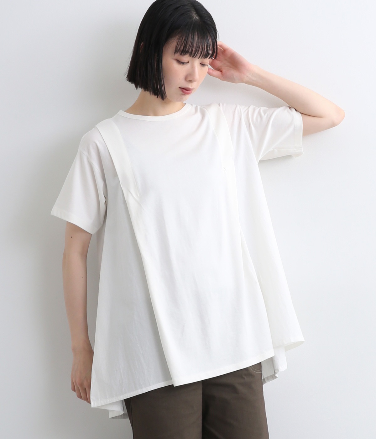 カジュアルテイストな天竺をベースにしながらも、布帛生地を組み合わせたフレアシルエットが華やかな一枚。同色系でまとめつつさり気なく変化をつけたデザインが品のいい印象です。ボトムとのレイヤードがたのしめるやや長めの着丈も◎。