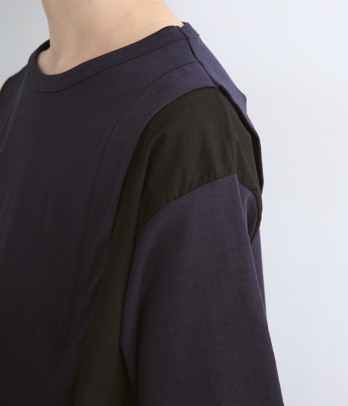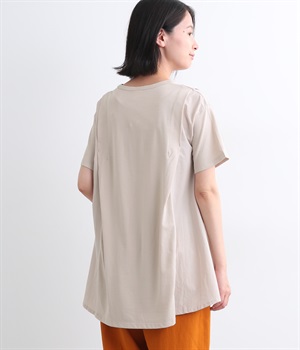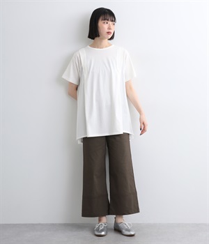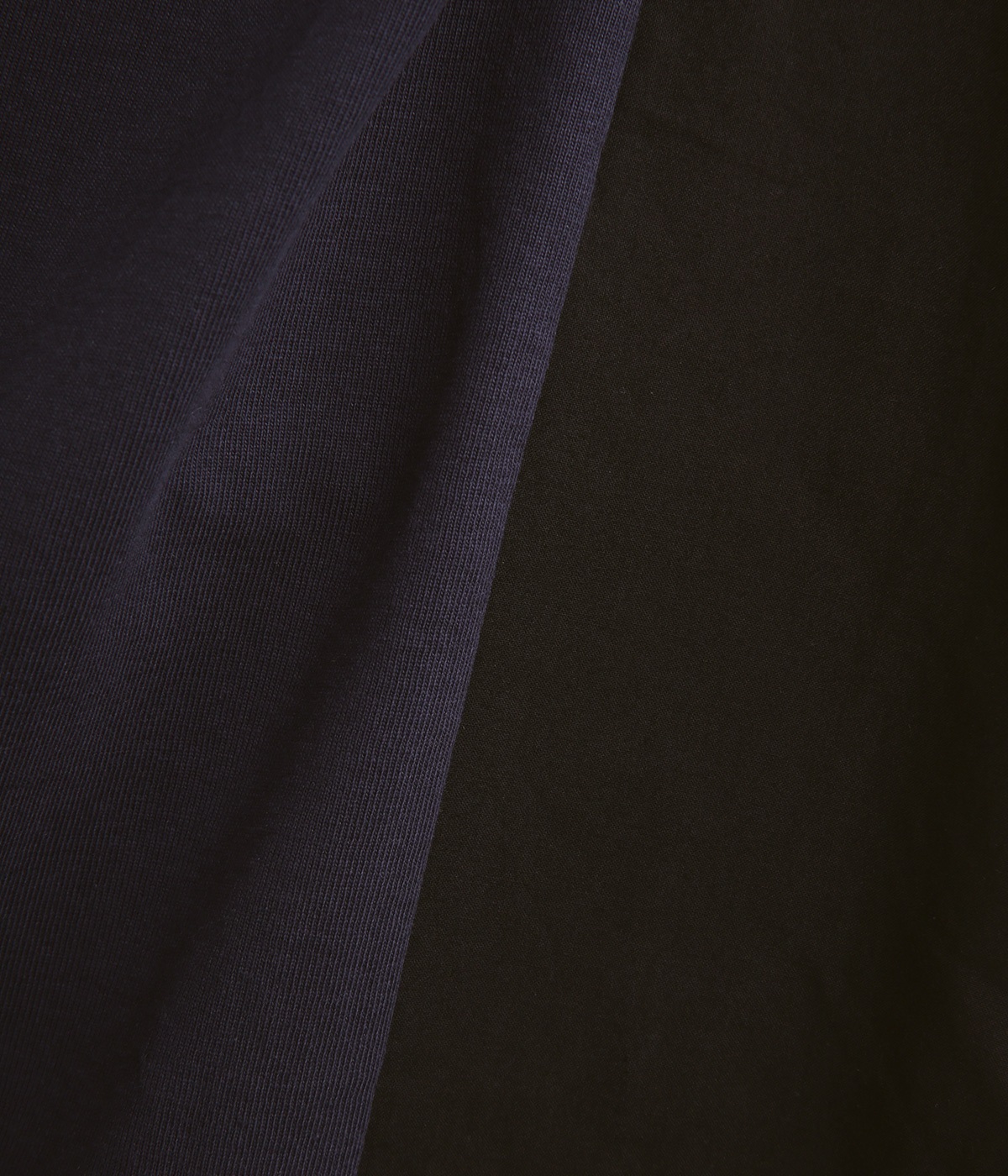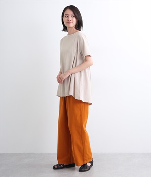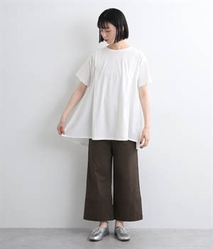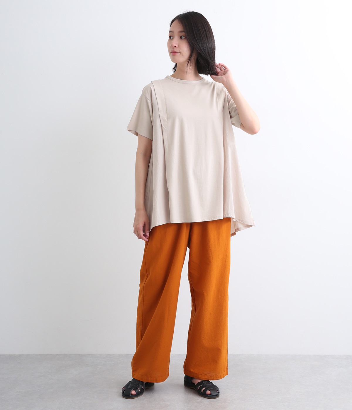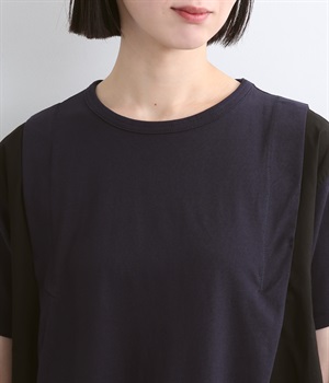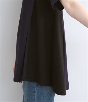カジュアルテイストな天竺をベースにしながらも、布帛生地を組み合わせたフレアシルエットが華やかな一枚。同色系でまとめつつさり気なく変化をつけたデザインが品のいい印象です。ボトムとのレイヤードがたのしめるやや長めの着丈も◎。