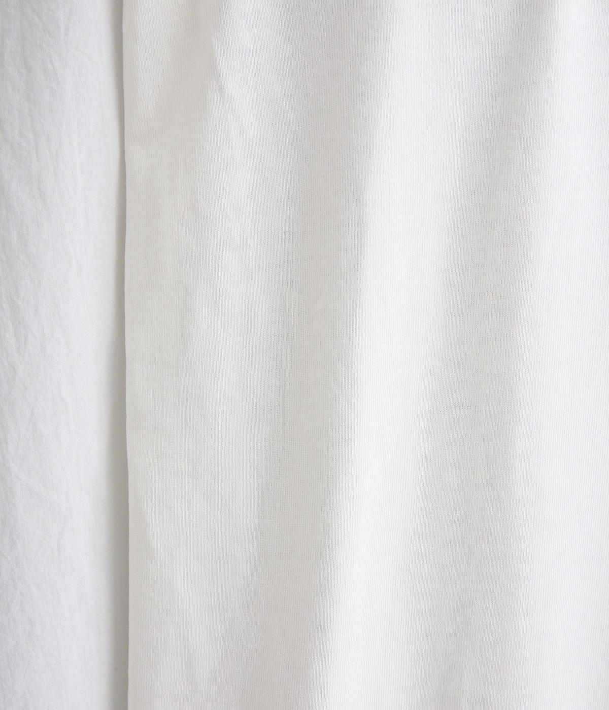 肌触りがさらりとしていて通気性や吸水性に優れた強撚天竺を使用しています。やわらかで着心地がよく、独特のシャリ感があって快適です。サイドはさらっとした布帛に切り替えました。