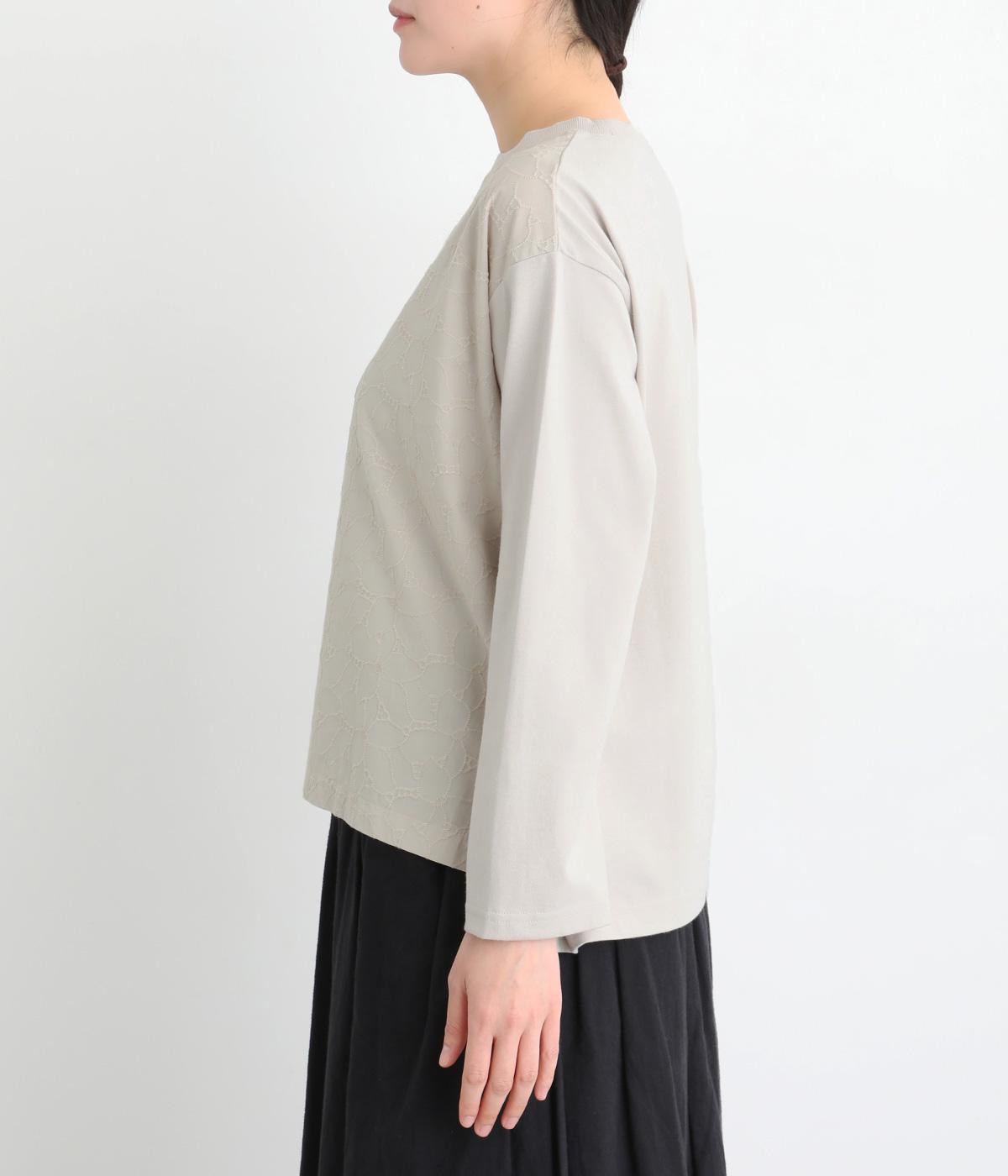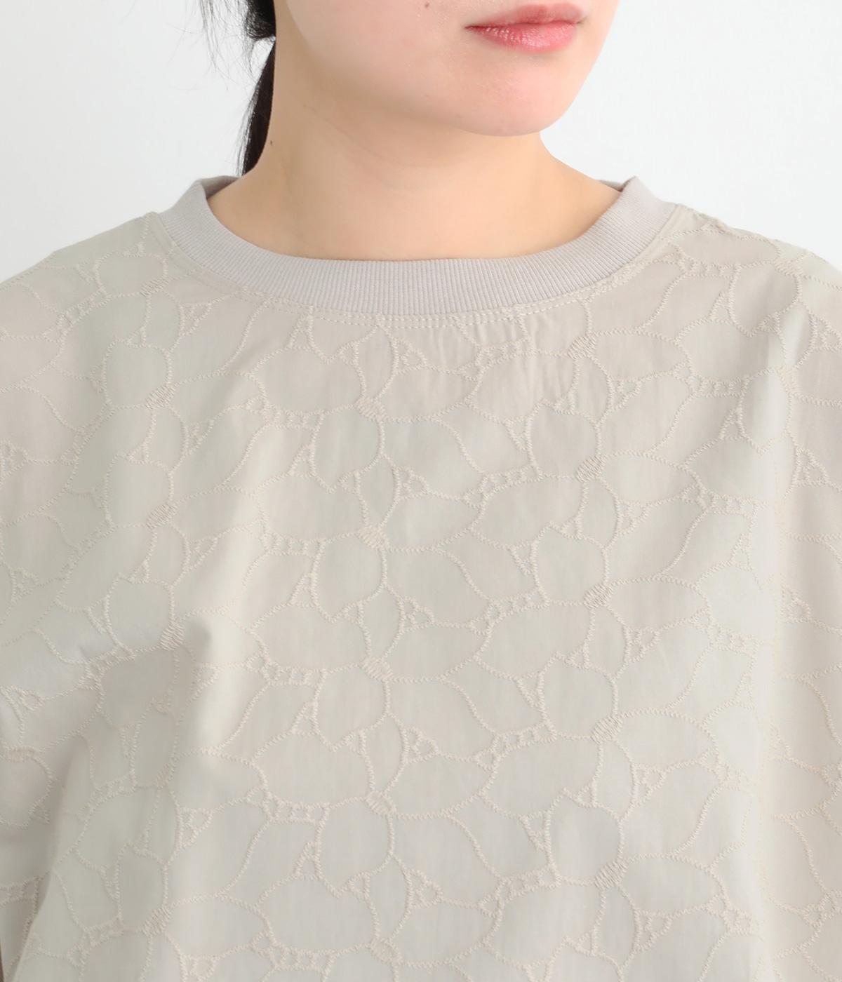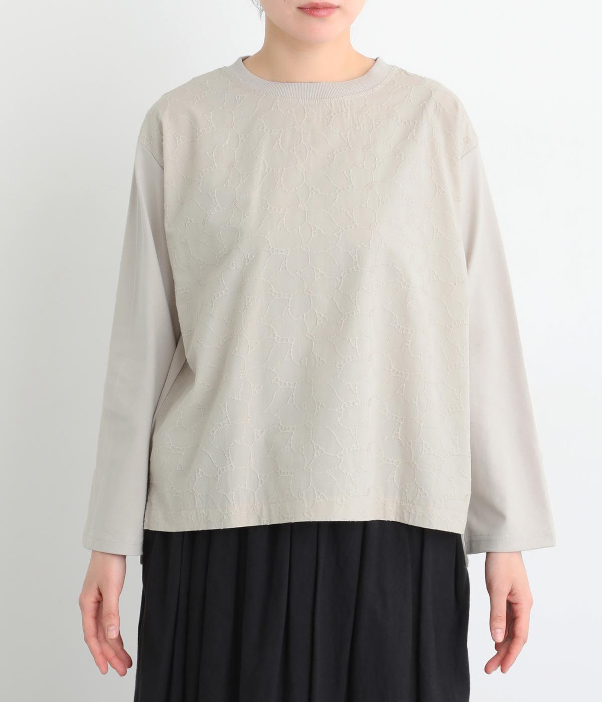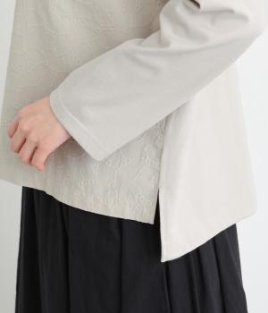 シンプルで定番のプルオーバーに、前後で異素材を組み合わせました。前身頃の刺しゅうは同系色で表現し、さりげない華やぎをプラス。前後差のある裾が気になる腰まわりをカバーし、リラックス感のある着心地です。