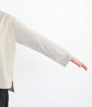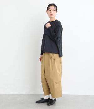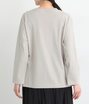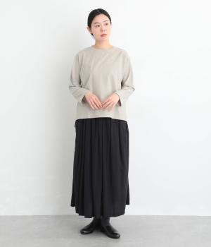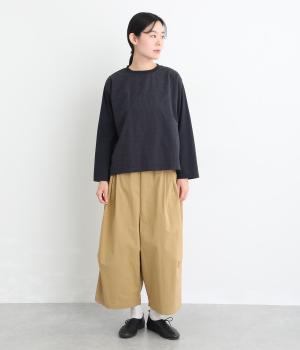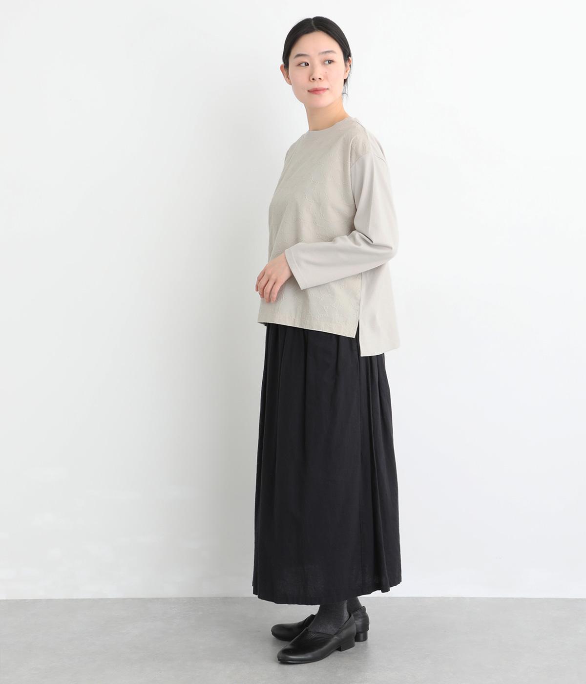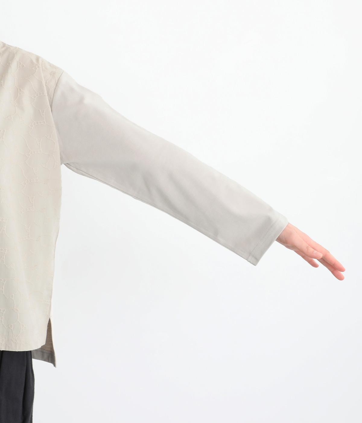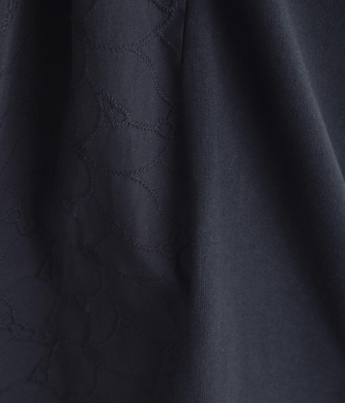 シンプルで定番のプルオーバーに、前後で異素材を組み合わせました。前身頃の刺しゅうは同系色で表現し、さりげない華やぎをプラス。前後差のある裾が気になる腰まわりをカバーし、リラックス感のある着心地です。