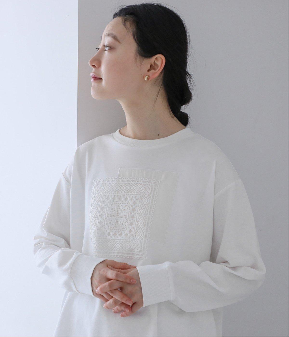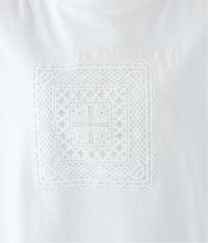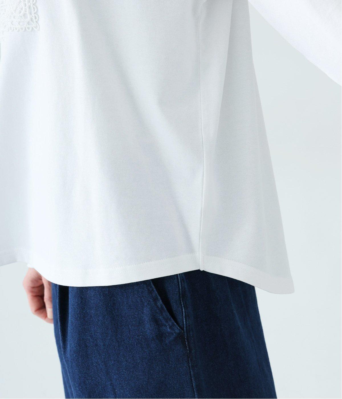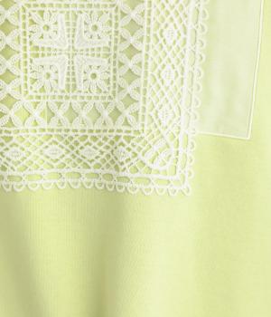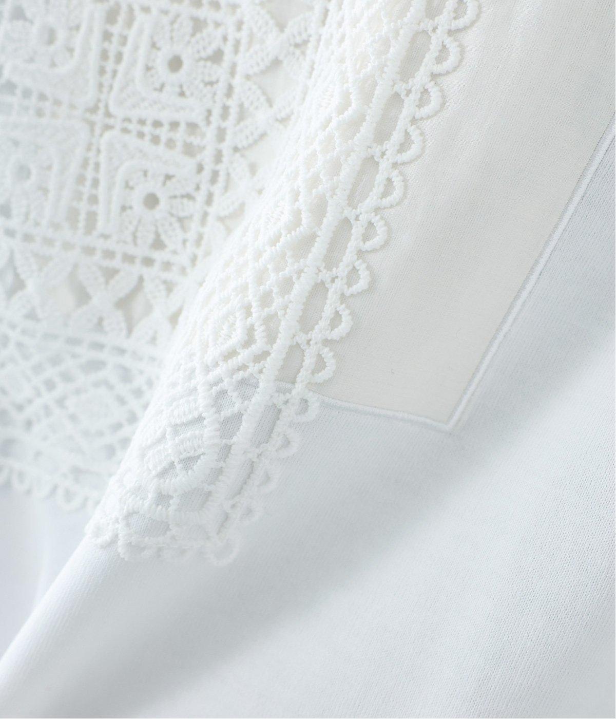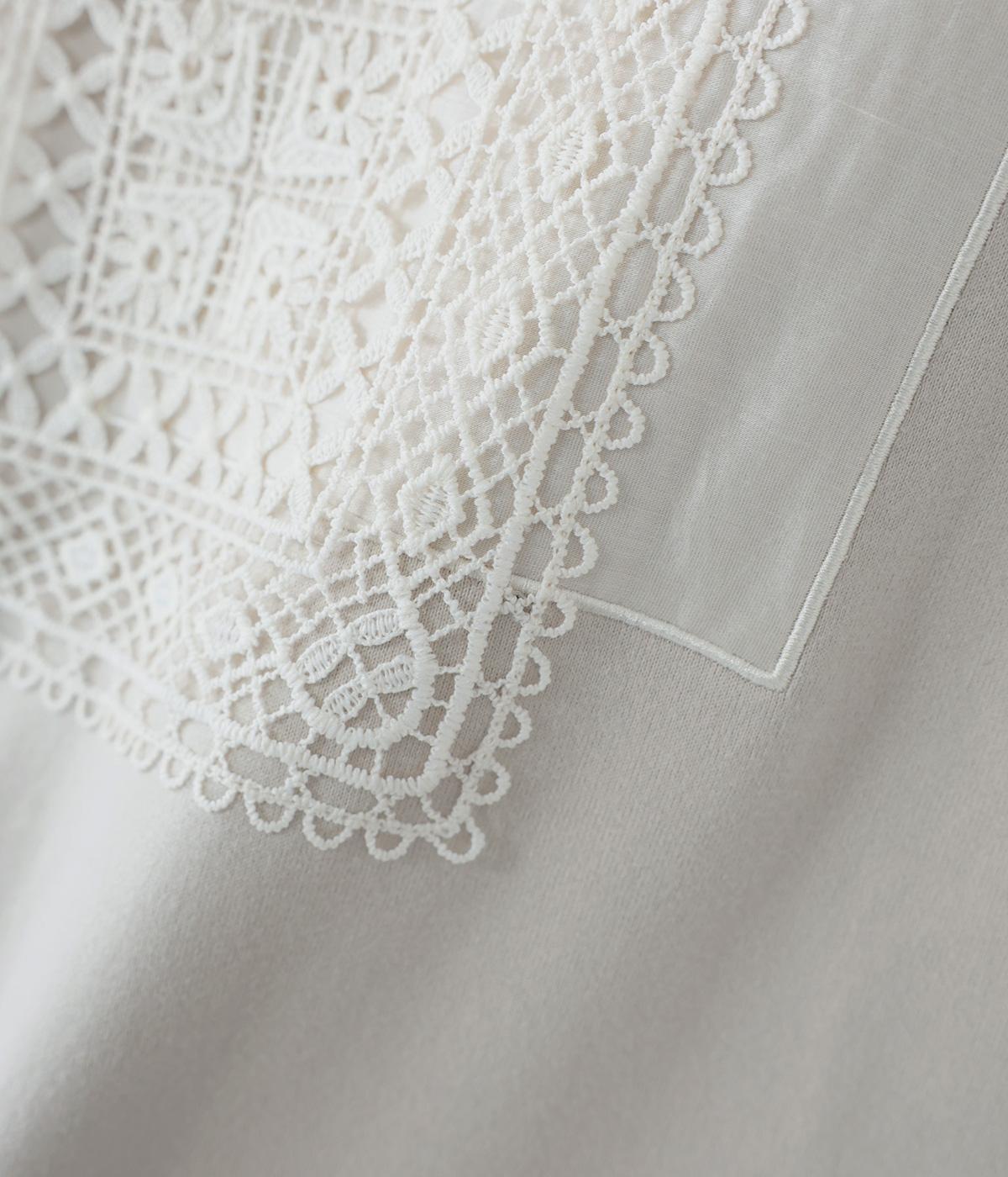 ベーシックでカジュアルなクルーネックプルオーバーにレースをあしらい甘さを添えました。レースの下には光沢のある生地を重ねてより目を引くデザインに。大きくラウンドさせた後ろ裾が、後ろ姿をすっきりと見せてくれます。