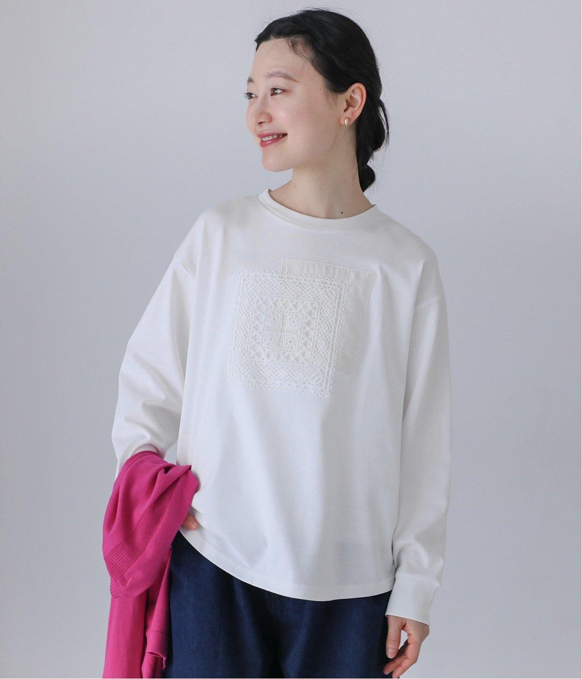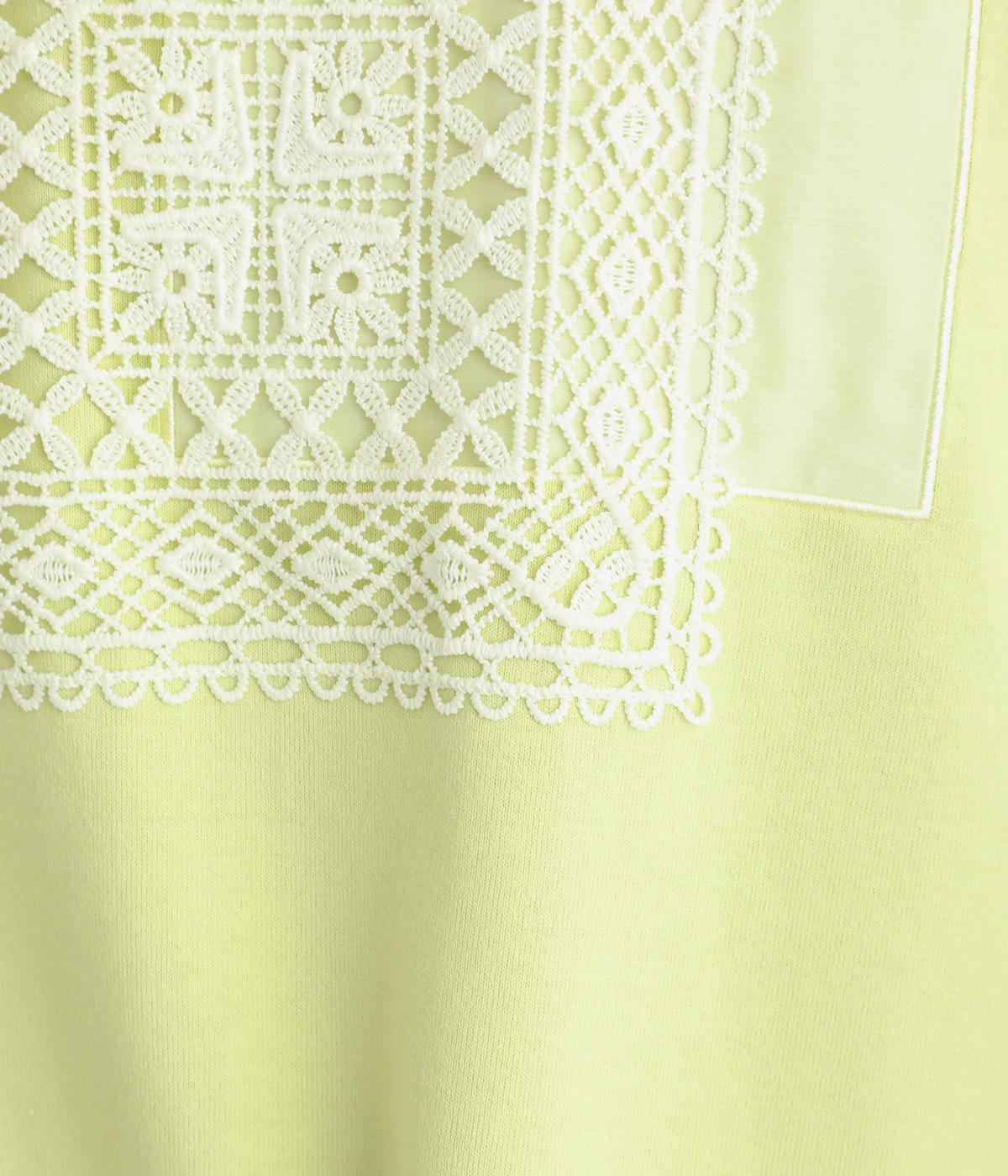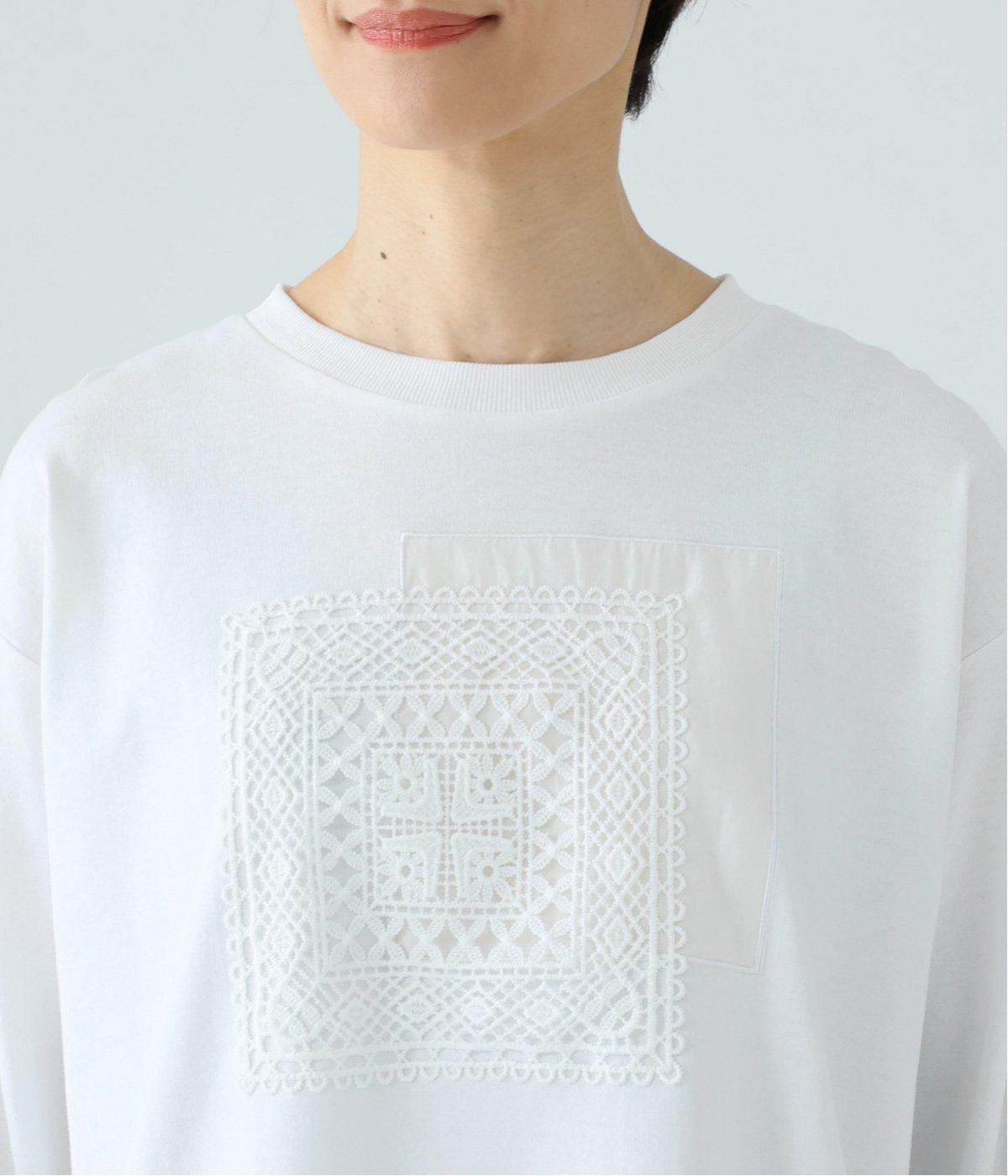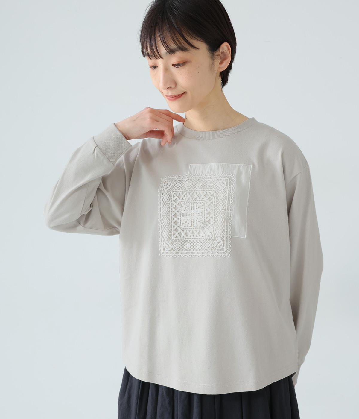 ベーシックでカジュアルなクルーネックプルオーバーにレースをあしらい甘さを添えました。レースの下には光沢のある生地を重ねてより目を引くデザインに。大きくラウンドさせた後ろ裾が、後ろ姿をすっきりと見せてくれます。