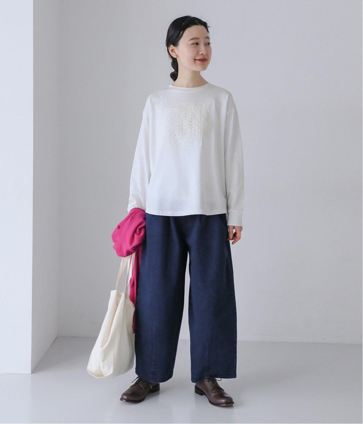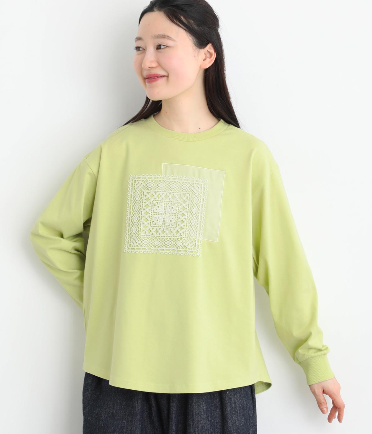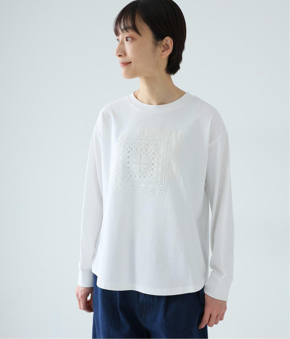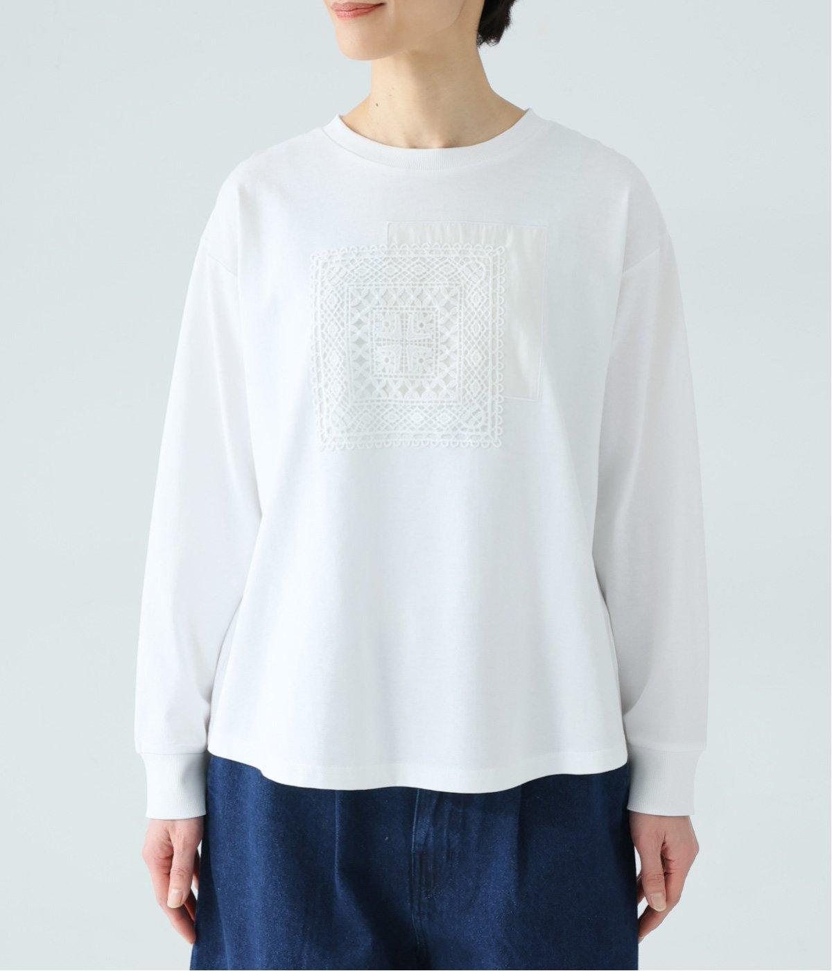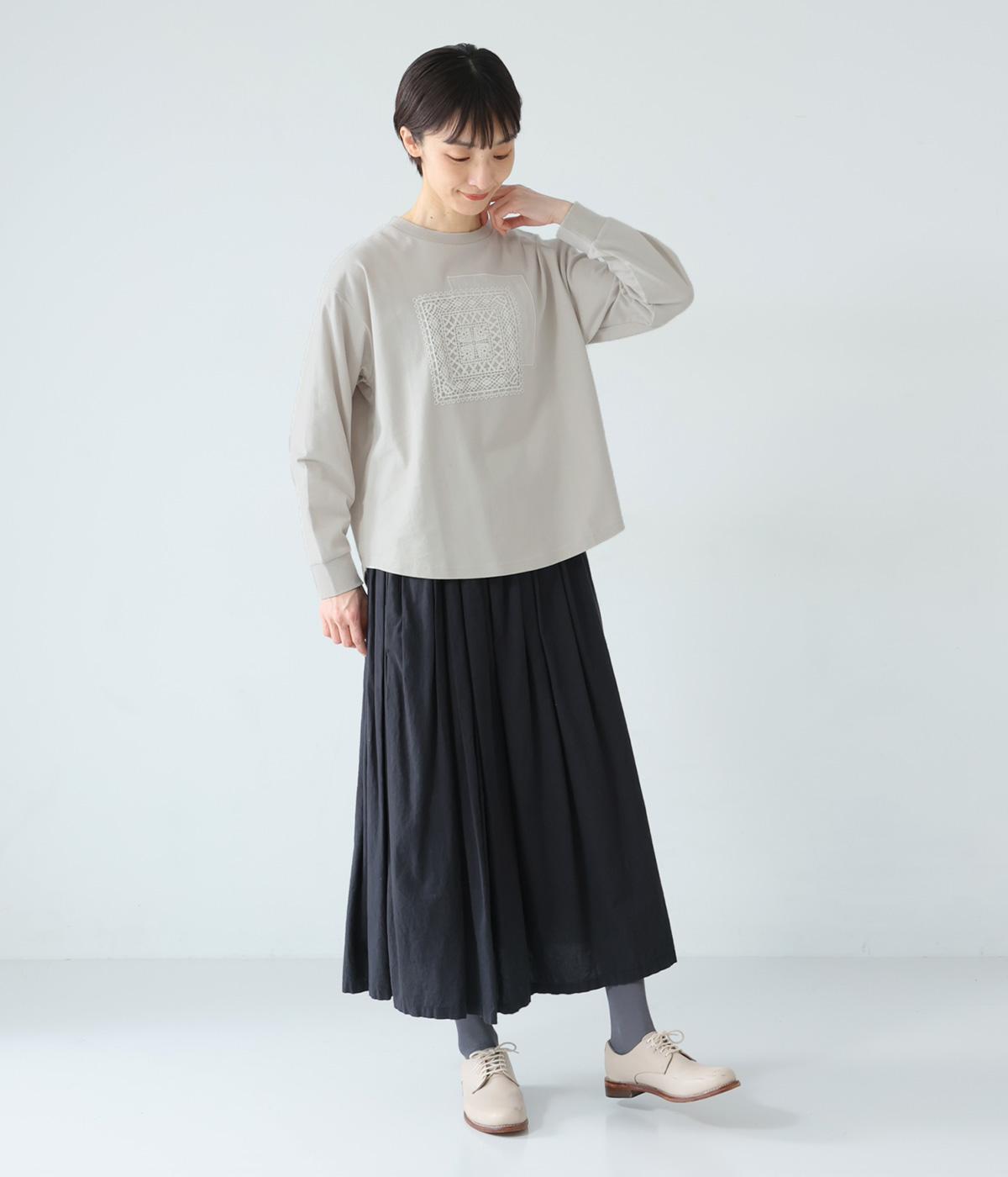 ベーシックでカジュアルなクルーネックプルオーバーにレースをあしらい甘さを添えました。レースの下には光沢のある生地を重ねてより目を引くデザインに。大きくラウンドさせた後ろ裾が、後ろ姿をすっきりと見せてくれます。