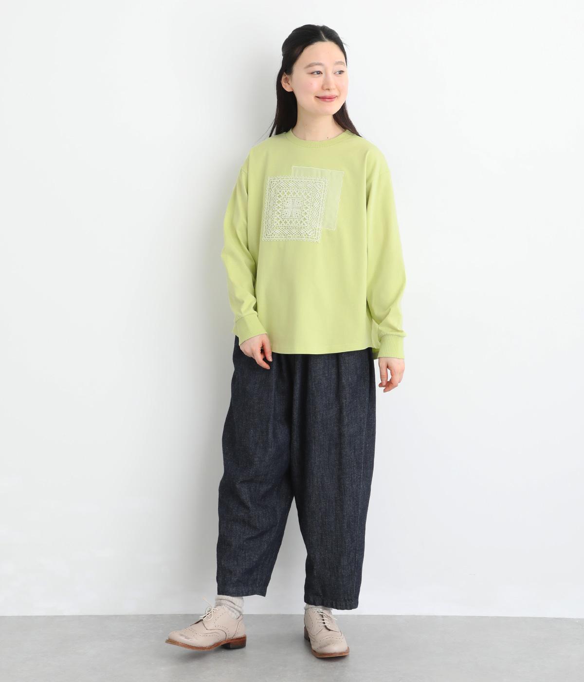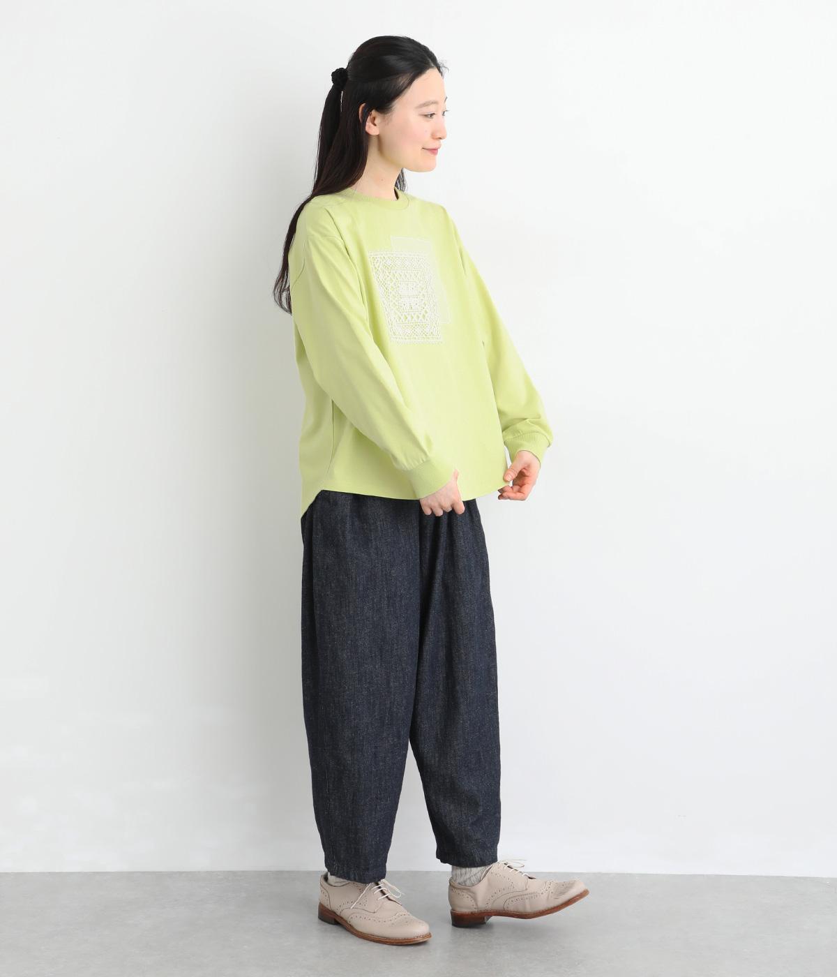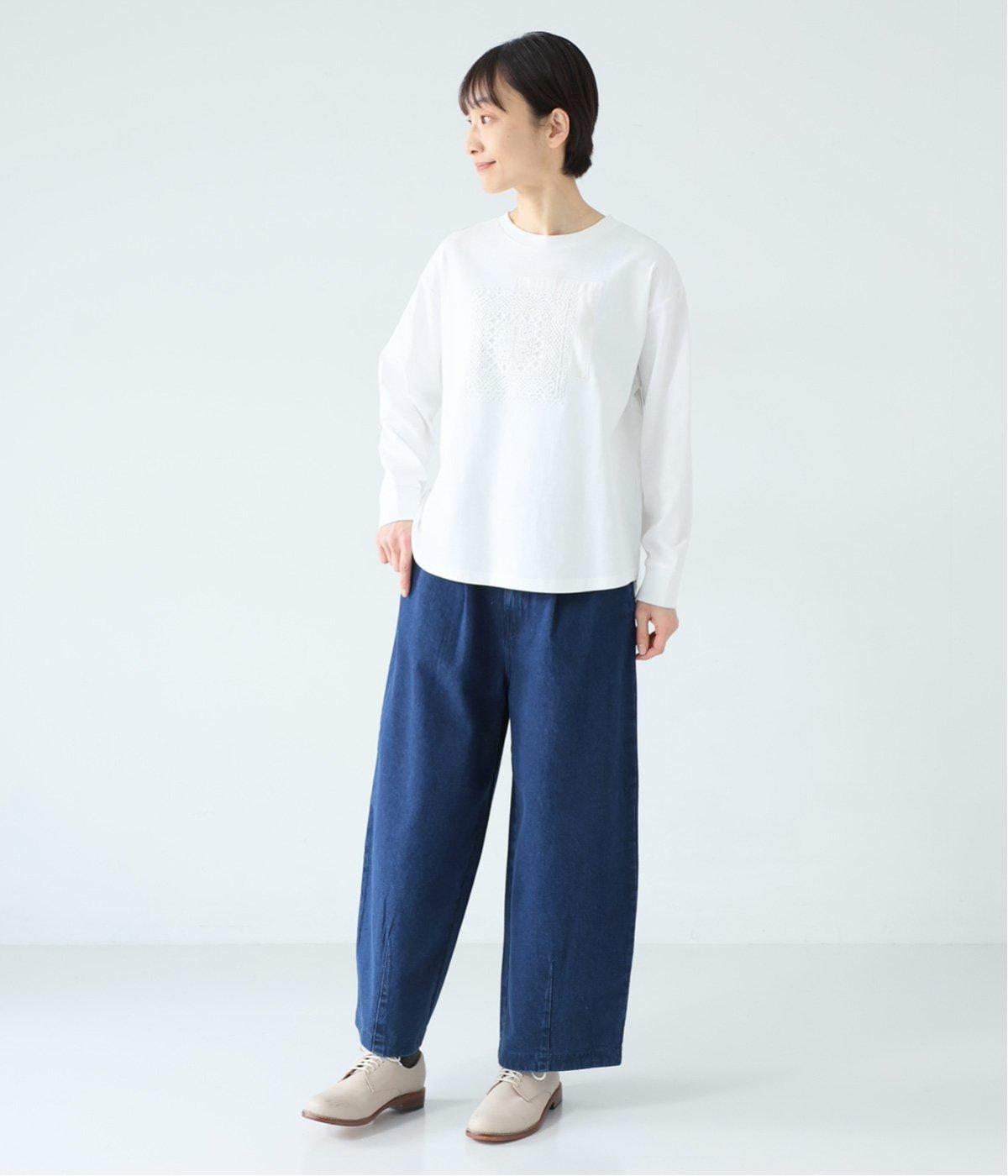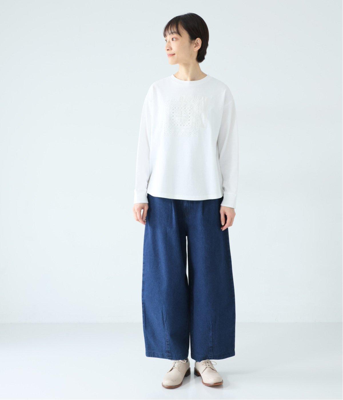 ベーシックでカジュアルなクルーネックプルオーバーにレースをあしらい甘さを添えました。レースの下には光沢のある生地を重ねてより目を引くデザインに。大きくラウンドさせた後ろ裾が、後ろ姿をすっきりと見せてくれます。