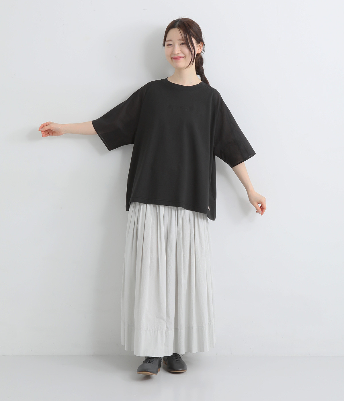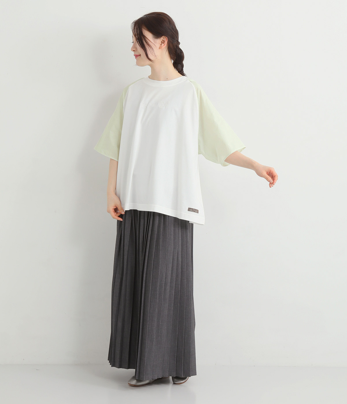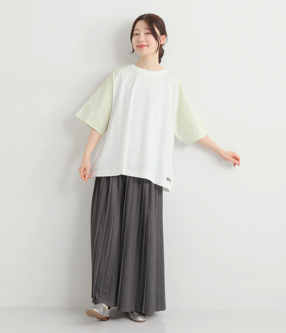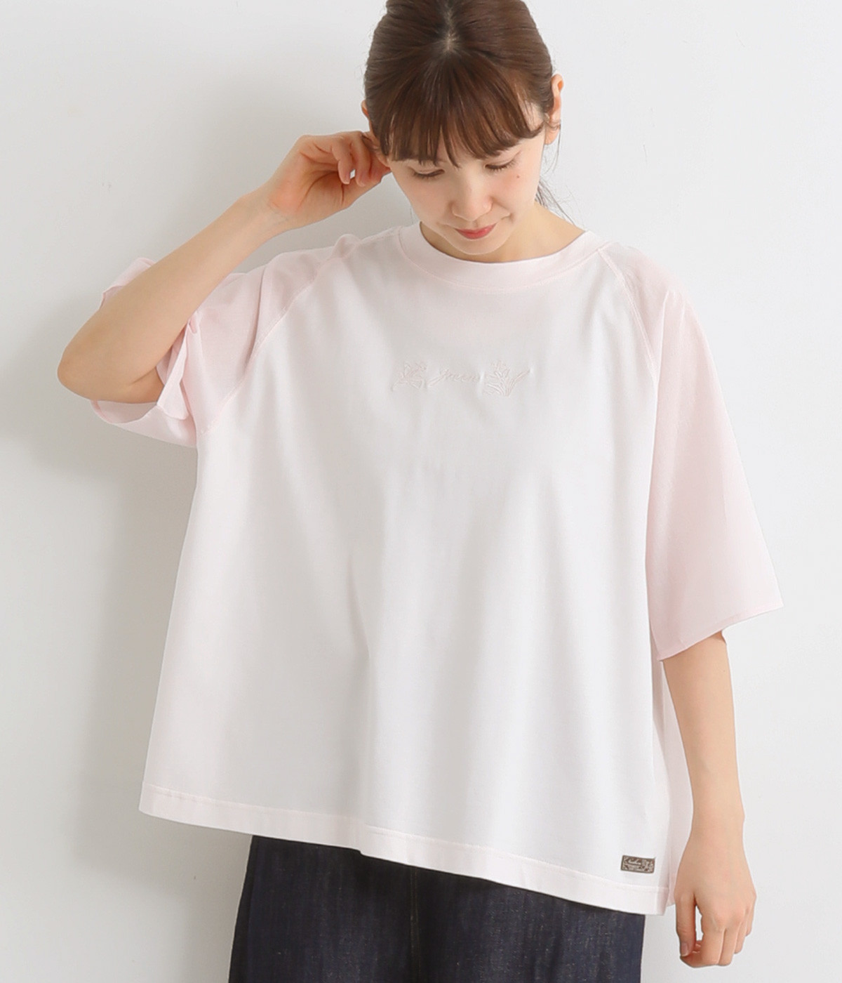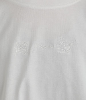 胸元にボディと同色の刺しゅうをデザインし、品よくアクセントをプラス。ラグランスリーブに加えて身幅を広く取り、動きやすい仕上がりに。ふんわりと広がるフレアシルエットがコーディネートにやさしい雰囲気を演出します。
