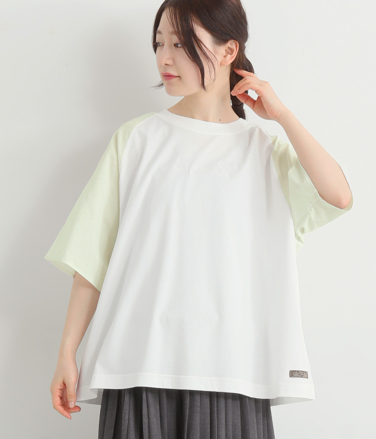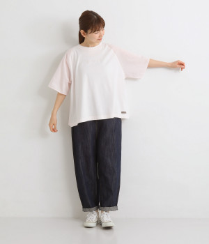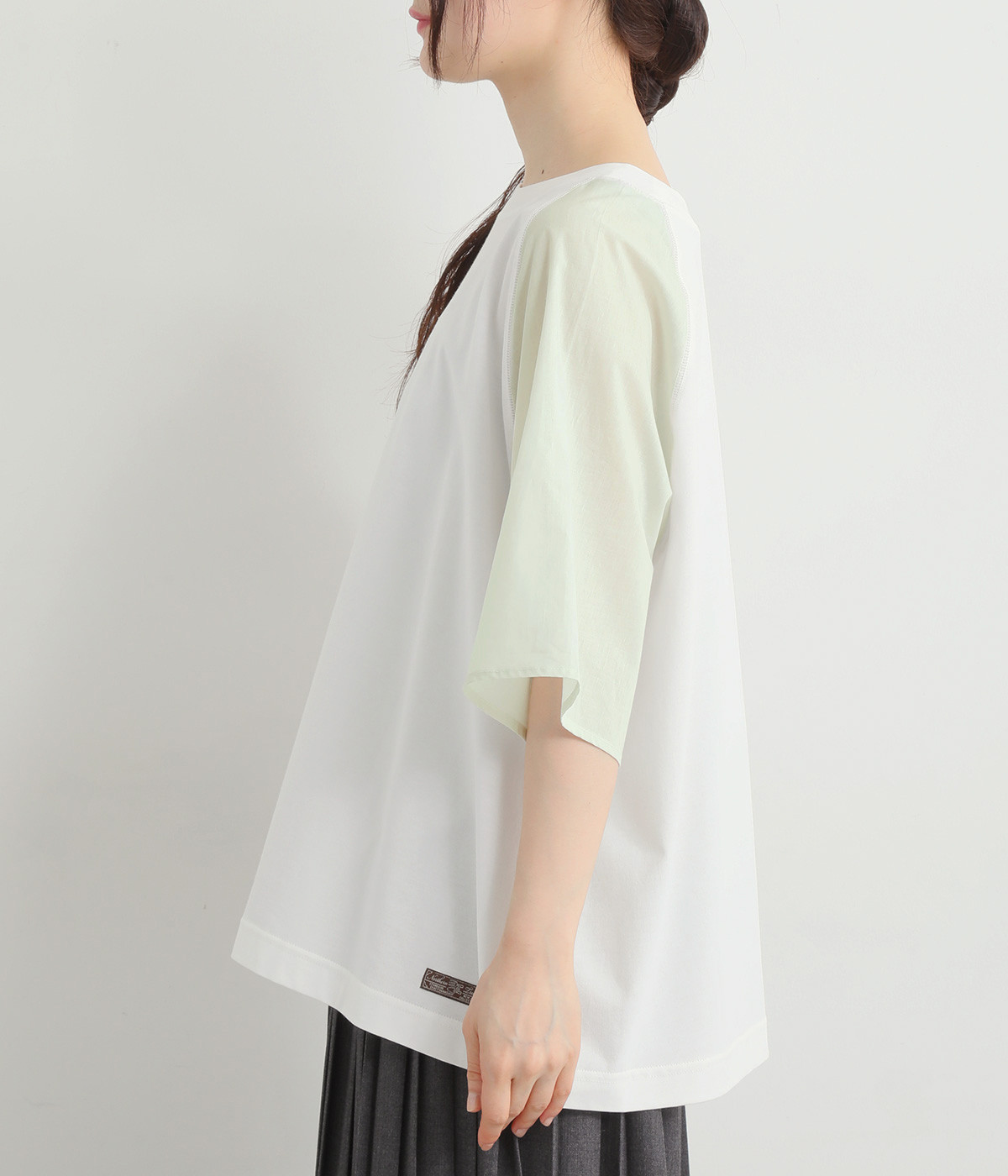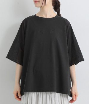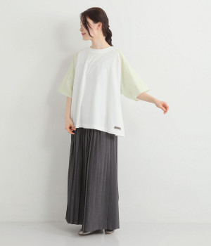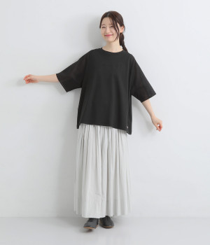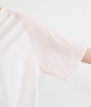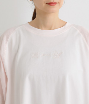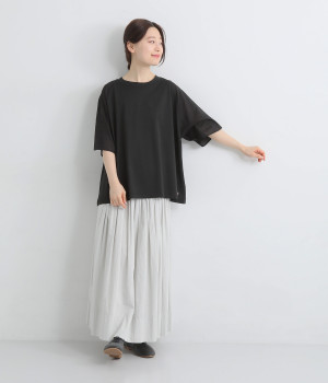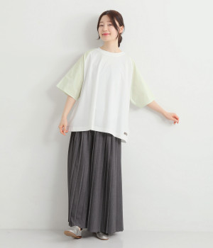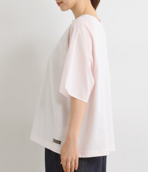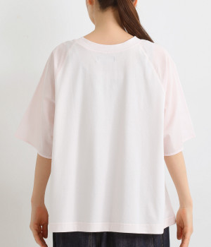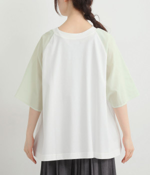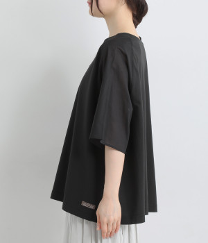 なめらかな触り心地の大人らしい雰囲気を放つカットソー生地。ラグランスリーブはコットンの布帛に切り替えています。着用時に心地よいひんやり感を感じる接触冷感機能素材。