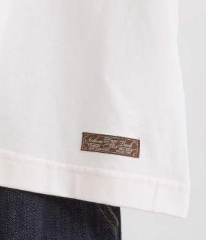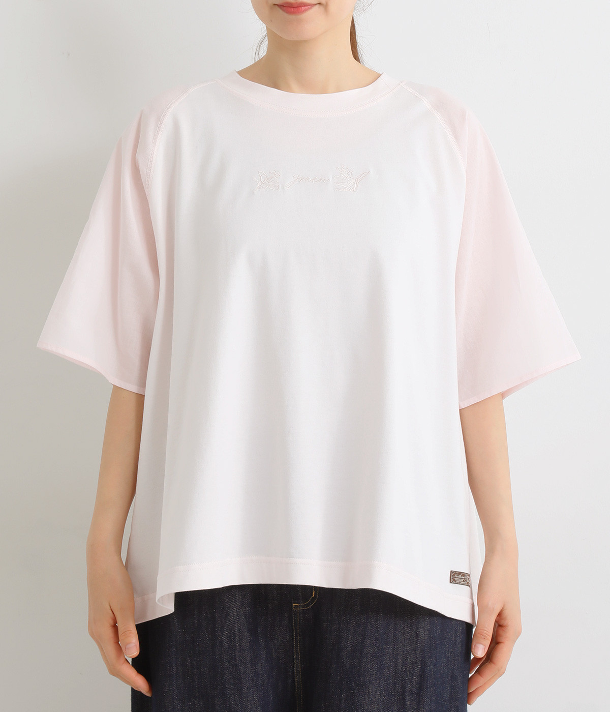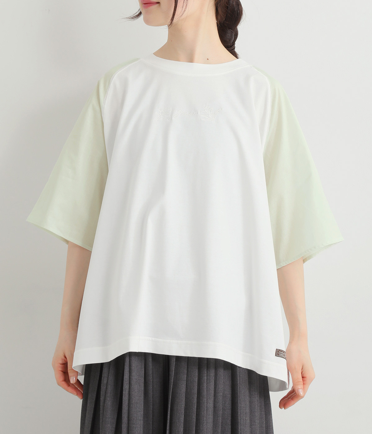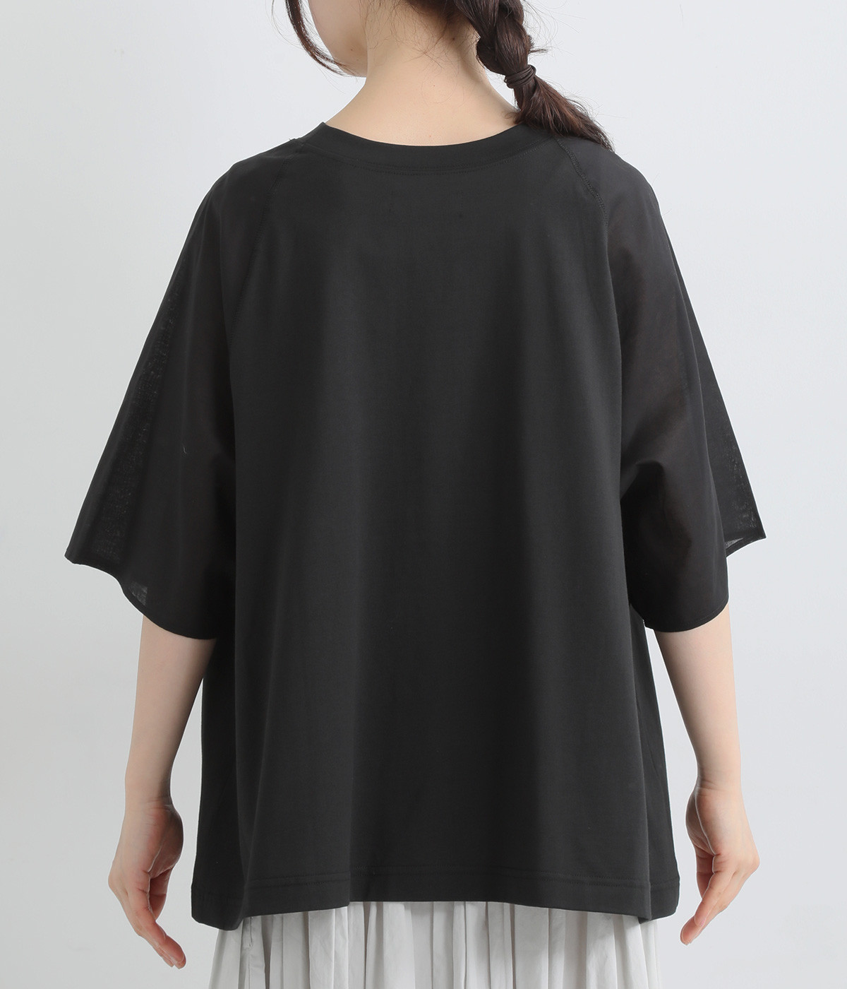 なめらかな触り心地の大人らしい雰囲気を放つカットソー生地。ラグランスリーブはコットンの布帛に切り替えています。着用時に心地よいひんやり感を感じる接触冷感機能素材。