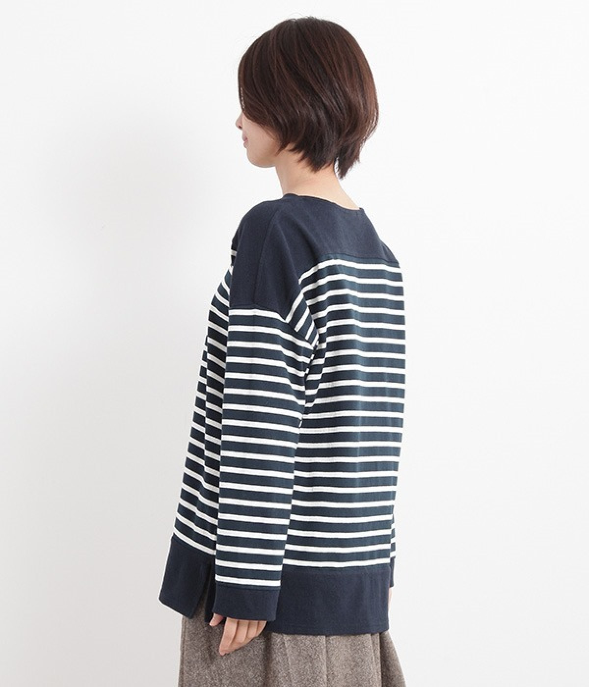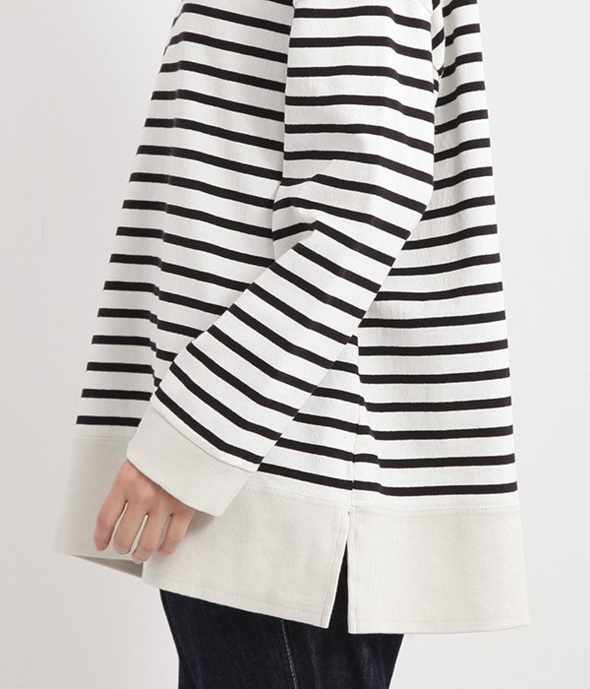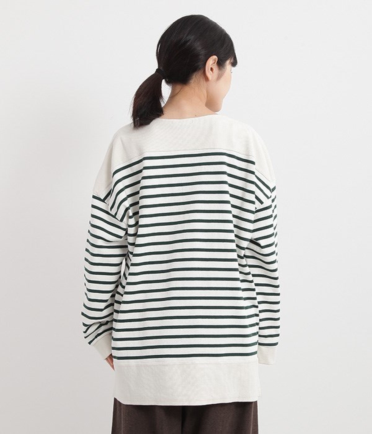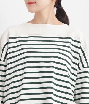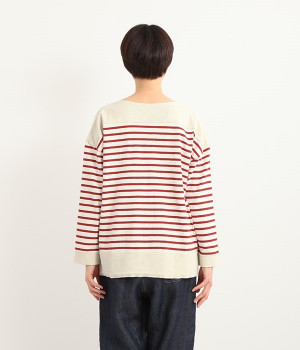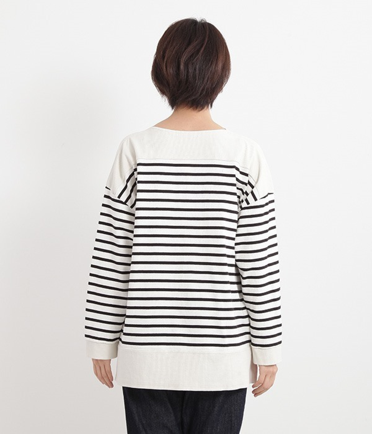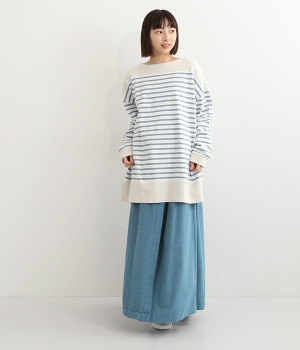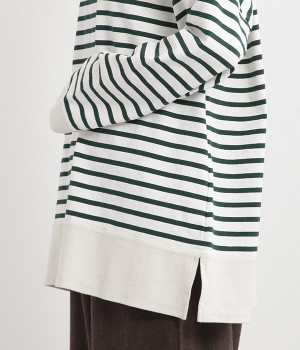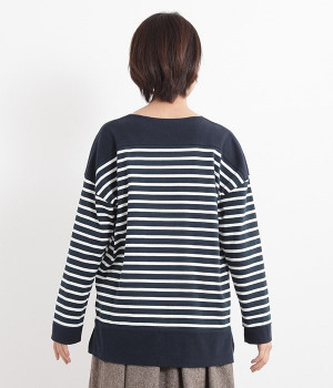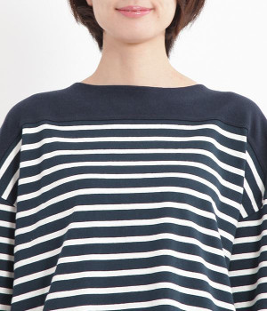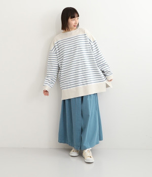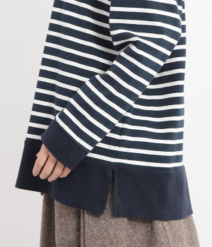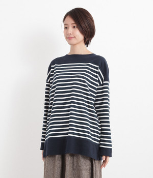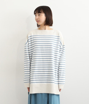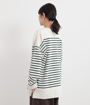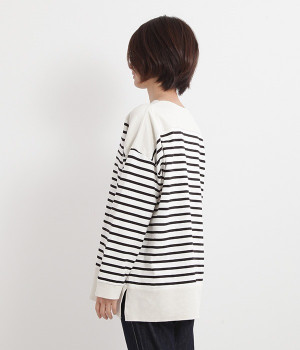 適度な肉感とストレッチの効いたボーダー生地を使用した、ビッグシルエットプルオーバーです。肩まわり、袖口、裾には配色違いのリブをあしらい、普通のボーダーアイテムとはひと味違ったデザインにしています。こなれた印象のドロップショルダーやサイドのスリットなど、きれいな着こなしを実現するさりげないディテールもポイントです。