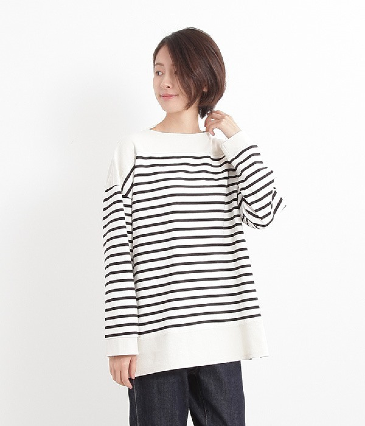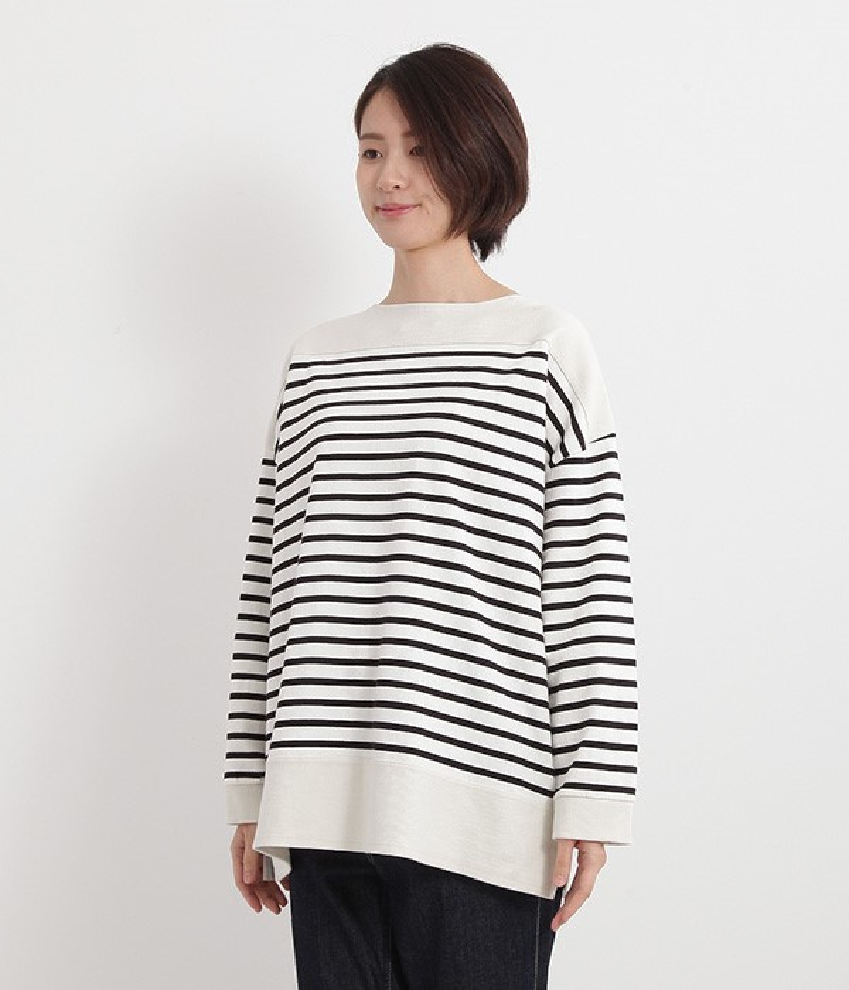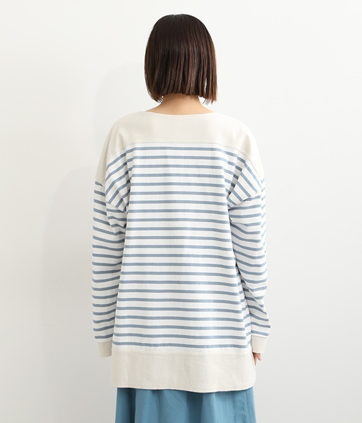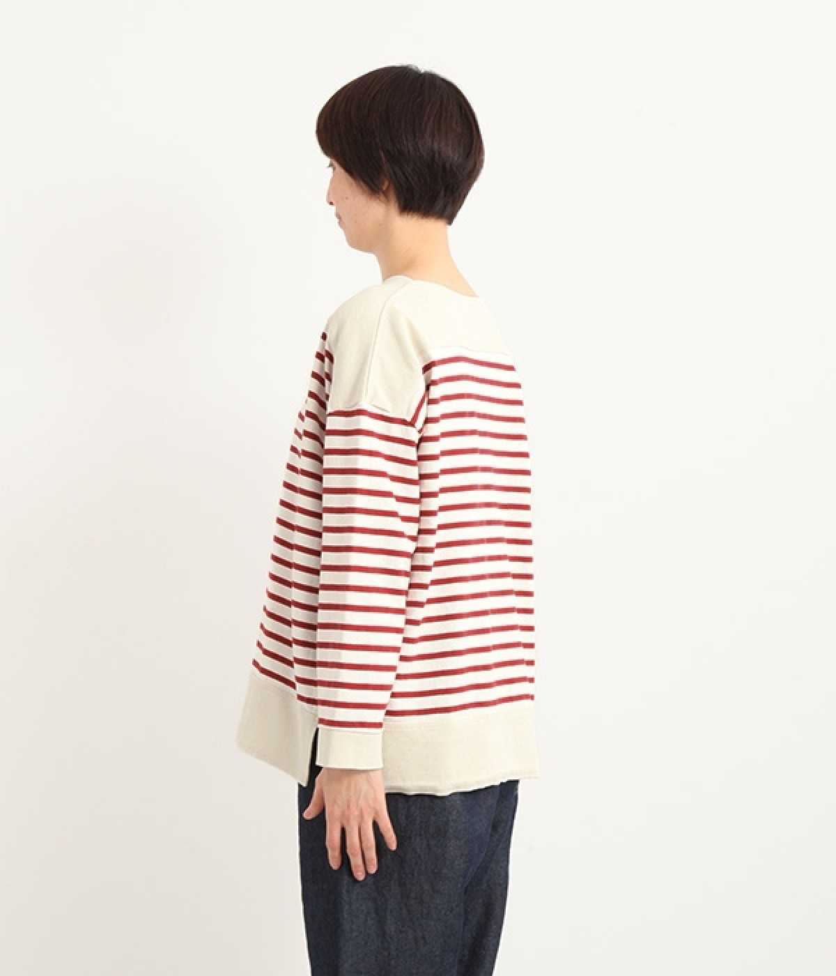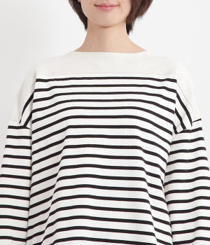 適度な肉感とストレッチの効いたボーダー生地を使用した、ビッグシルエットプルオーバーです。肩まわり、袖口、裾には配色違いのリブをあしらい、普通のボーダーアイテムとはひと味違ったデザインにしています。こなれた印象のドロップショルダーやサイドのスリットなど、きれいな着こなしを実現するさりげないディテールもポイントです。