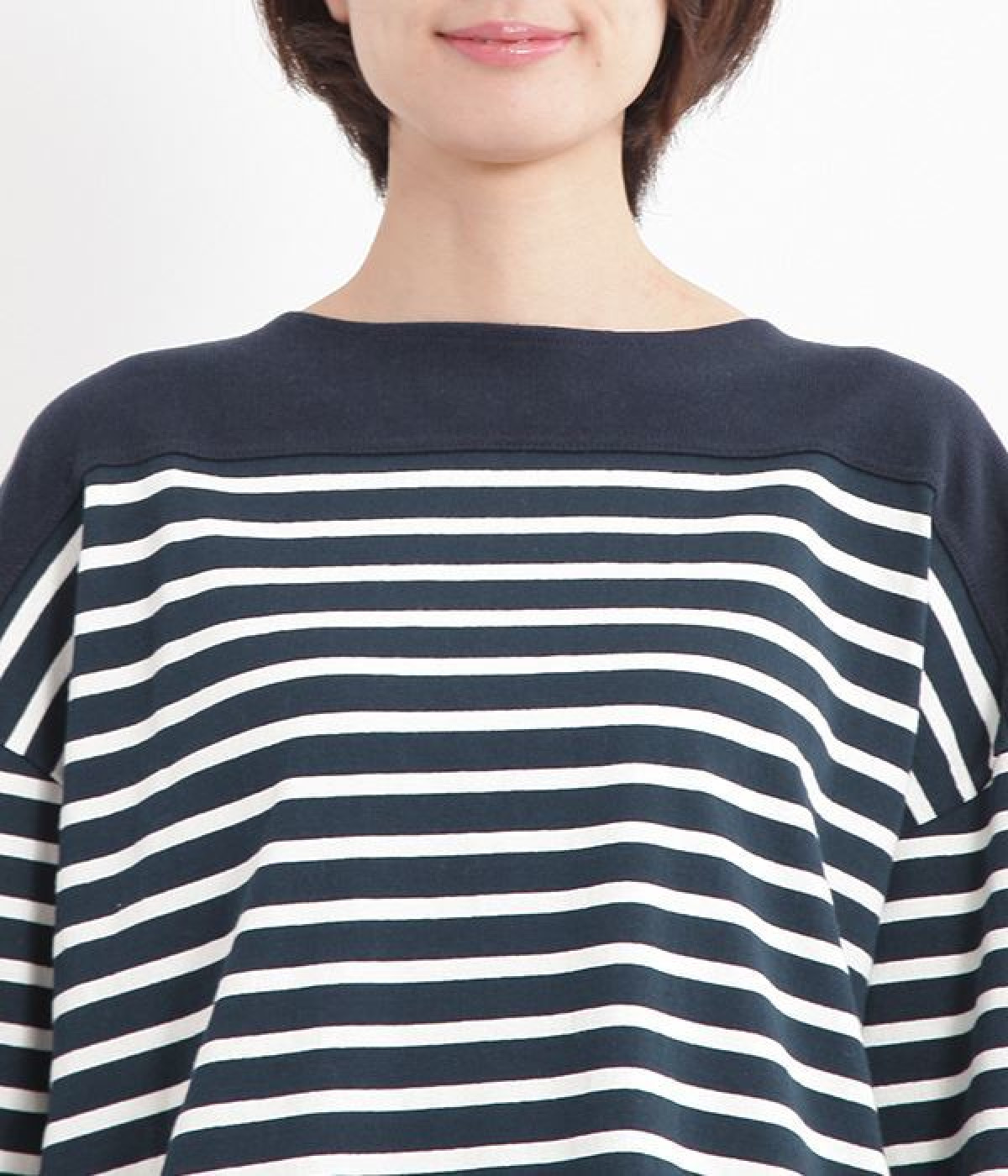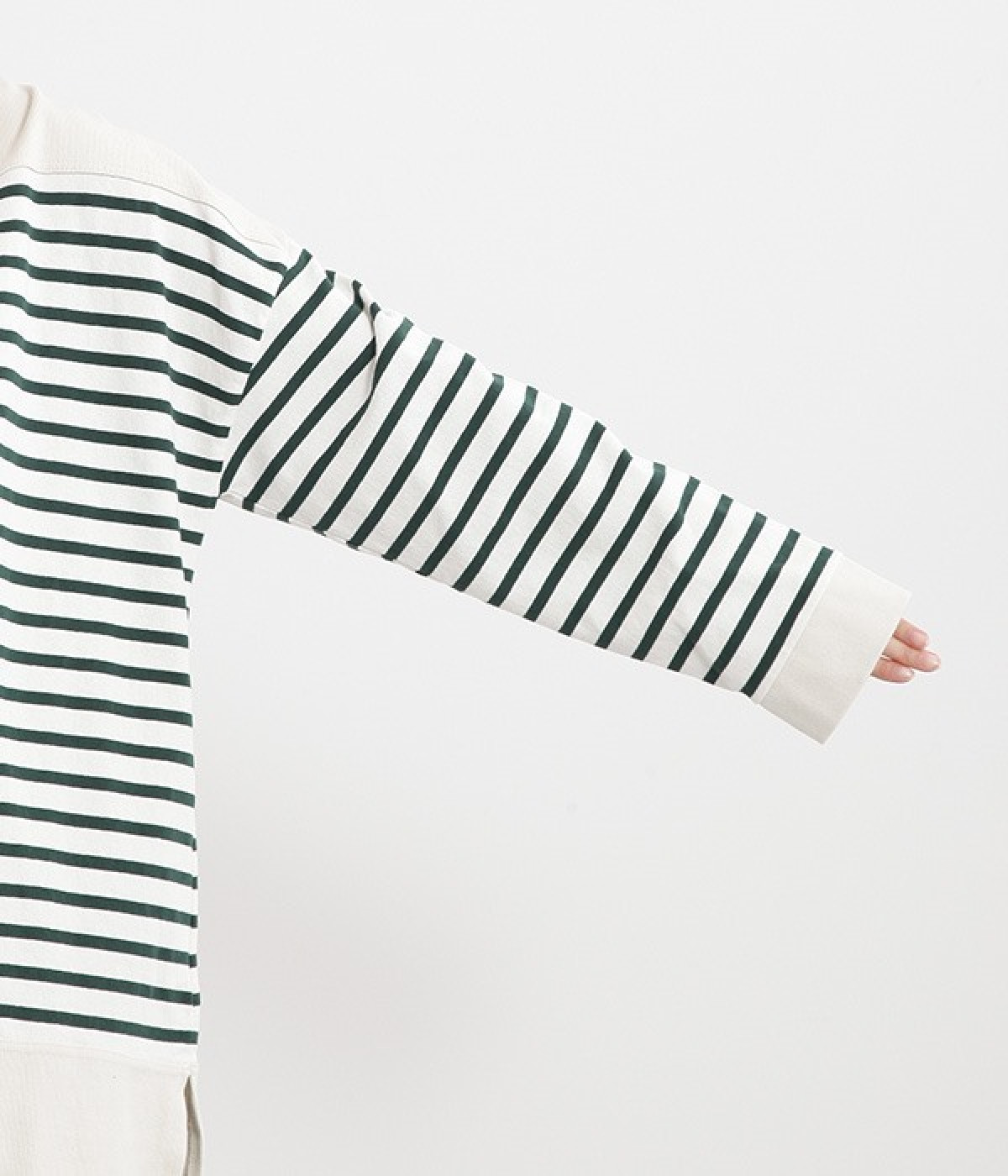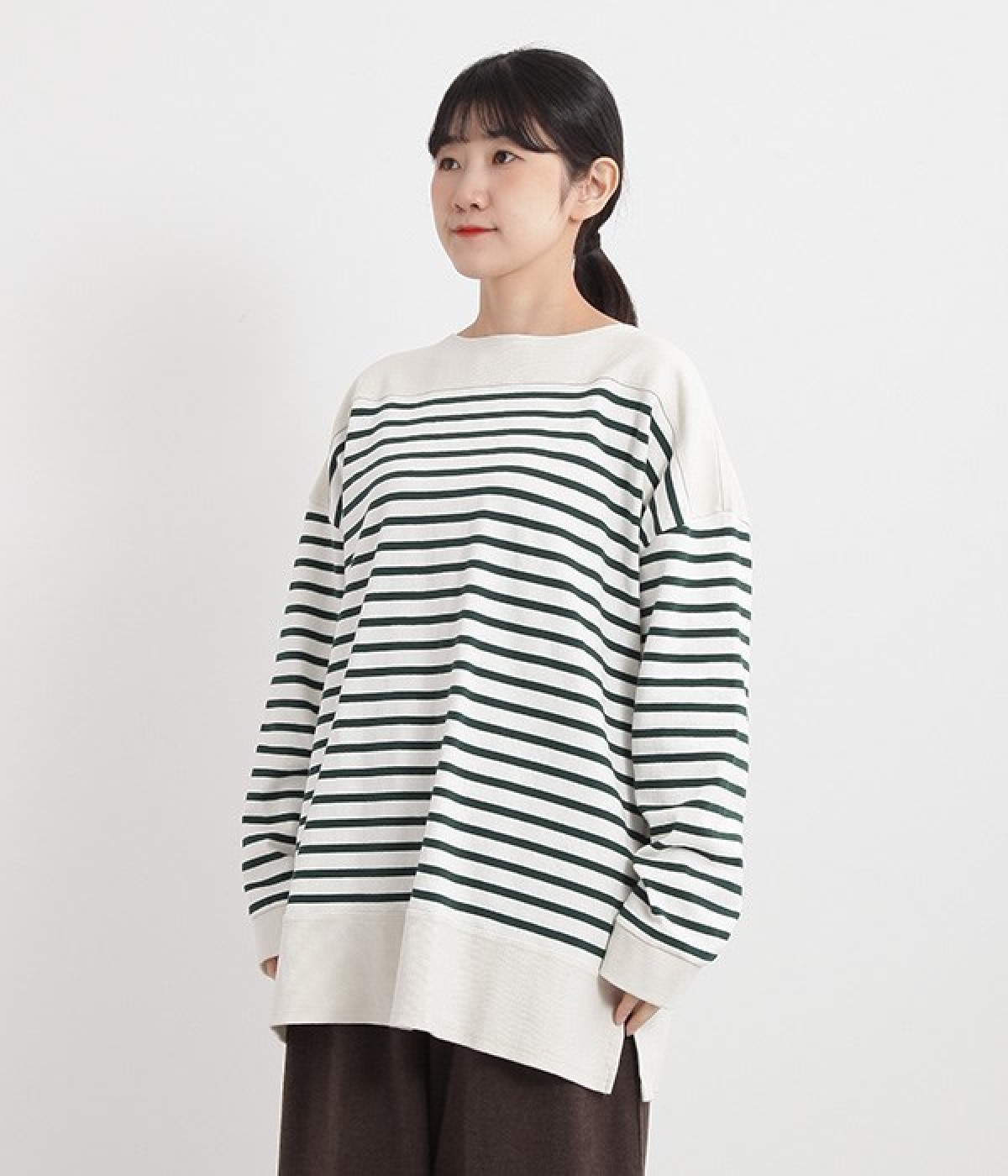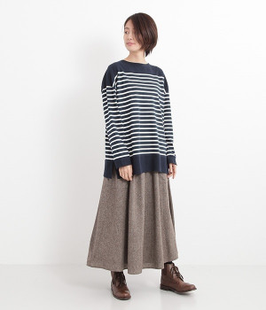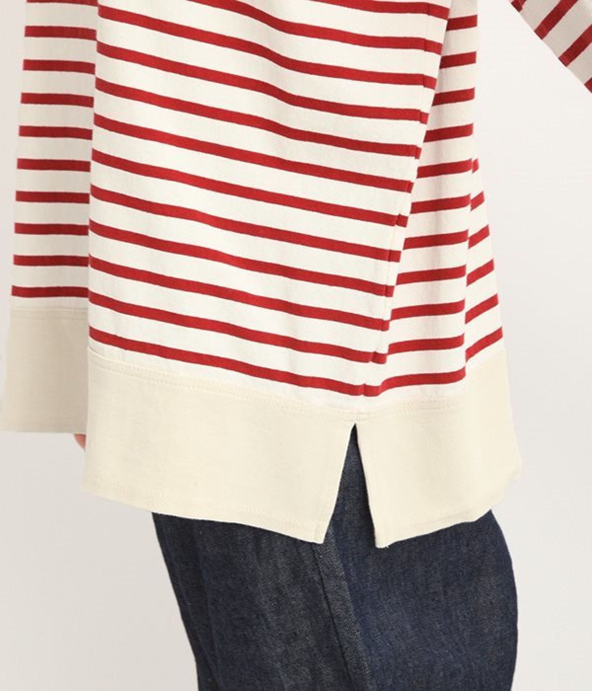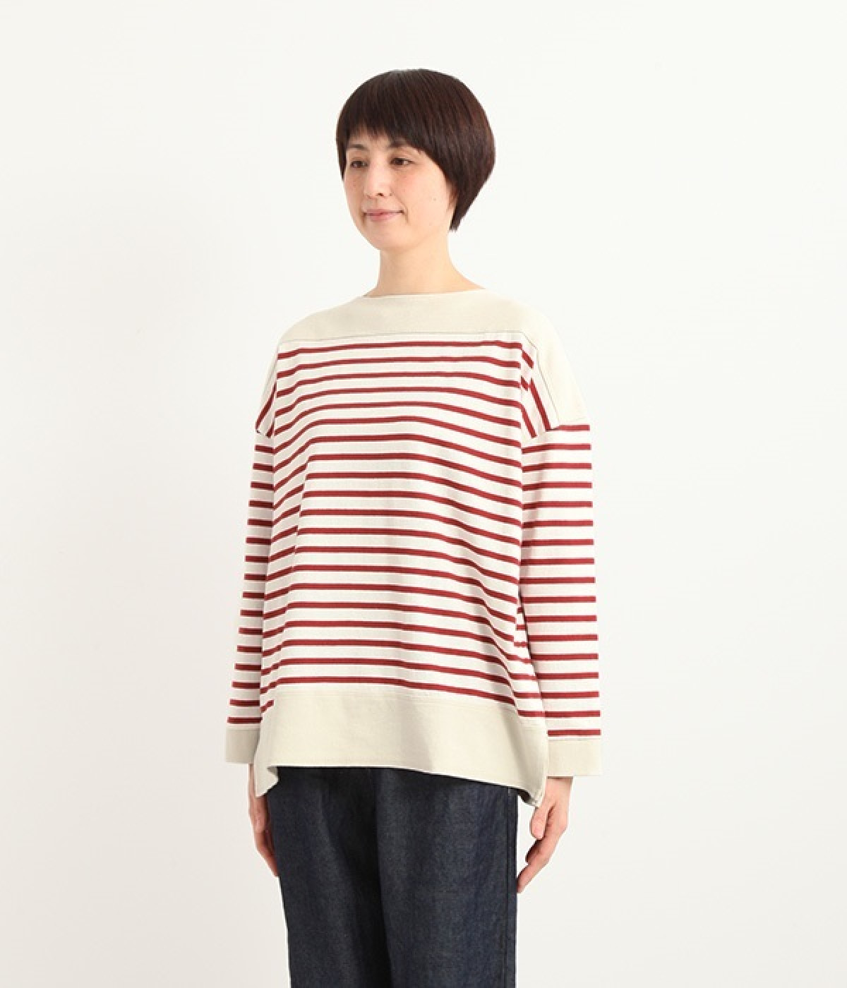 適度な肉感とストレッチの効いたボーダー生地を使用した、ビッグシルエットプルオーバーです。肩まわり、袖口、裾には配色違いのリブをあしらい、普通のボーダーアイテムとはひと味違ったデザインにしています。こなれた印象のドロップショルダーやサイドのスリットなど、きれいな着こなしを実現するさりげないディテールもポイントです。