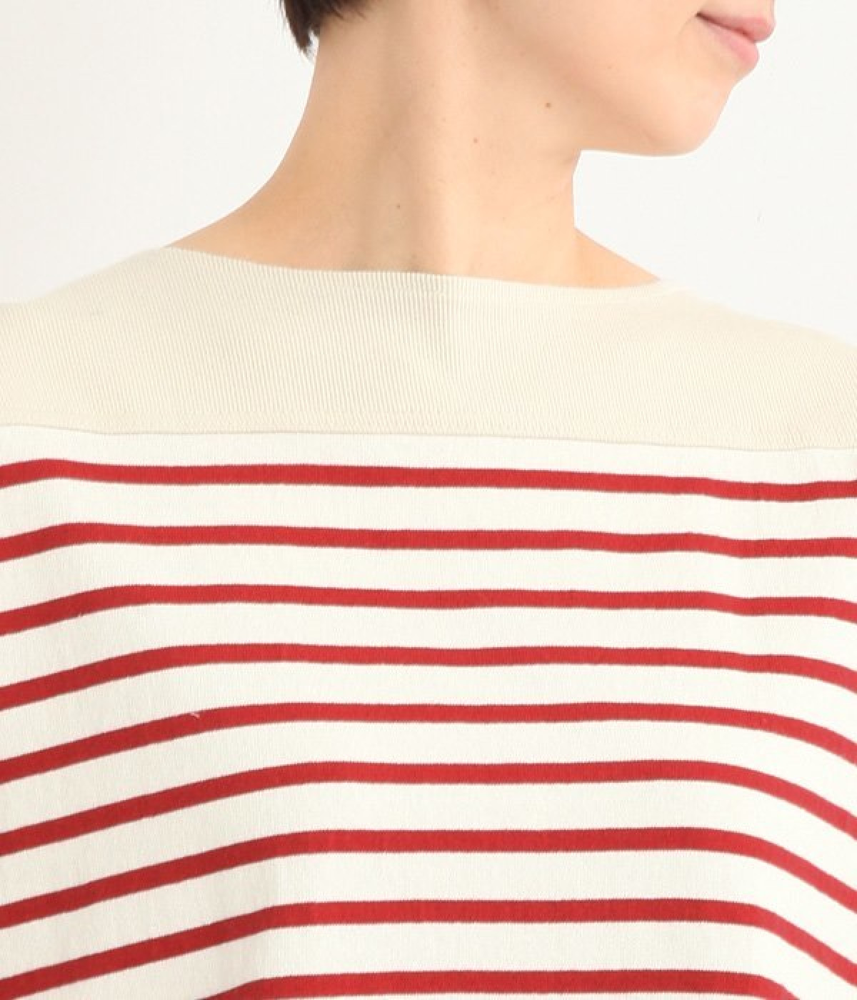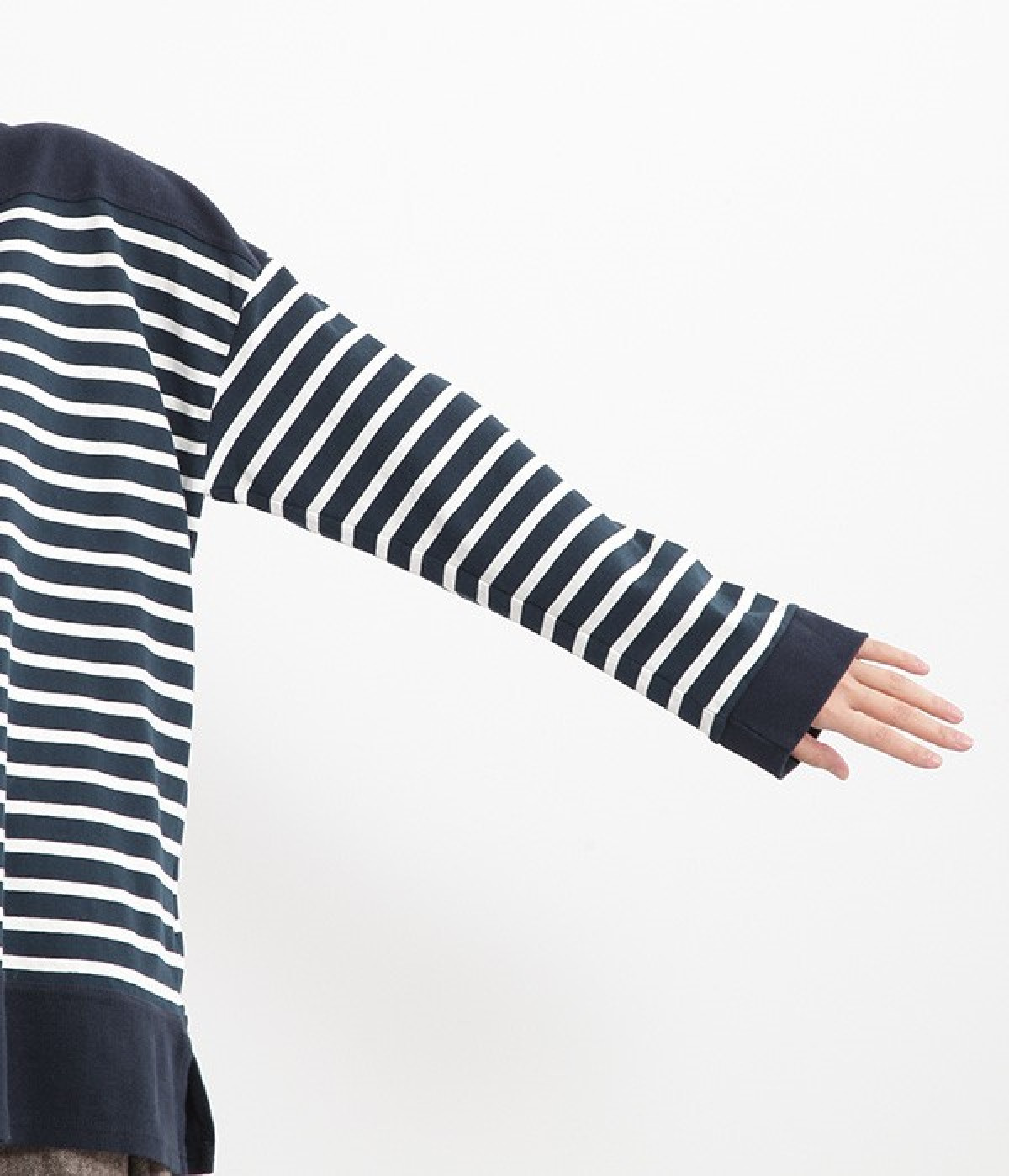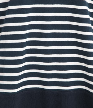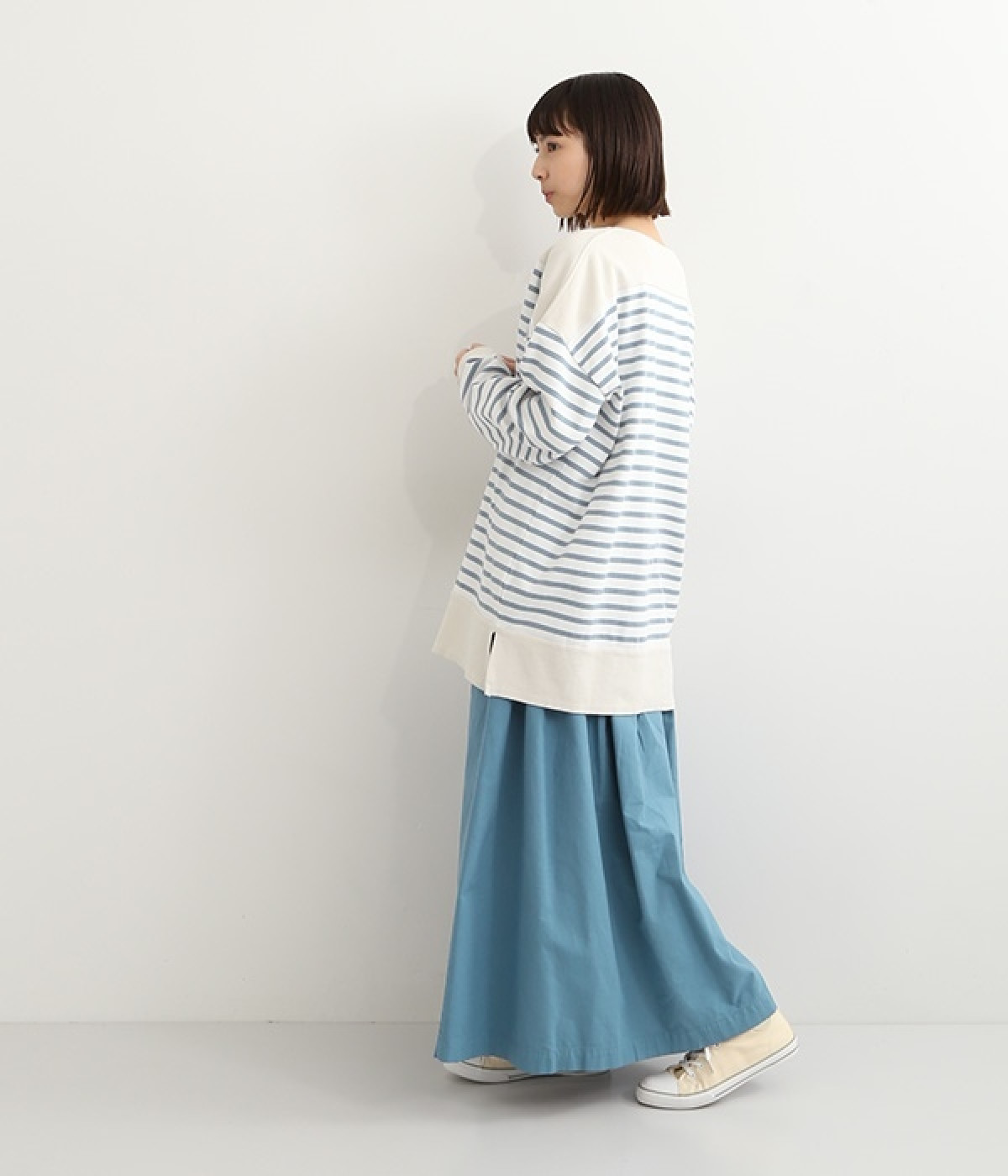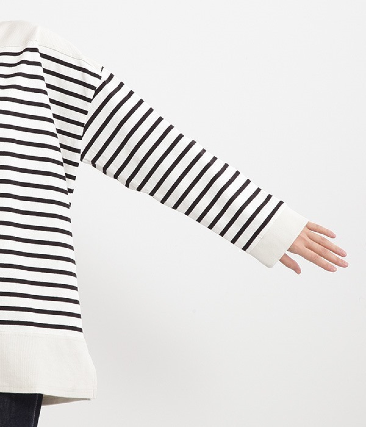 適度な肉感とストレッチの効いたボーダー生地を使用した、ビッグシルエットプルオーバーです。肩まわり、袖口、裾には配色違いのリブをあしらい、普通のボーダーアイテムとはひと味違ったデザインにしています。こなれた印象のドロップショルダーやサイドのスリットなど、きれいな着こなしを実現するさりげないディテールもポイントです。