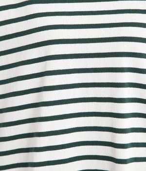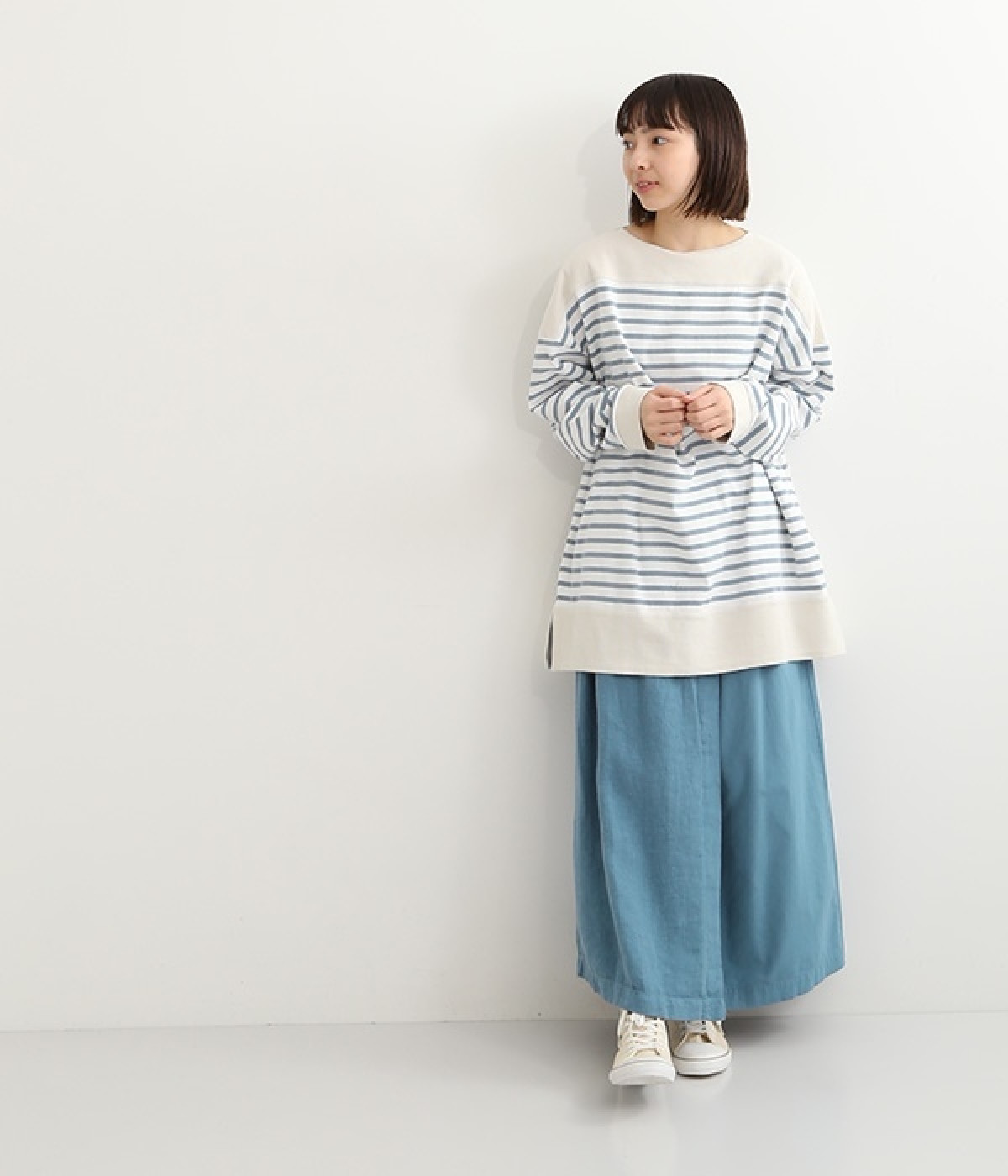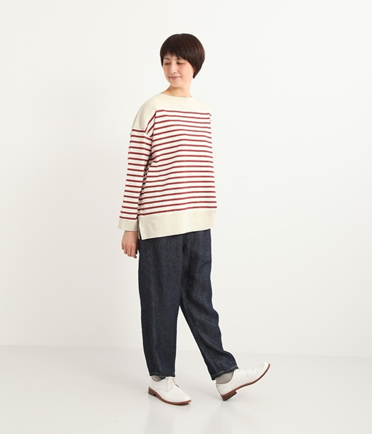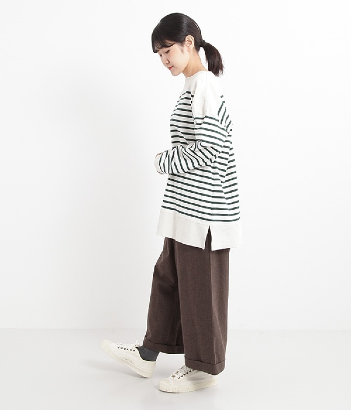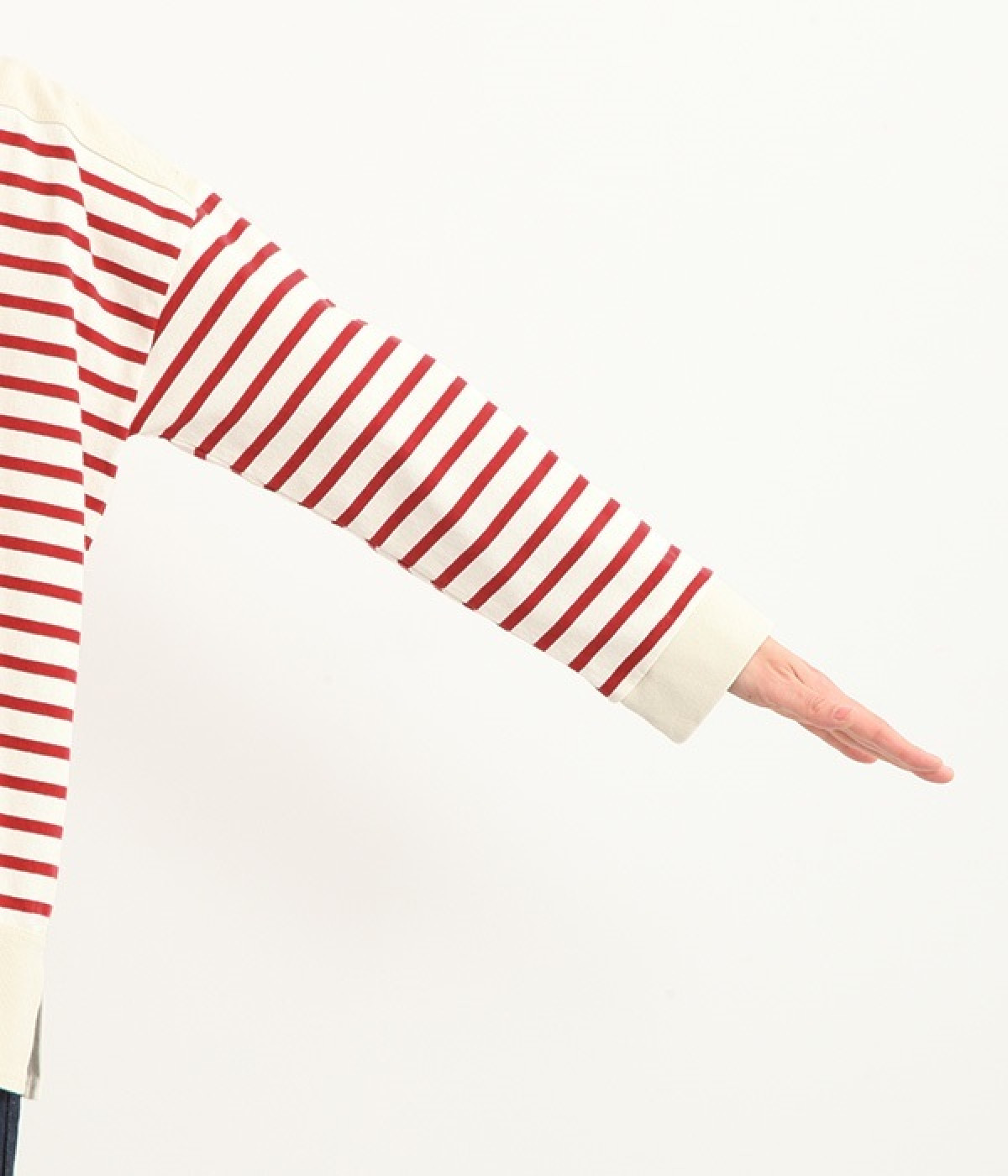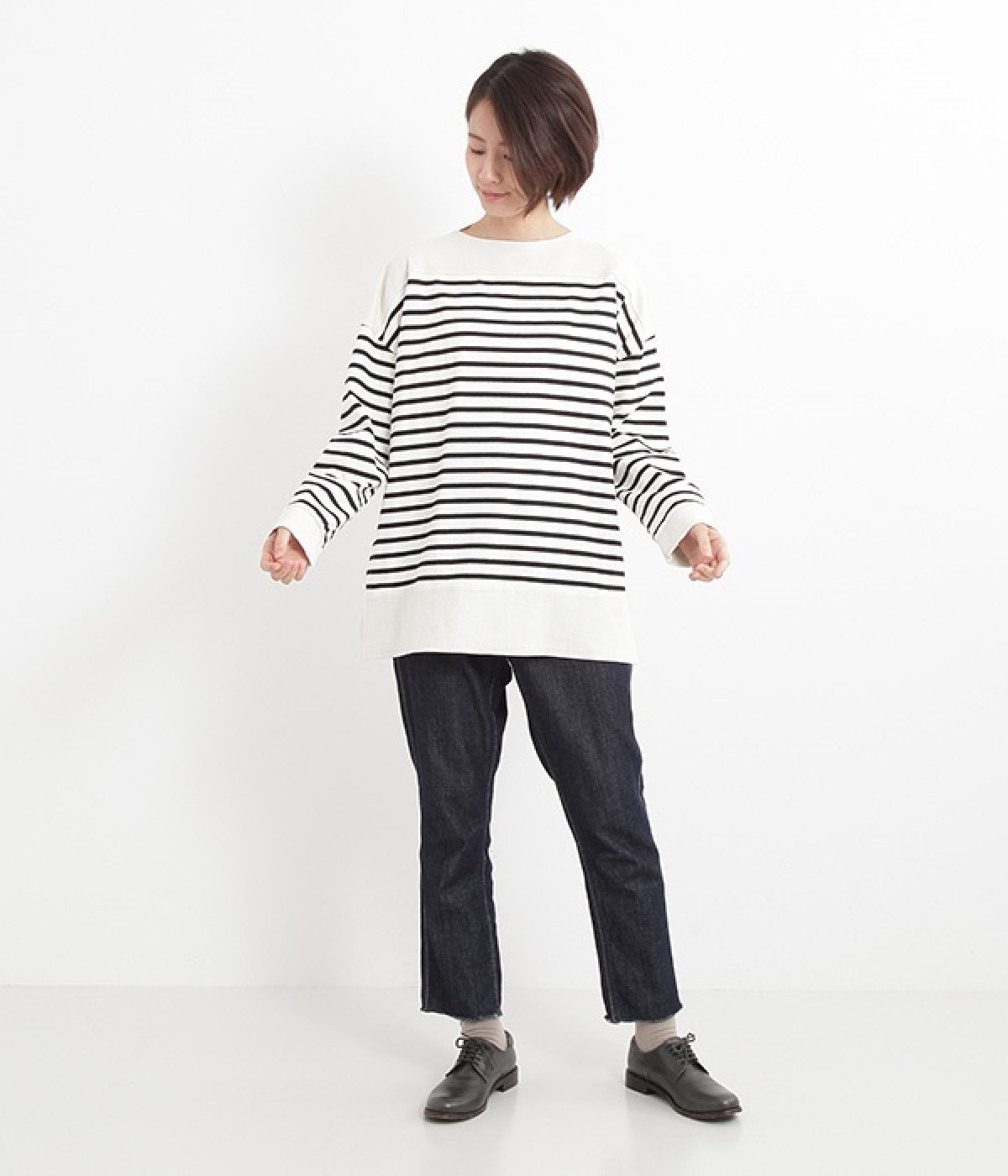 適度な肉感とストレッチの効いたボーダー生地を使用した、ビッグシルエットプルオーバーです。肩まわり、袖口、裾には配色違いのリブをあしらい、普通のボーダーアイテムとはひと味違ったデザインにしています。こなれた印象のドロップショルダーやサイドのスリットなど、きれいな着こなしを実現するさりげないディテールもポイントです。