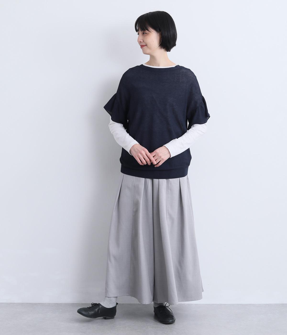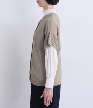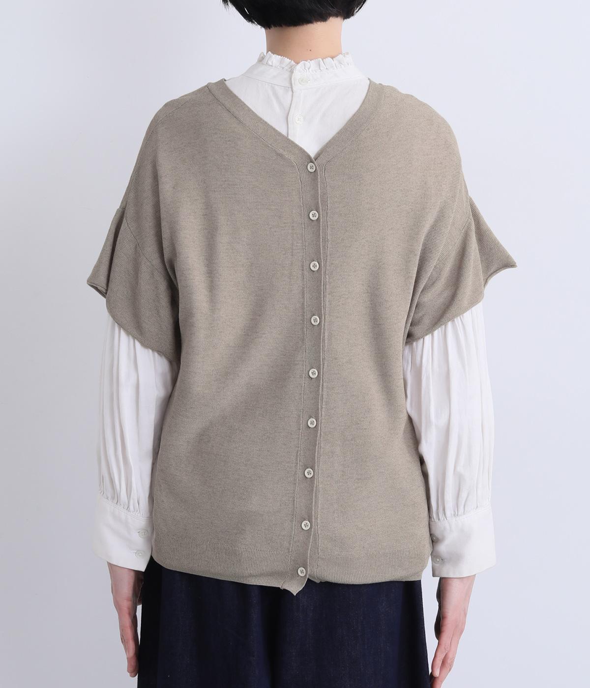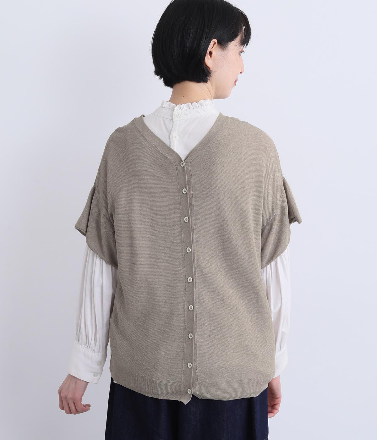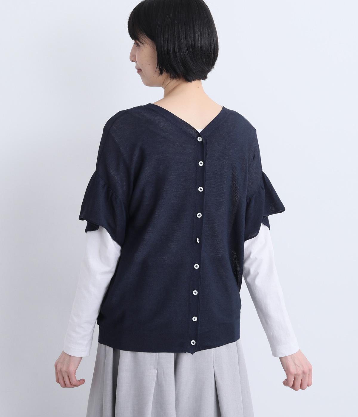 フレアスリーブで女性らしいニュアンスを足したニットプルオーバー。ボタンあきでカーディガンのように羽織ったり、後ろあきにしたり、前後2wayで着こなしの幅も広がります。しなやかな落ち感があり、レイヤードスタイルも品よくまとめてくれる一枚。