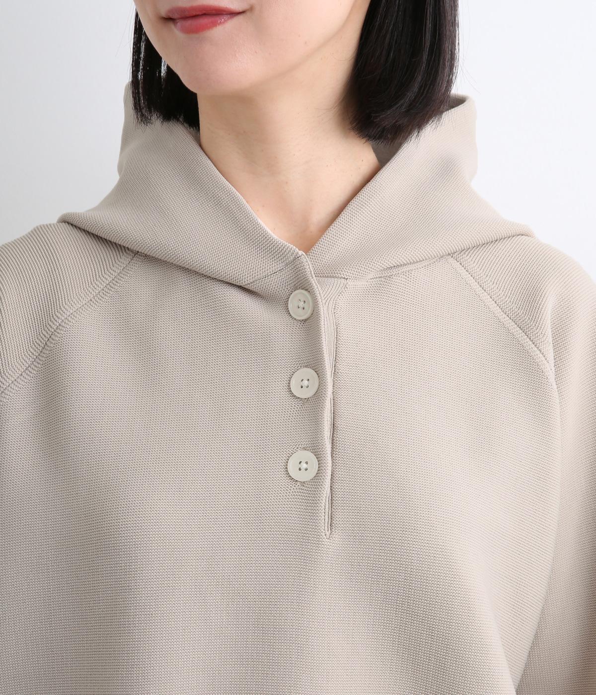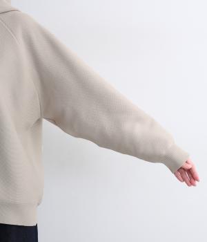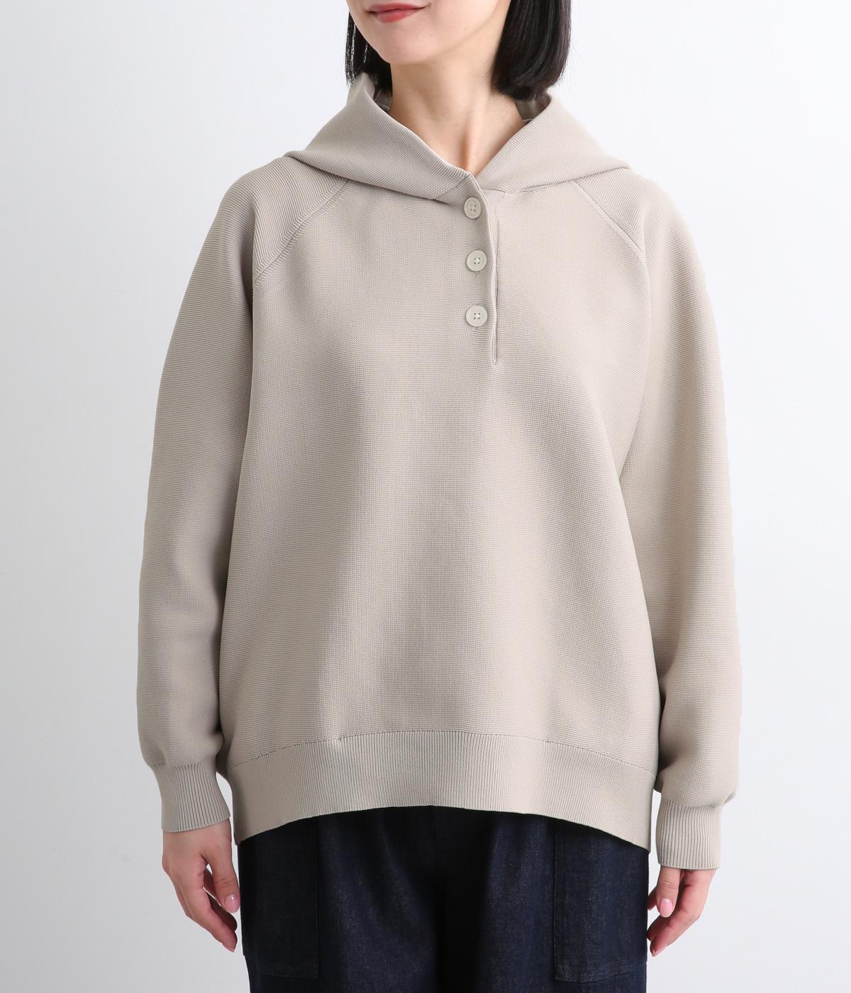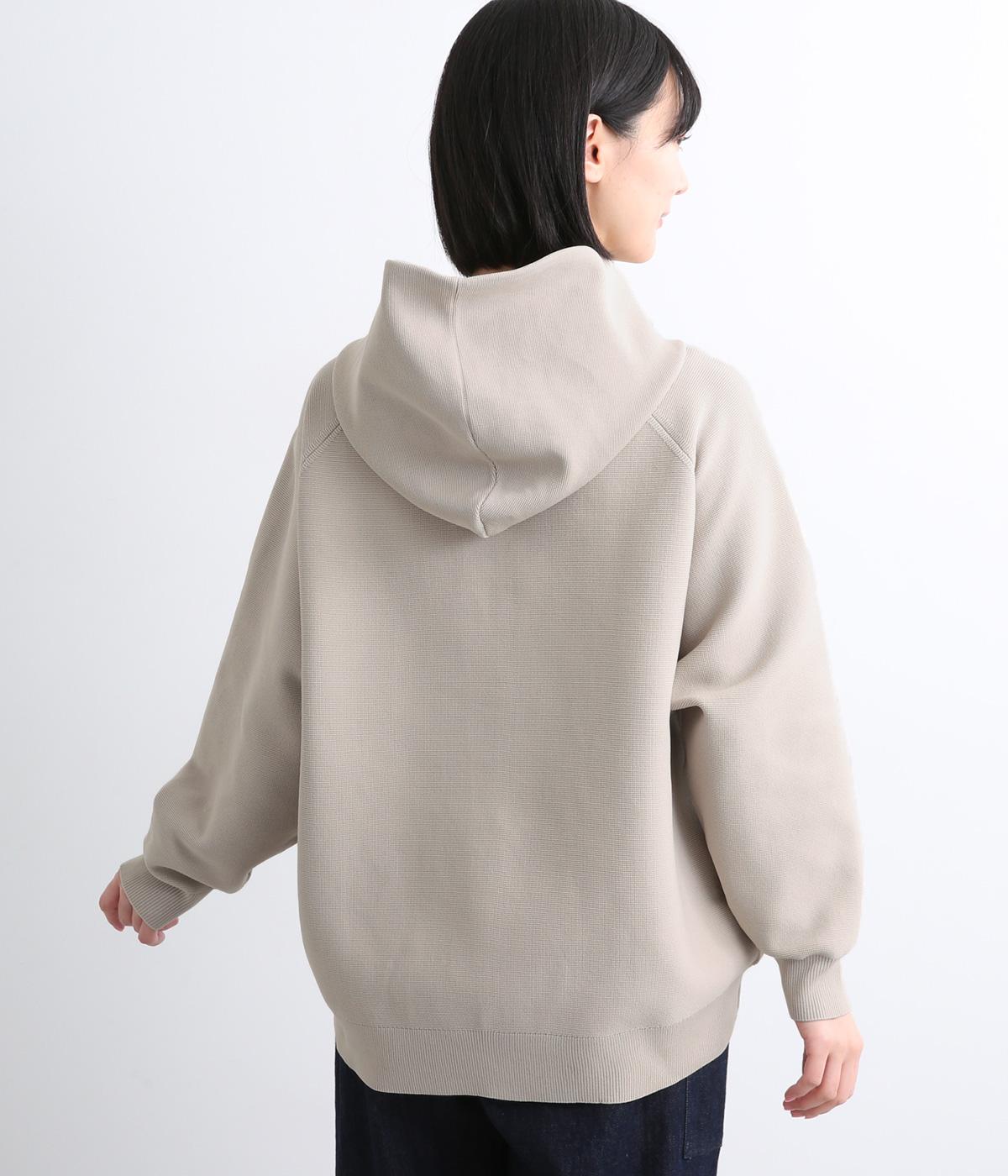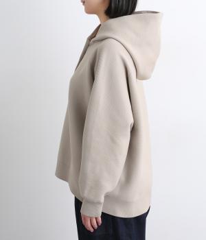 ガーター編みの表面感が、やさしい表情をつくるフーディーです。ヘンリーネックがカジュアル感を後押し。ラグラン袖が肩まわりをすっきりと見せ、動きやすさも確保しました。ポケットを備え、実用性もばっちりです。