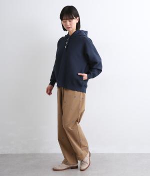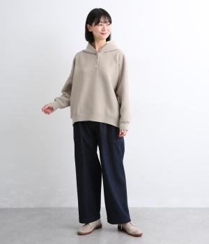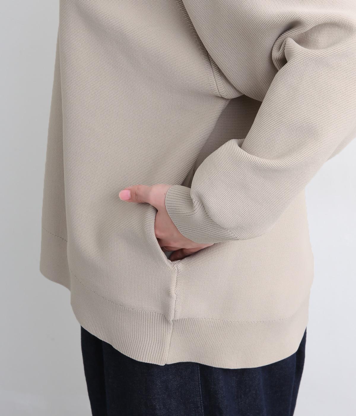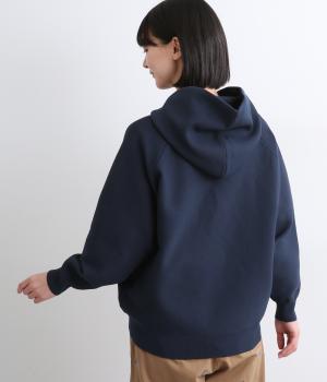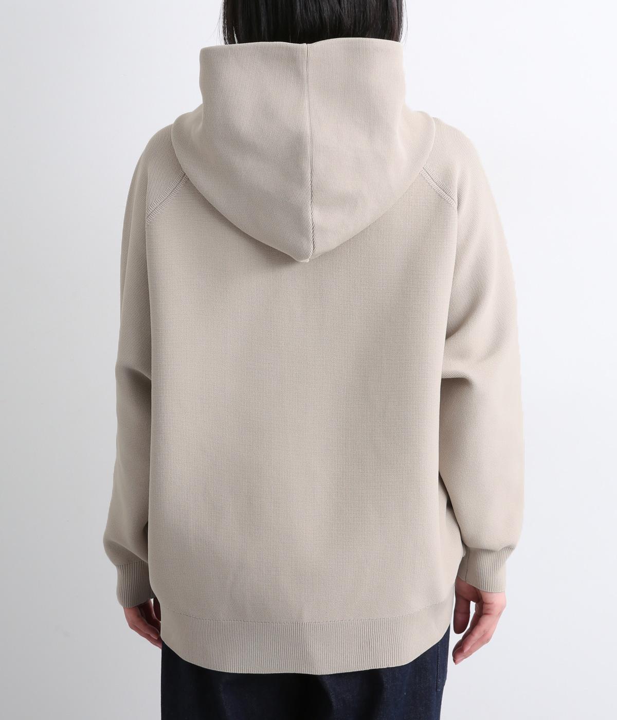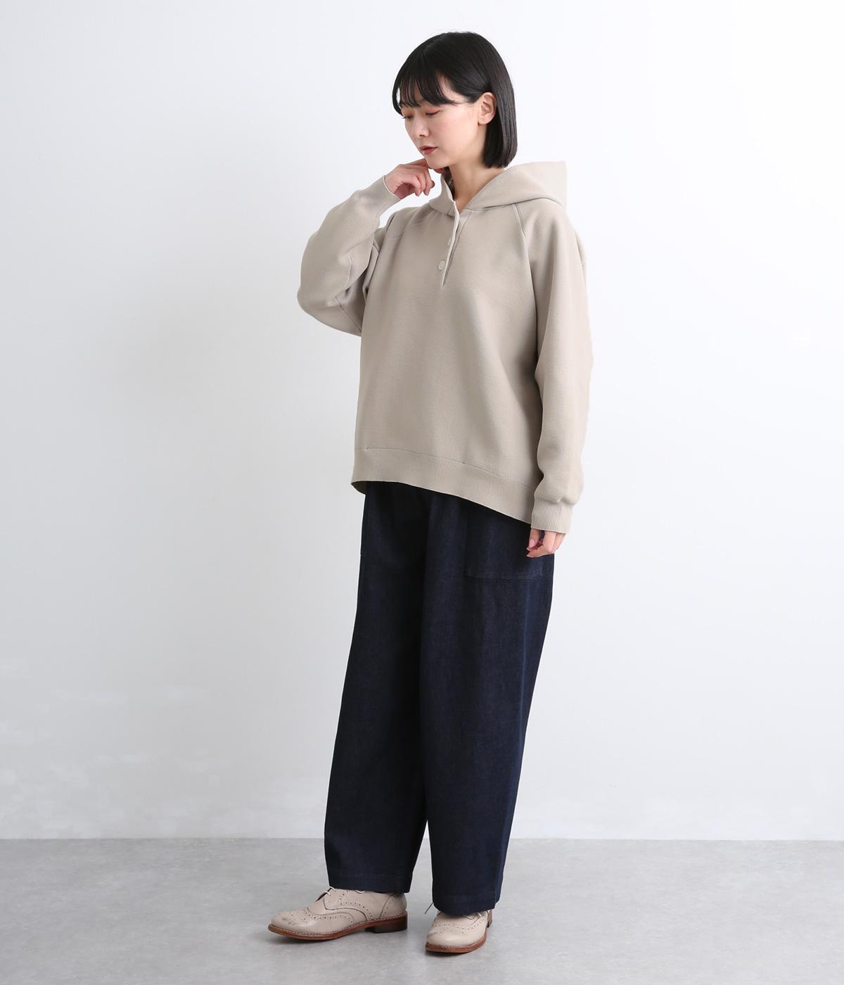 ガーター編みの表面感が、やさしい表情をつくるフーディーです。ヘンリーネックがカジュアル感を後押し。ラグラン袖が肩まわりをすっきりと見せ、動きやすさも確保しました。ポケットを備え、実用性もばっちりです。