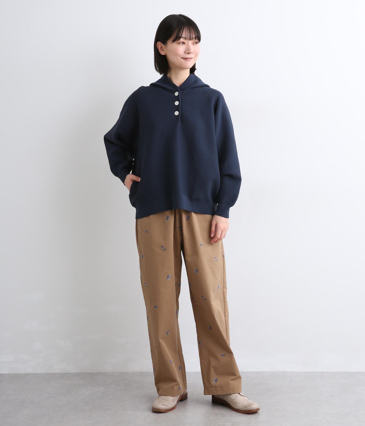 伸縮性がありシワになりにくいポリエステル生地を使用しています。手洗いできて扱いやすくデイリーになじみます。フードの内側にはやわらかな別布を合わせました。
