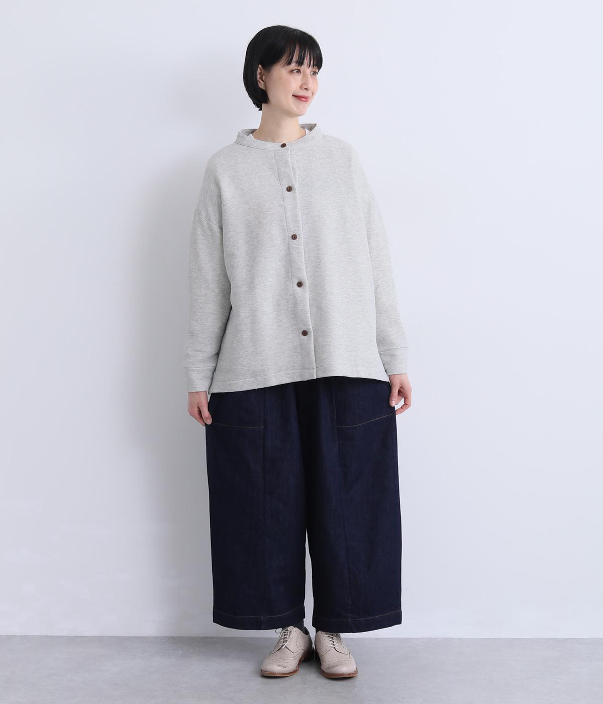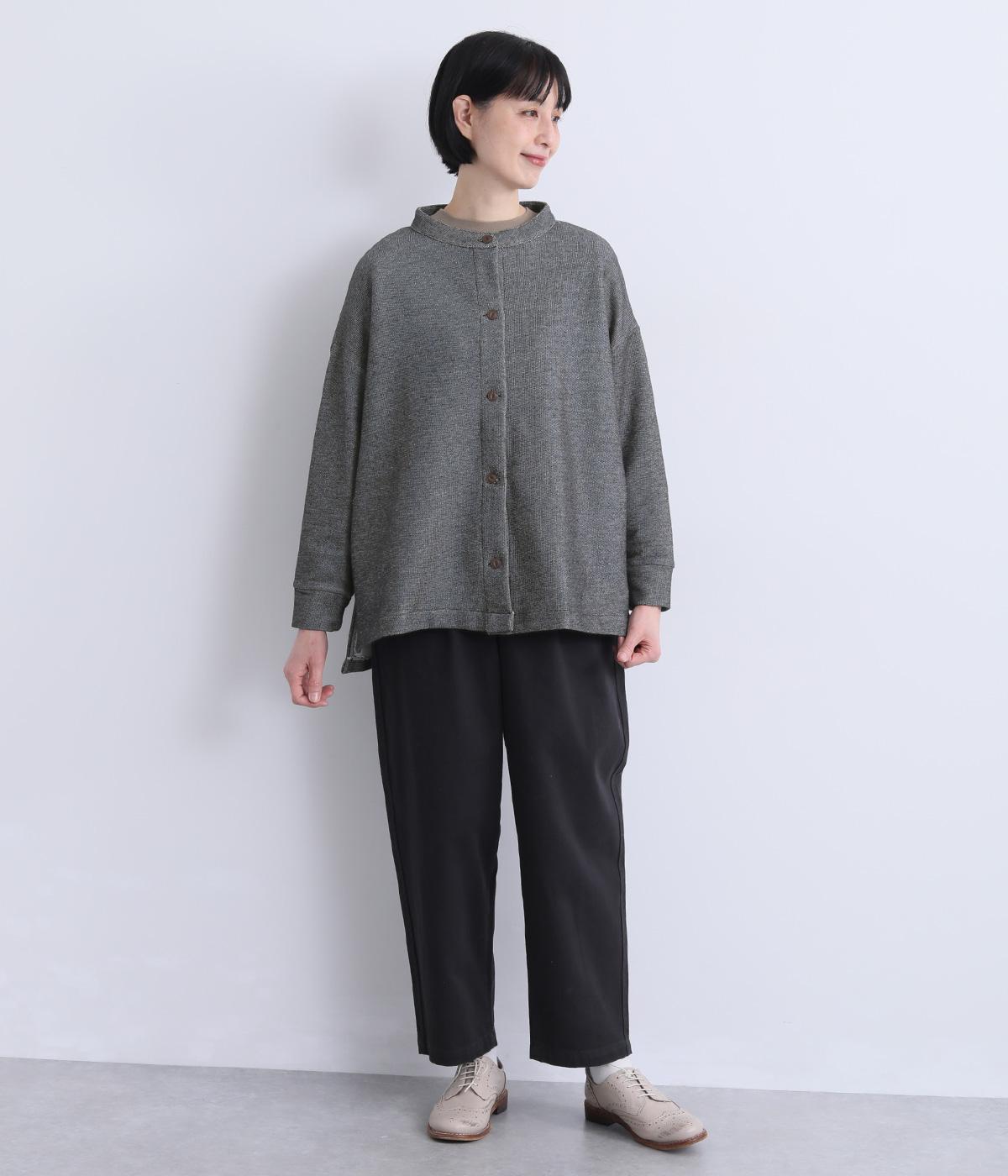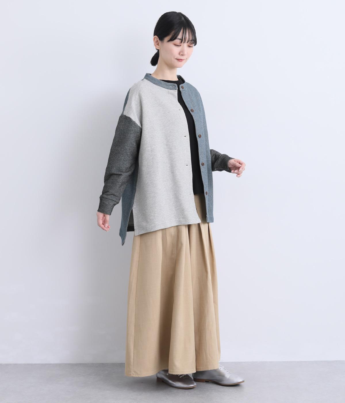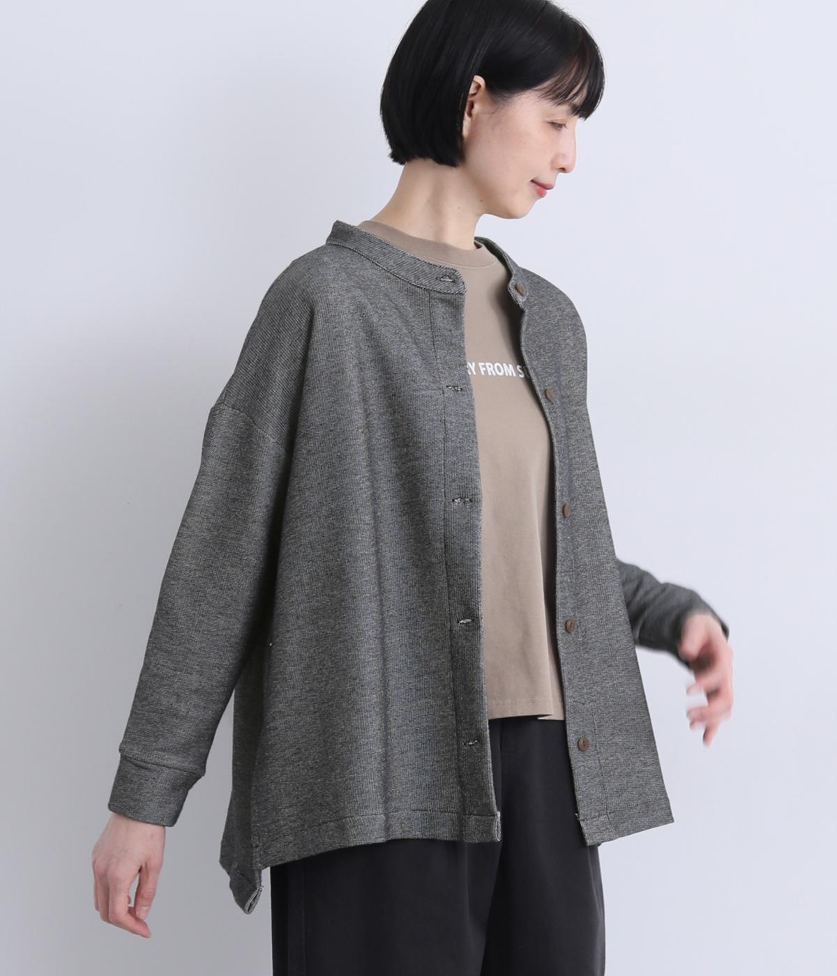 身幅にややゆとりを持たせてラフに羽織りやすいワイドカーディガン。すこし立ち上がったクルーネックが顔まわりに適度な抜け感を与えます。前後差のある着丈にサイドスリット入りでボトム合わせもすっきりと。