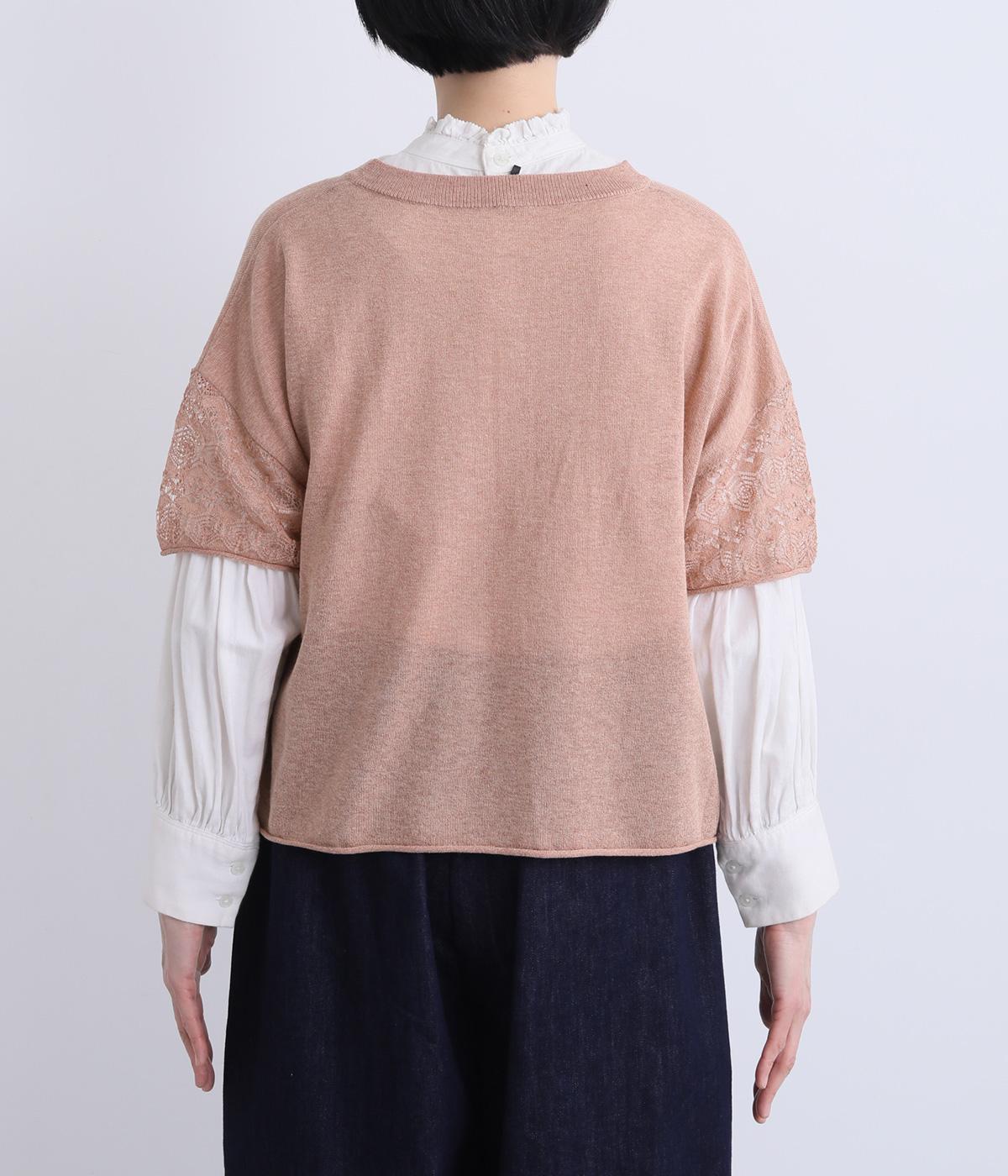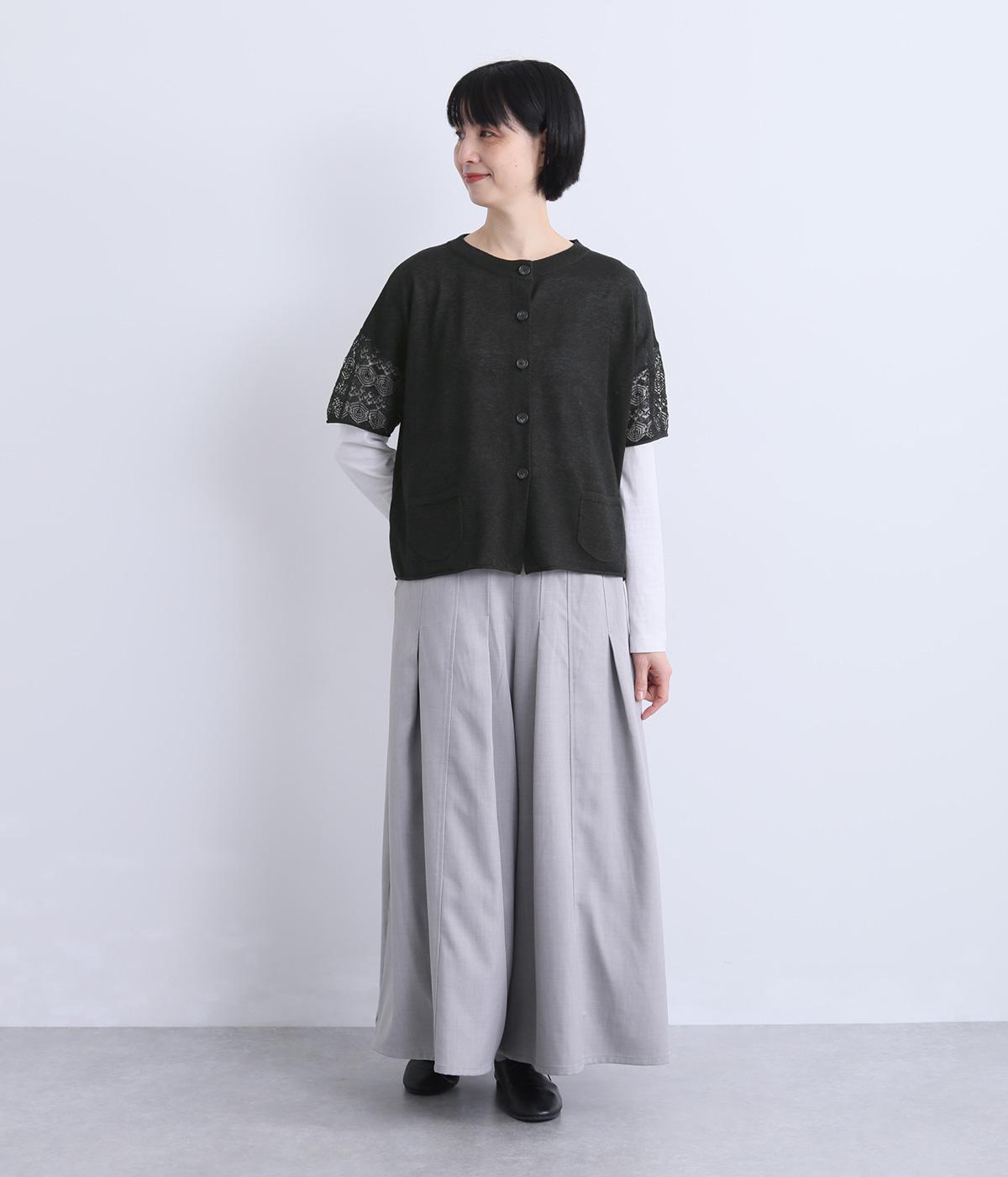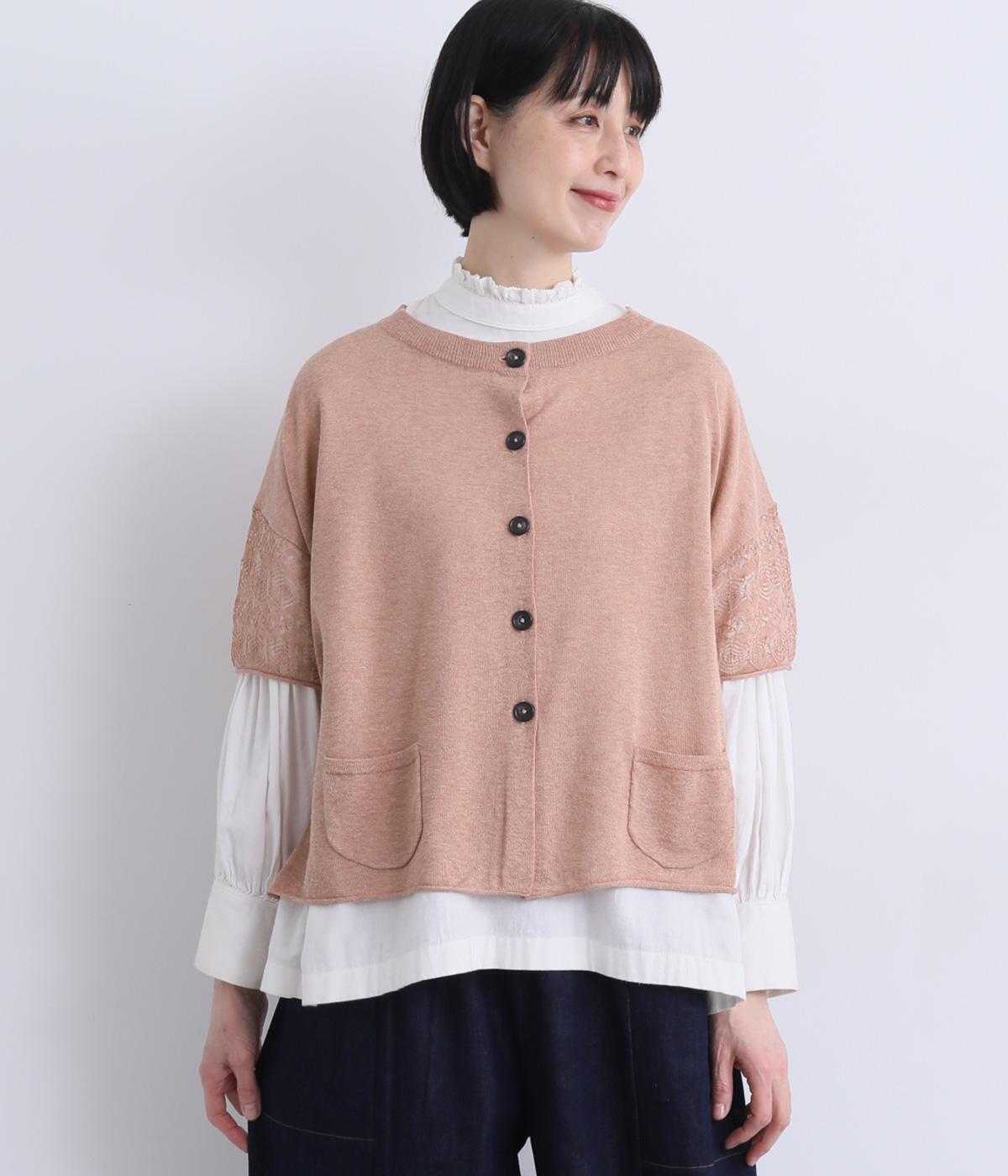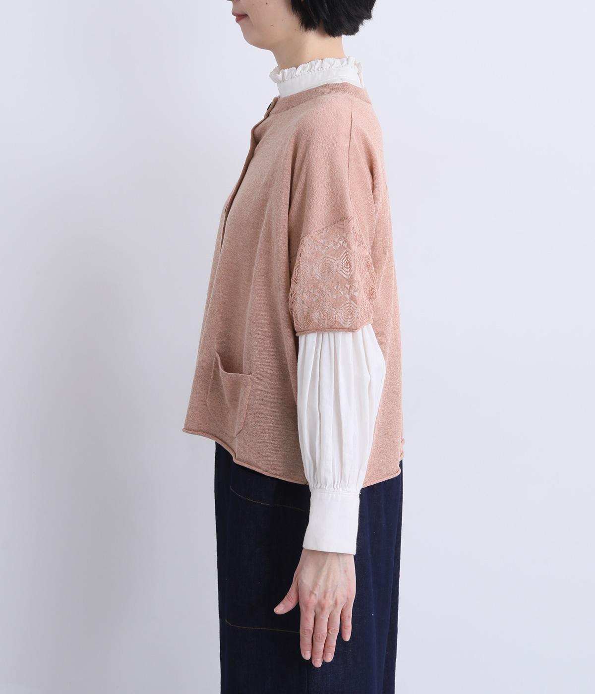 袖をレース編みにすることでグッと雰囲気を高めたニットカーディガン。裾のロールエッジがきめすぎないラフさを演出しつつ、きれいめなニットで大人な一枚に。ちょこんとついた丸いポケットが愛らしいワンポイントになっています。