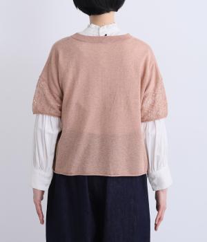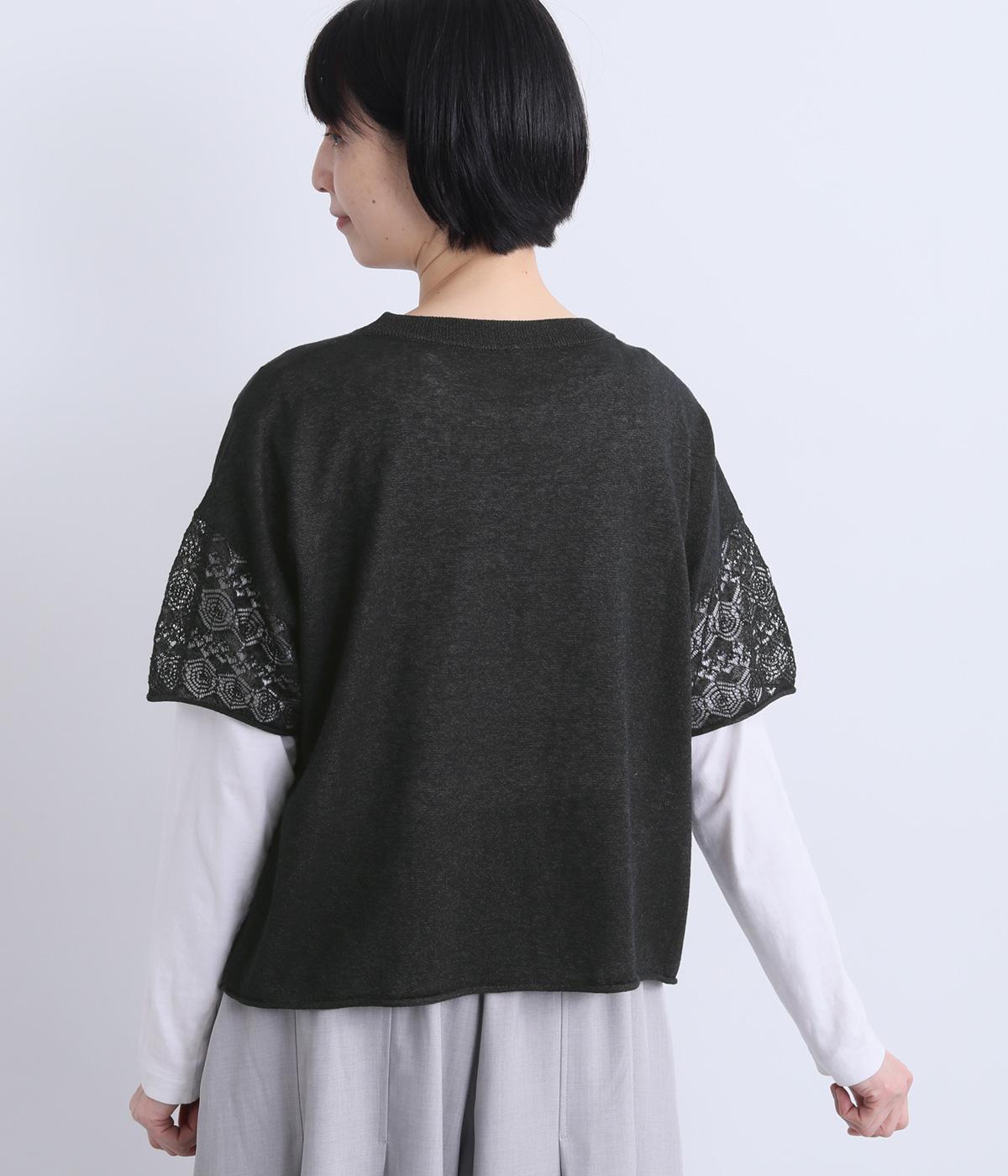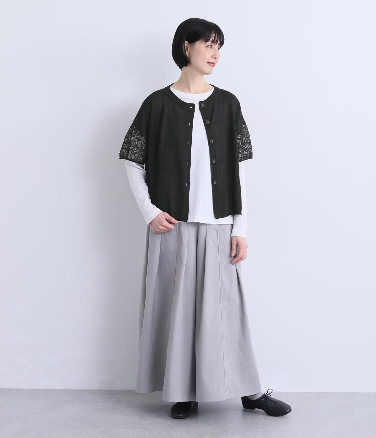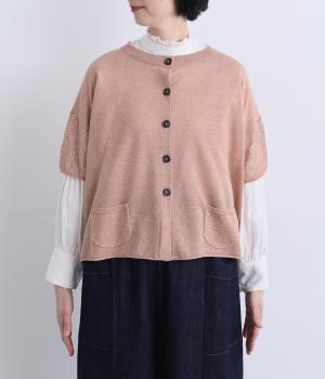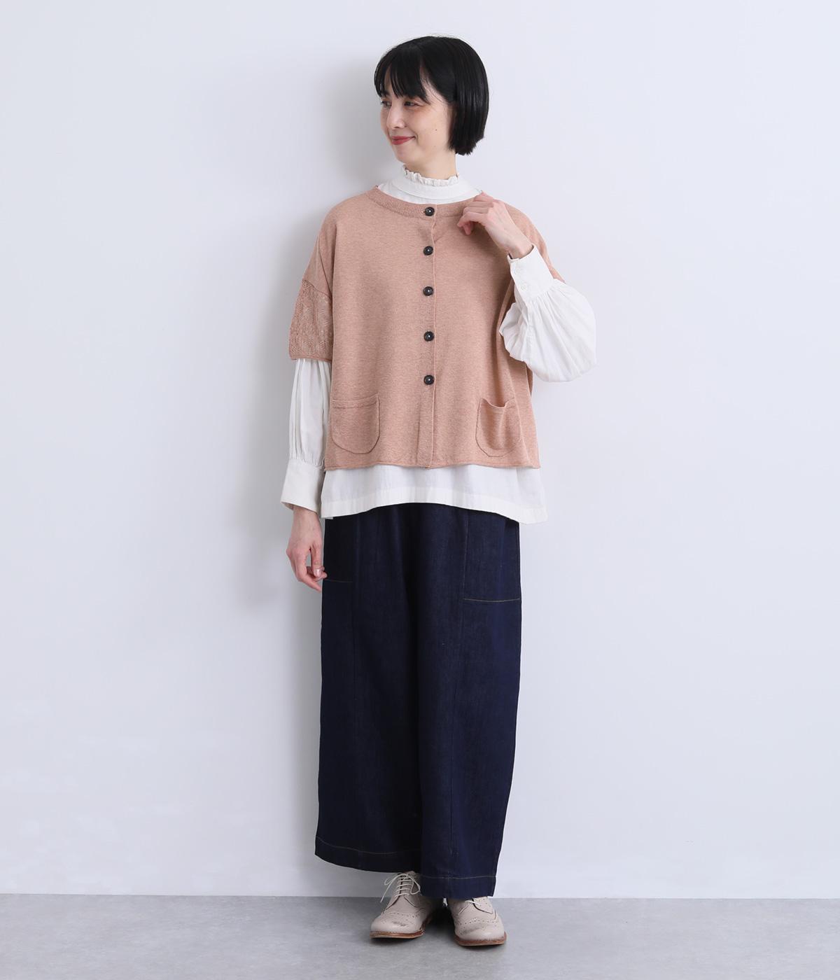 袖をレース編みにすることでグッと雰囲気を高めたニットカーディガン。裾のロールエッジがきめすぎないラフさを演出しつつ、きれいめなニットで大人な一枚に。ちょこんとついた丸いポケットが愛らしいワンポイントになっています。
