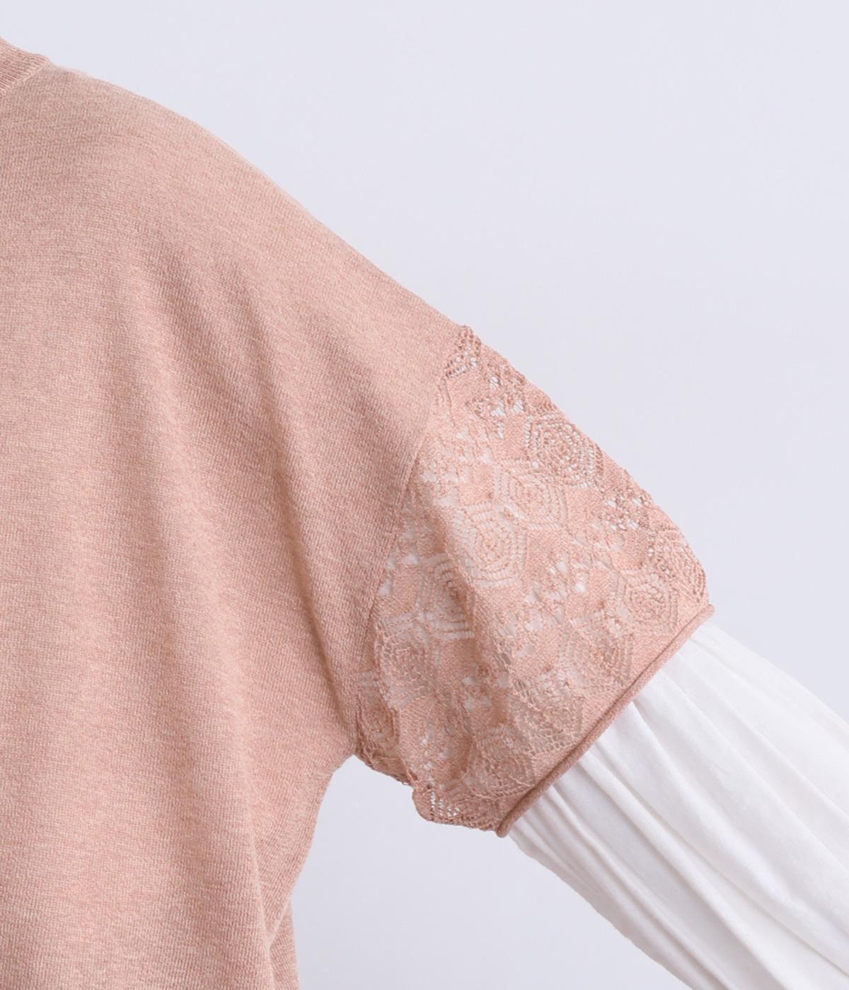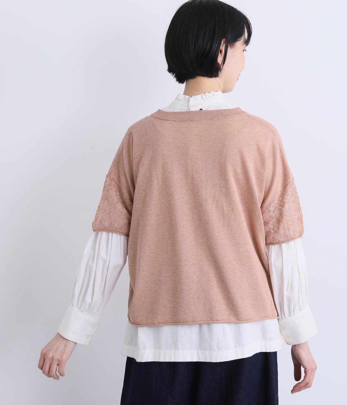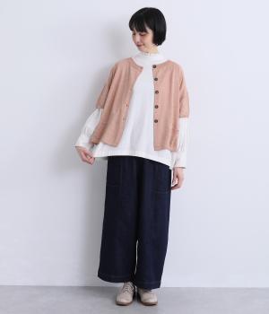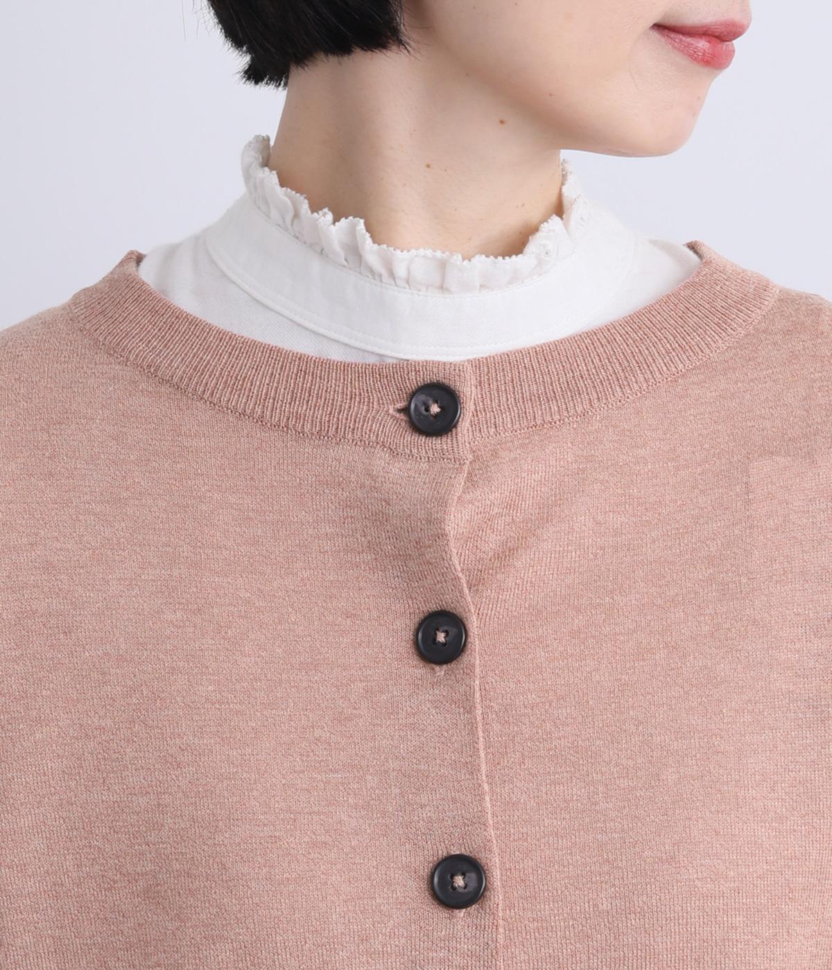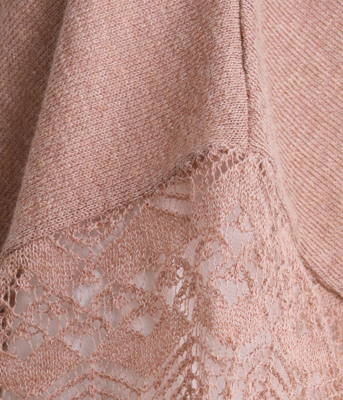 袖をレース編みにすることでグッと雰囲気を高めたニットカーディガン。裾のロールエッジがきめすぎないラフさを演出しつつ、きれいめなニットで大人な一枚に。ちょこんとついた丸いポケットが愛らしいワンポイントになっています。