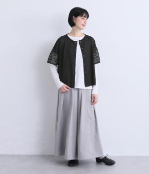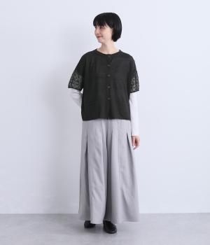 シャリ感のある肌触りにやわらかで伸びのいい混紡ニットが着心地の良さを運びます。薄手で軽やかさがあり、ほのかな光沢感がきれいめな印象です。