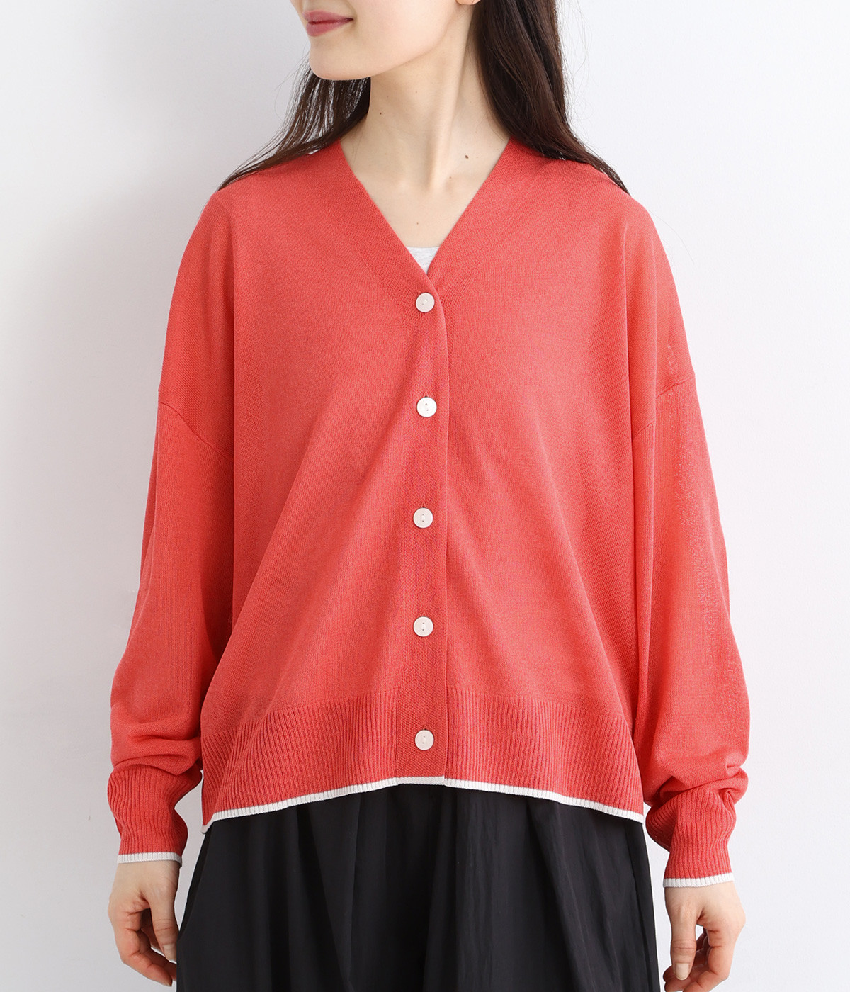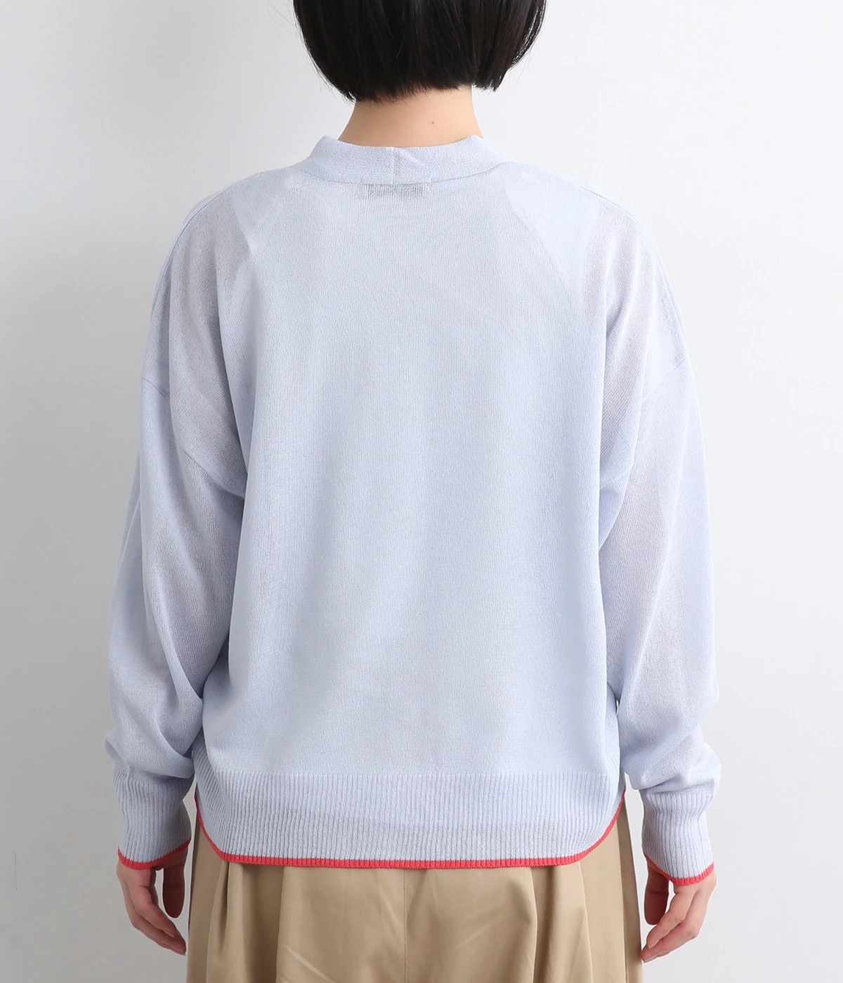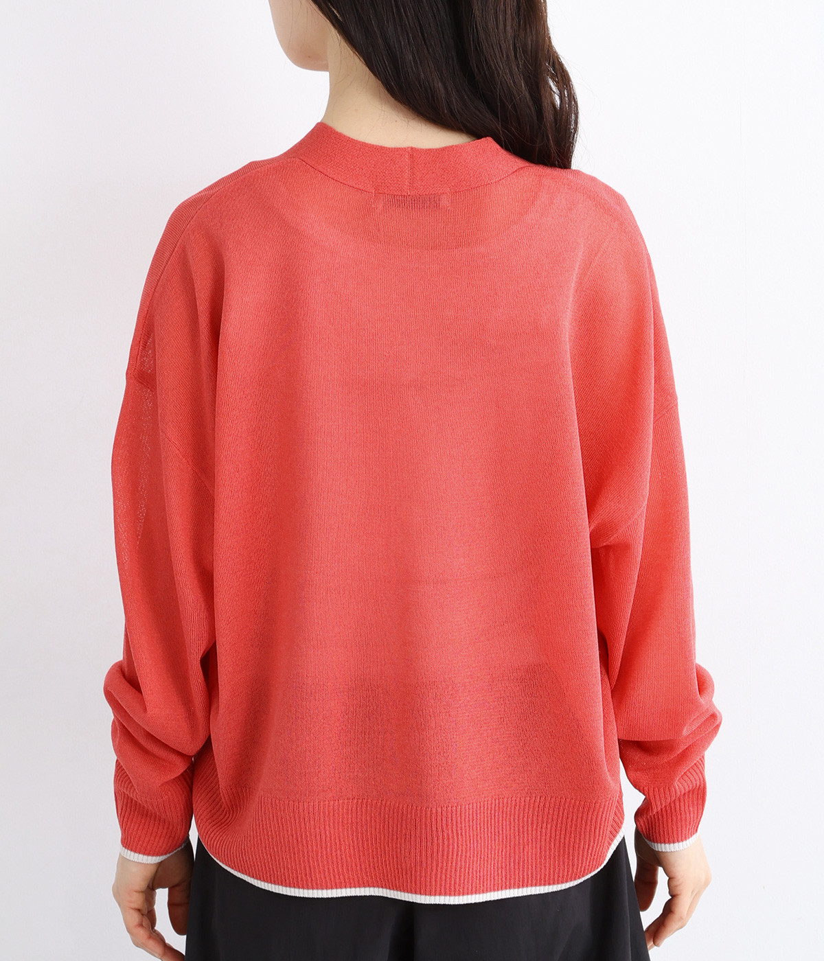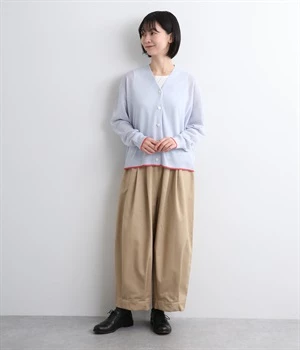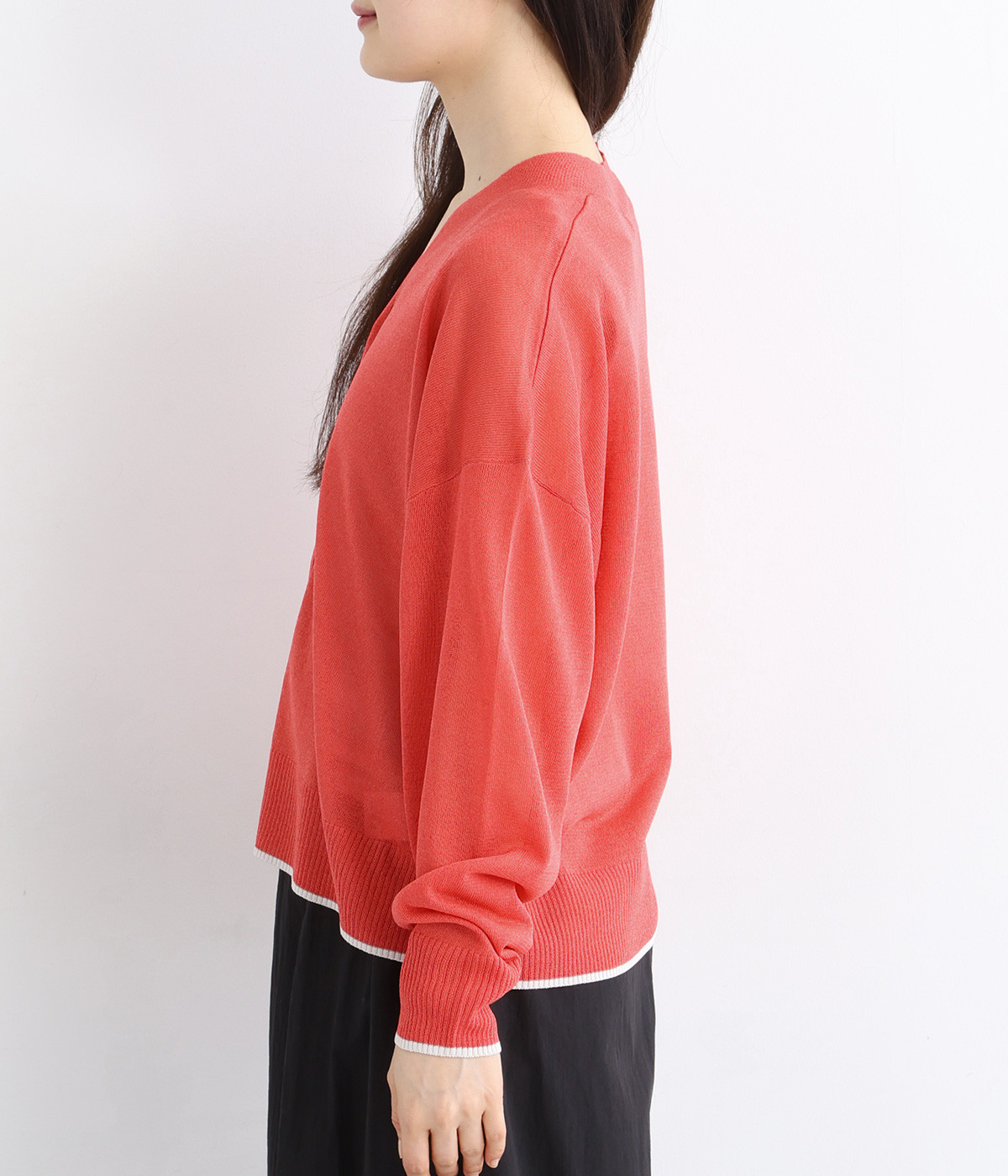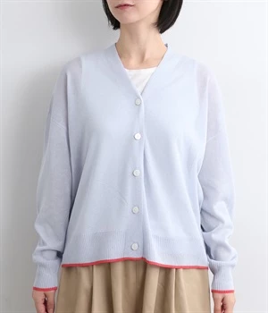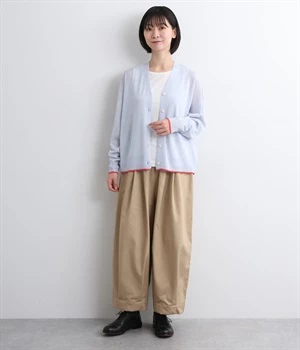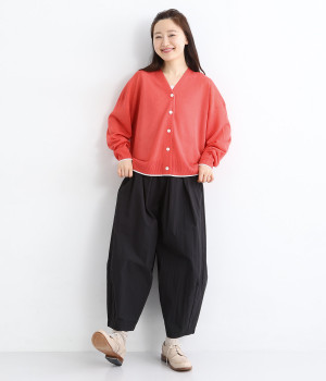顔まわりをシャープに見せるほどよい開きのVネック。裾には配色ラインをあしらってメリハリをつけました。つやめくボタンにはロゴをデザインしてさり気ないアクセントに。ドロップショルダー&ワイドシルエットがゆったりとした雰囲気をかもし出しています。