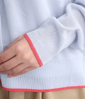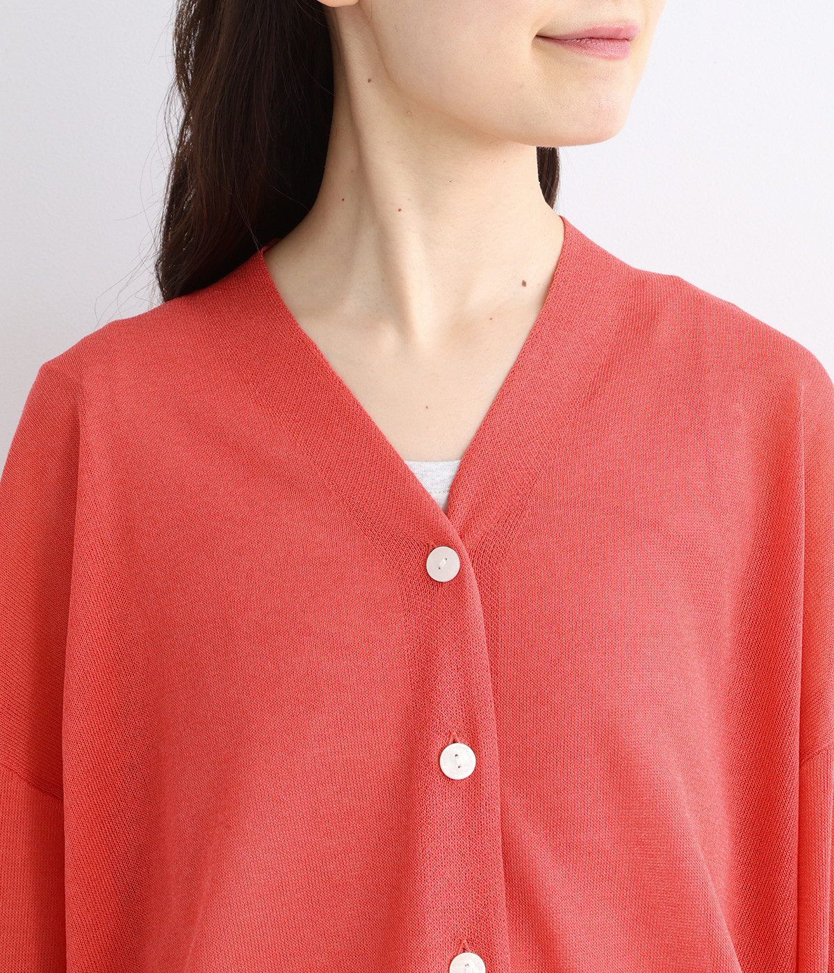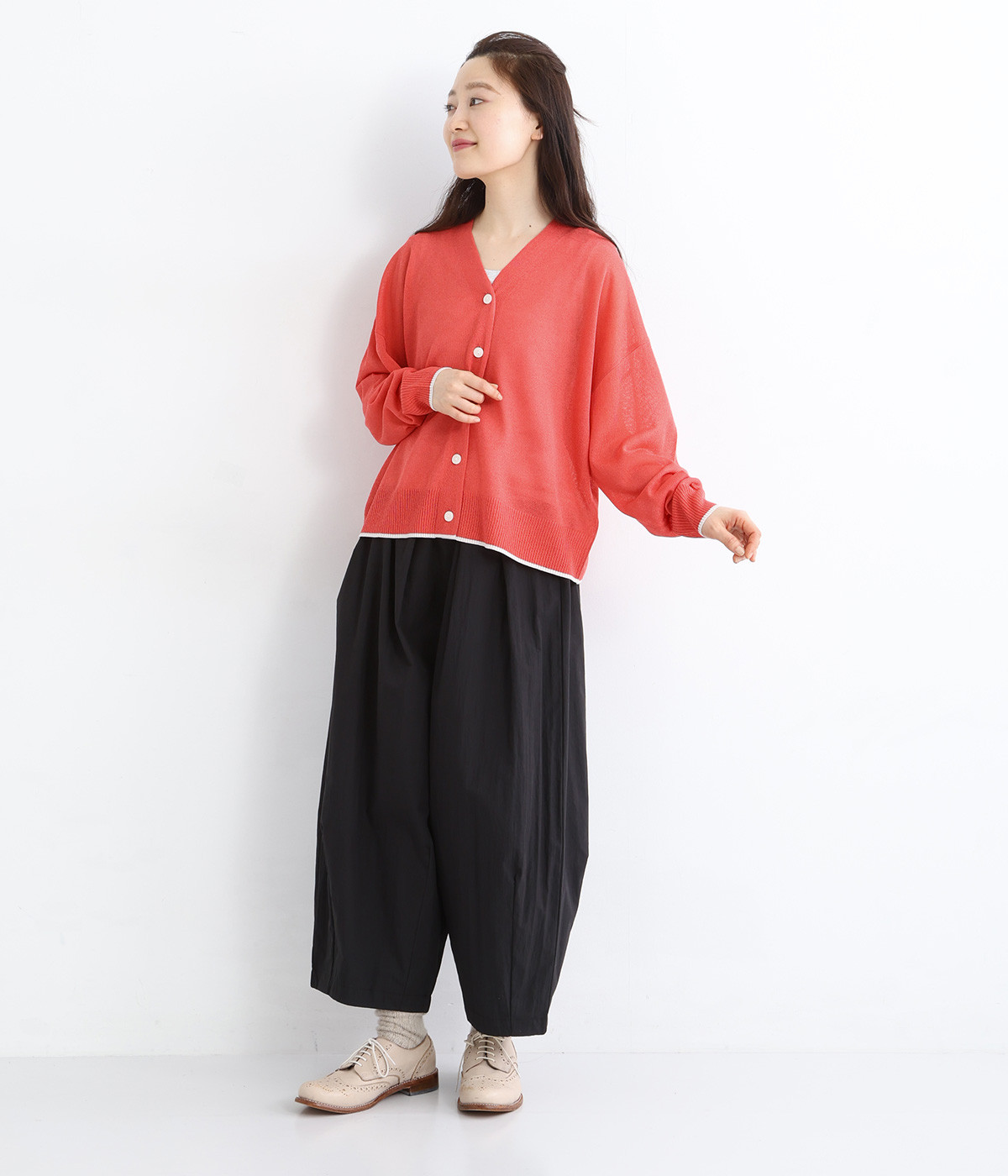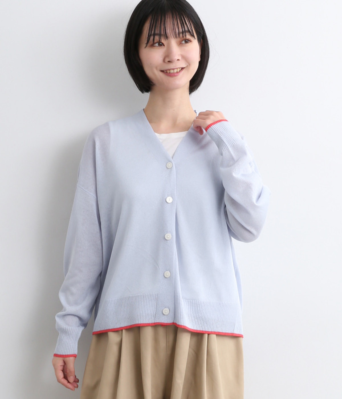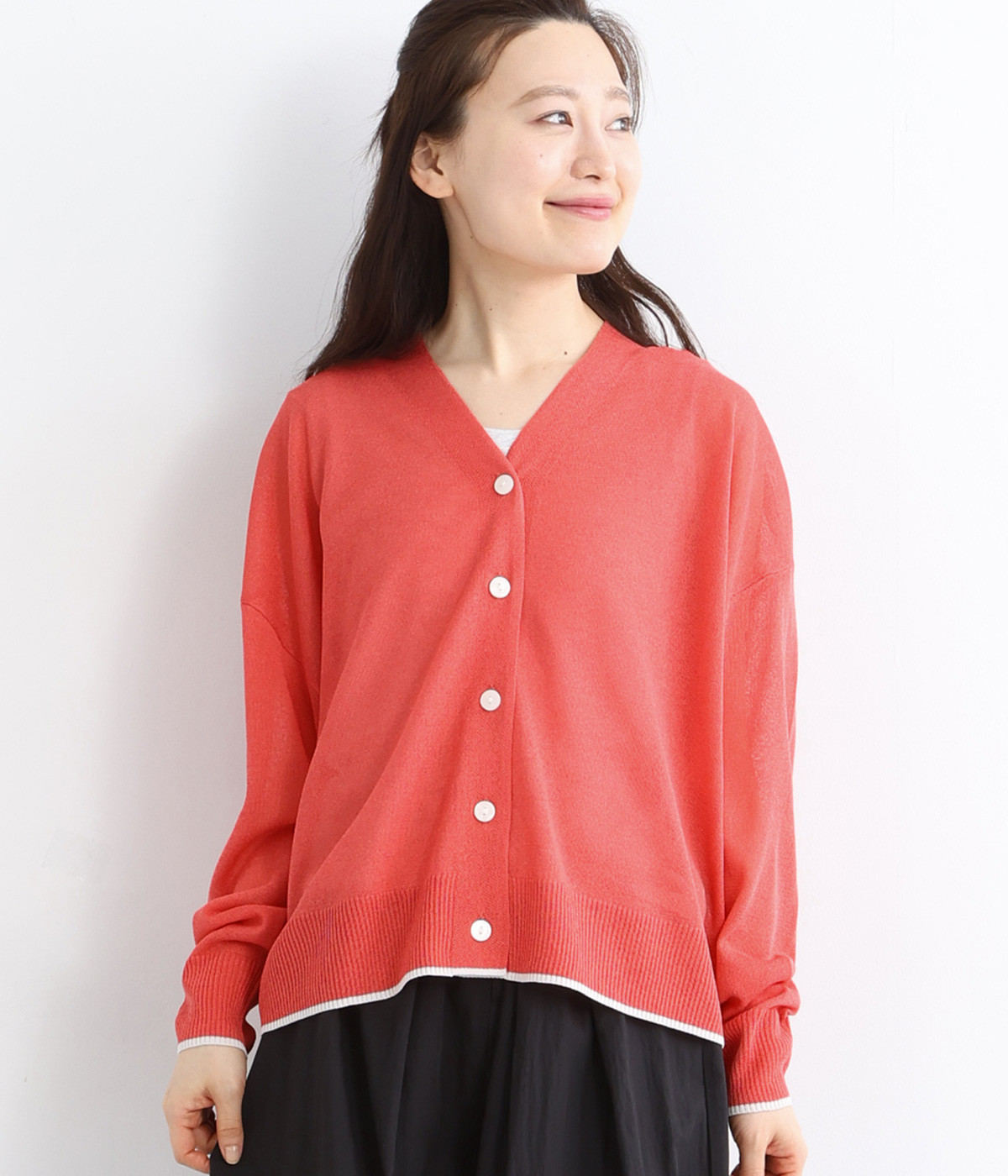 顔まわりをシャープに見せるほどよい開きのVネック。裾には配色ラインをあしらってメリハリをつけました。つやめくボタンにはロゴをデザインしてさり気ないアクセントに。ドロップショルダー&ワイドシルエットがゆったりとした雰囲気をかもし出しています。