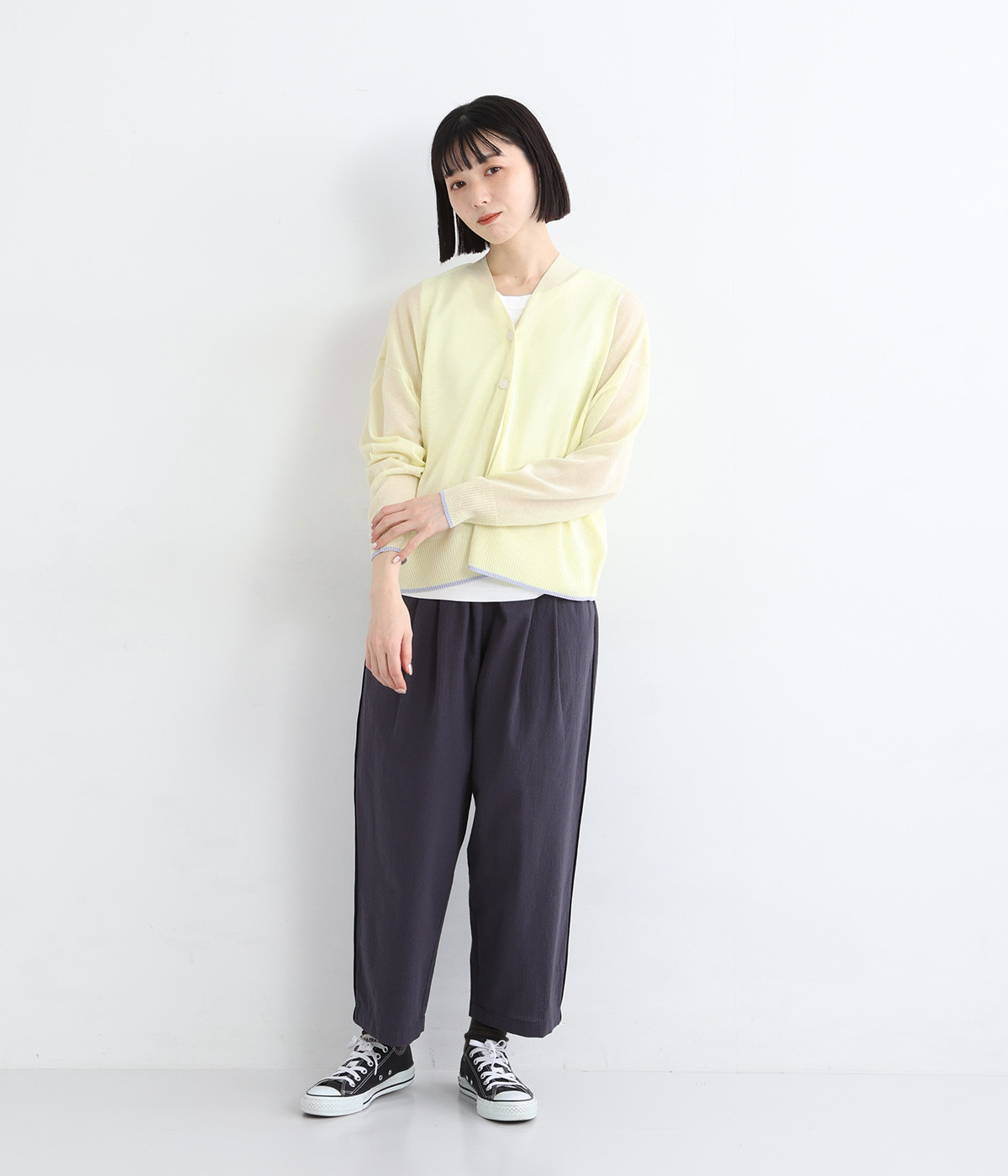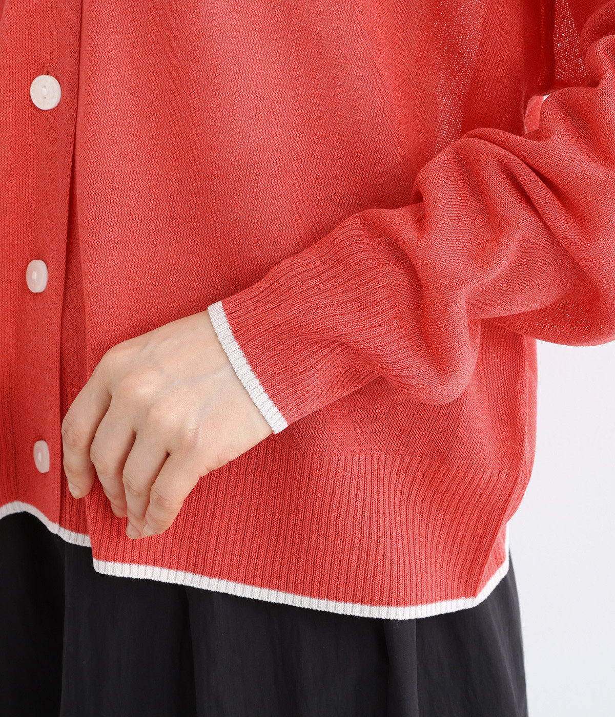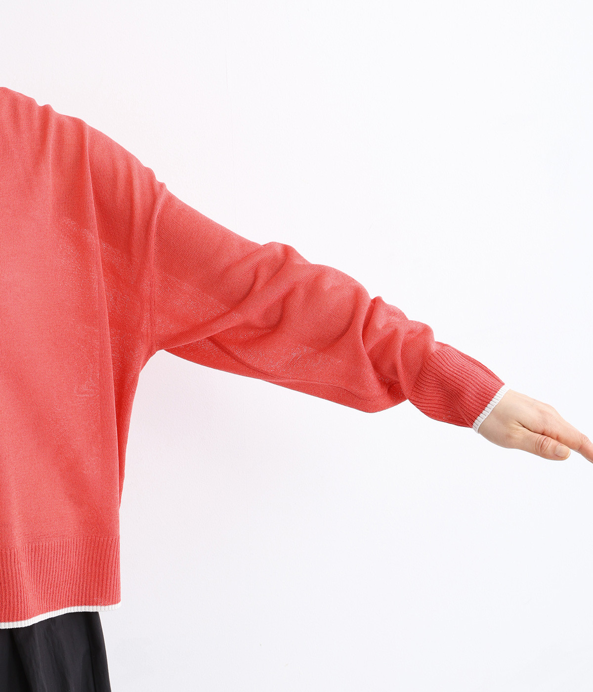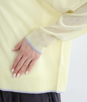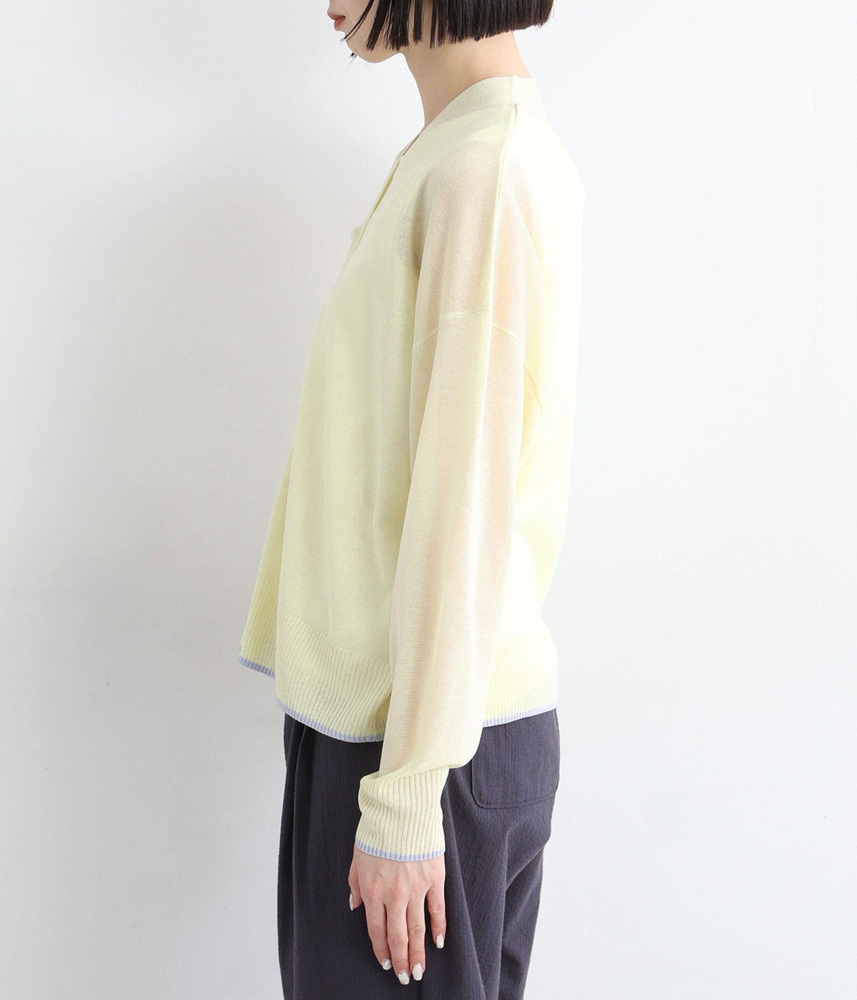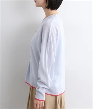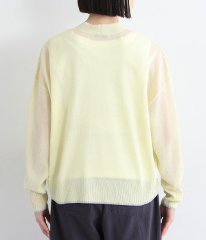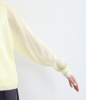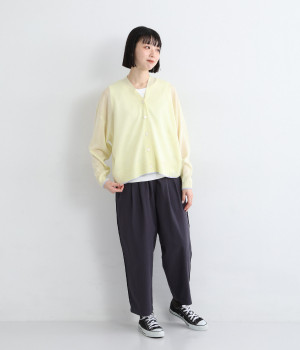 さっぱりと着こなせるドライな風合いのアクリル×ポリエステル生地を混紡したニット素材。透け感たっぷりの仕上がりになっているので、重ね着が重たく見えにくく着心地軽やかです。