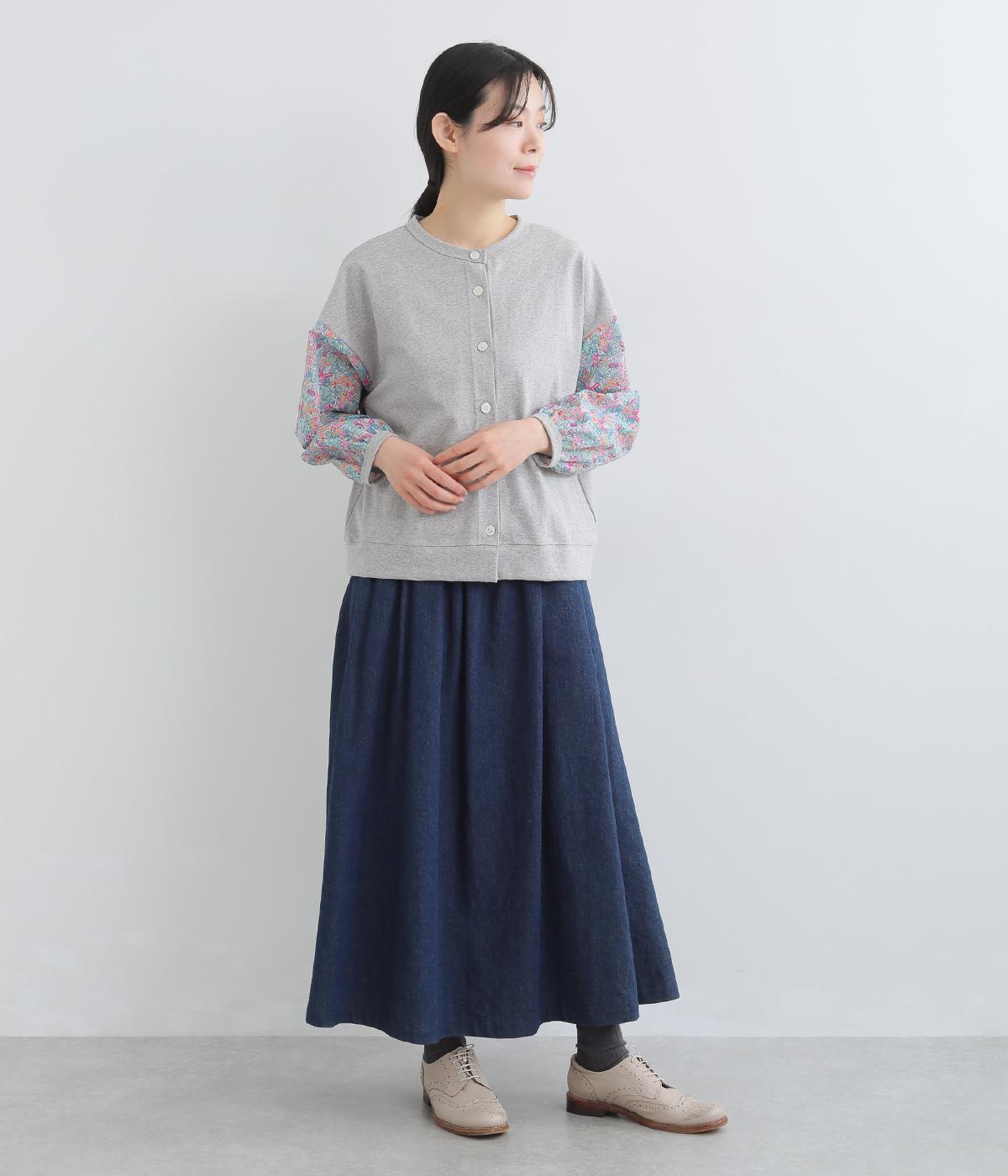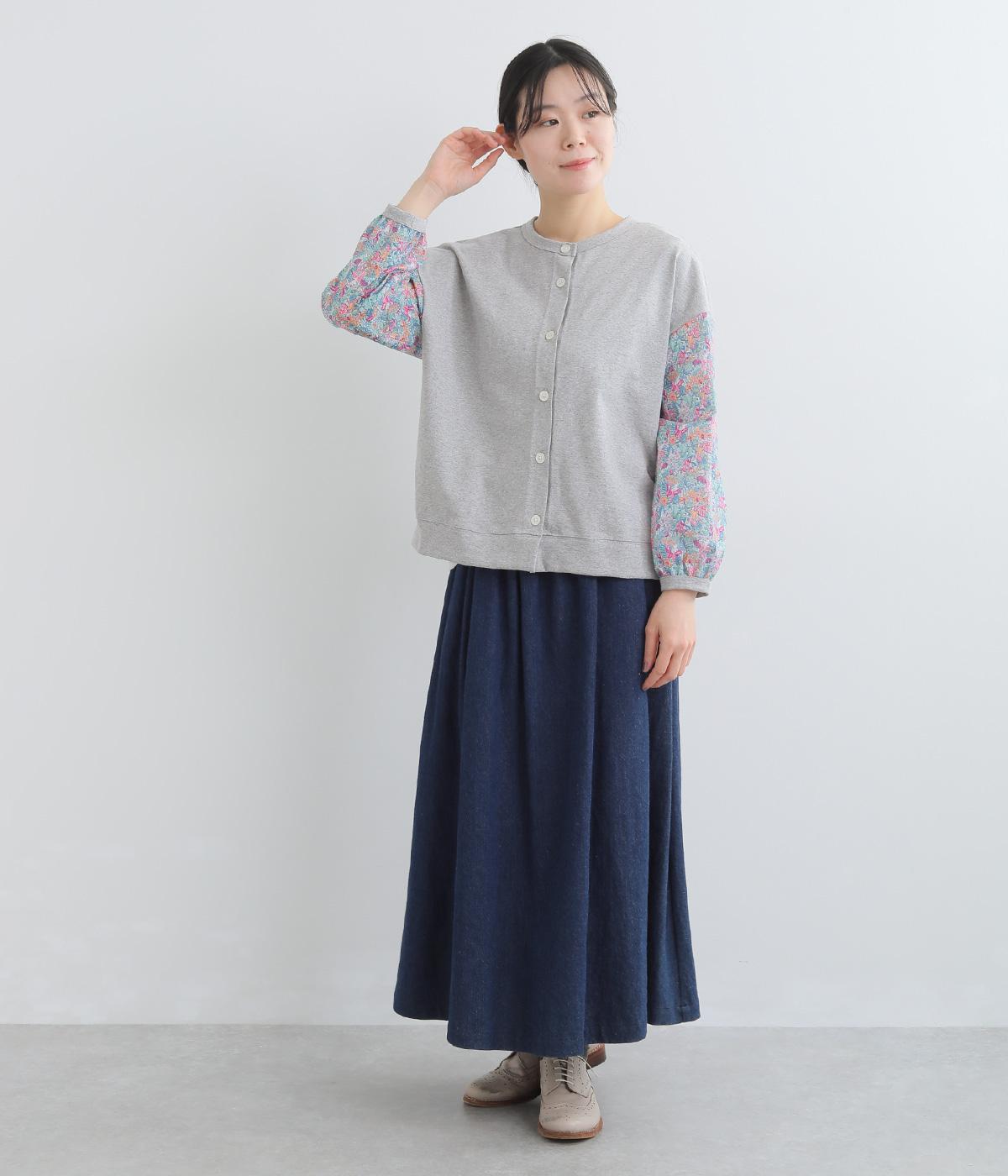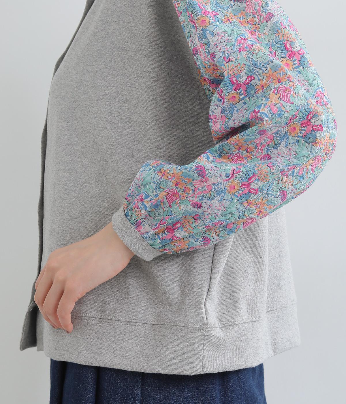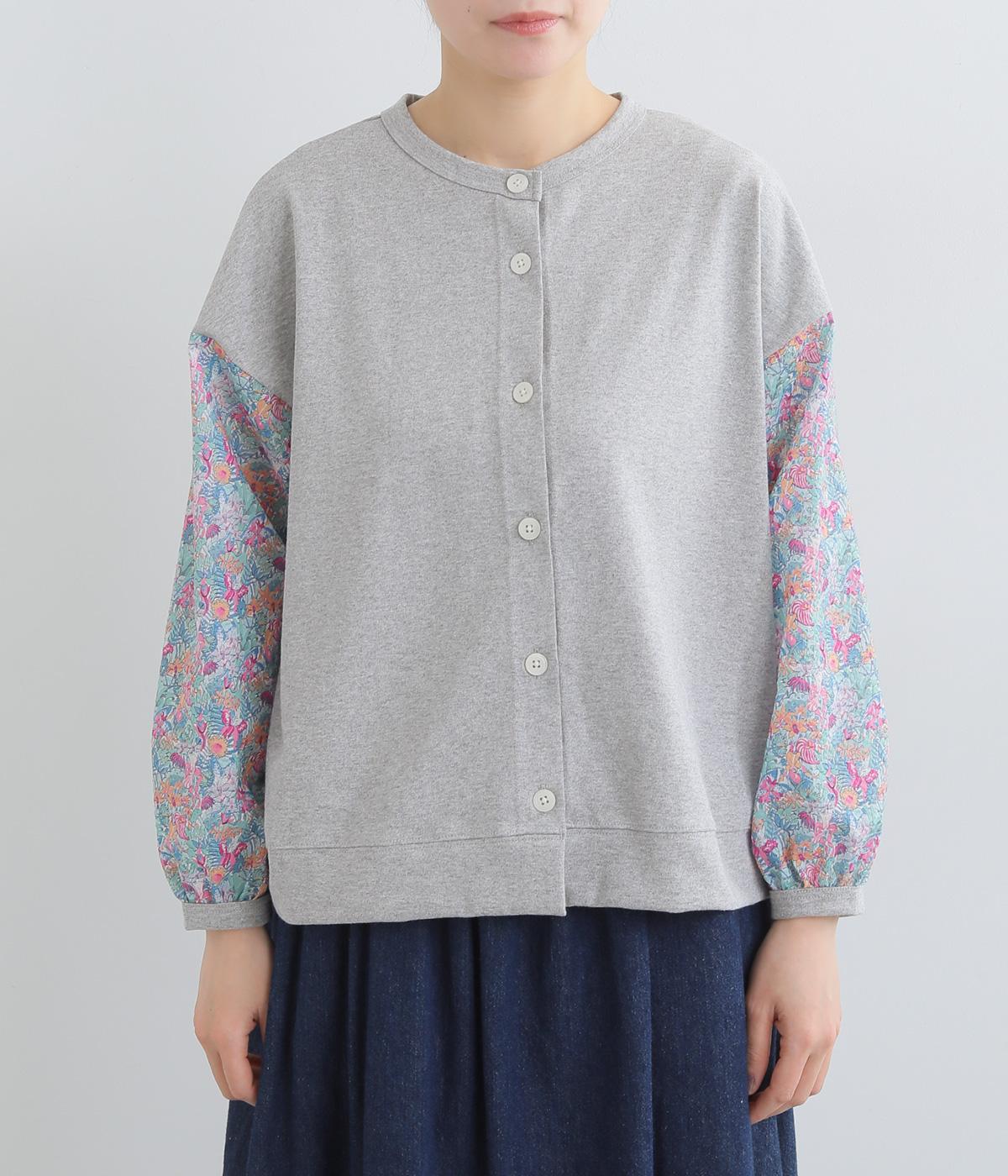 シンプルな形のカーディガン。袖には繊細でカラフルな花柄をあしらい、シンプルな身頃との切り替えが華やかなアクセントになるデザインです。