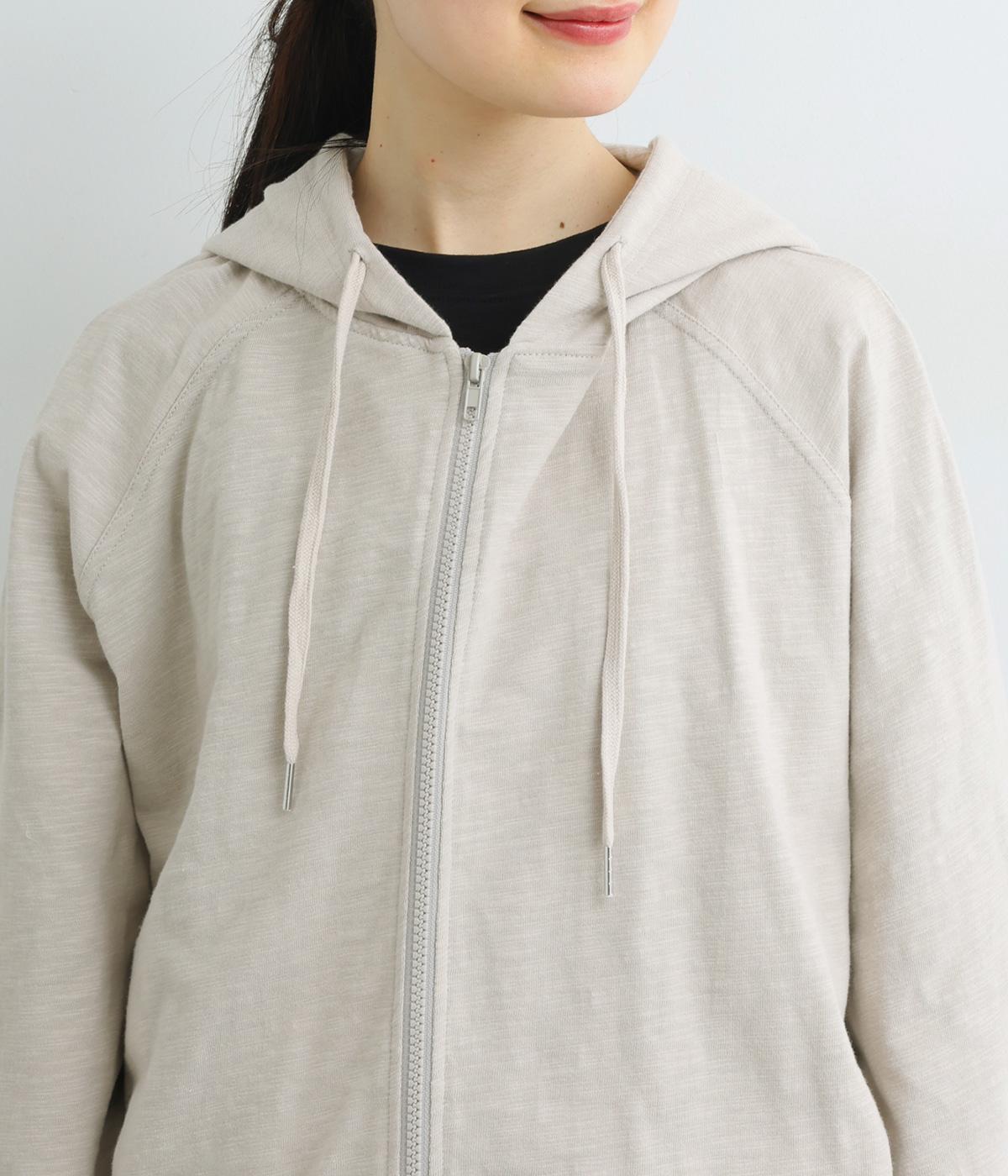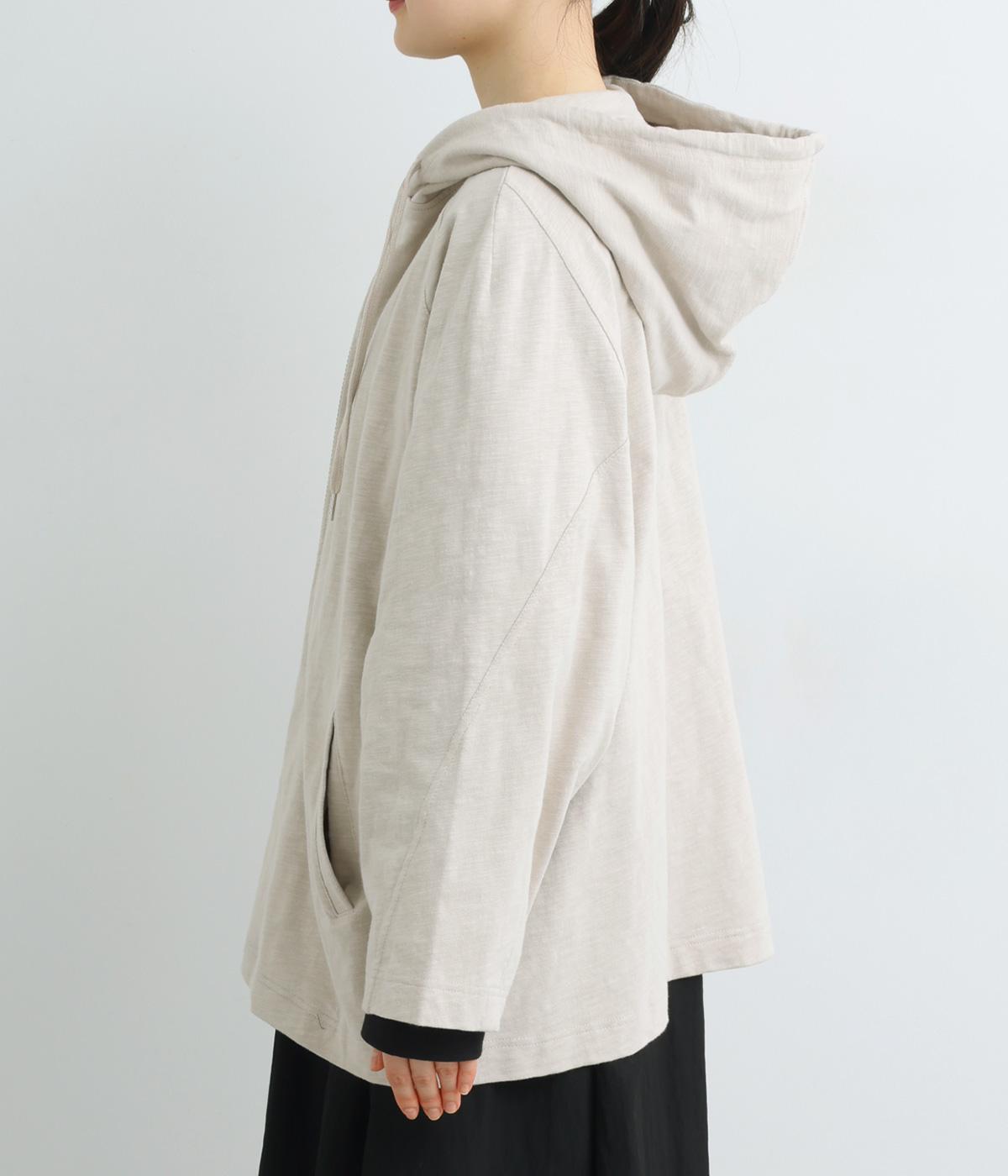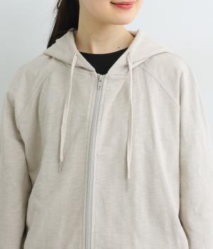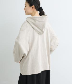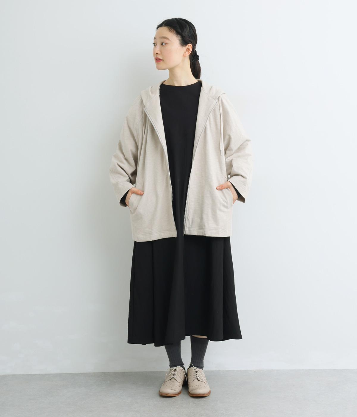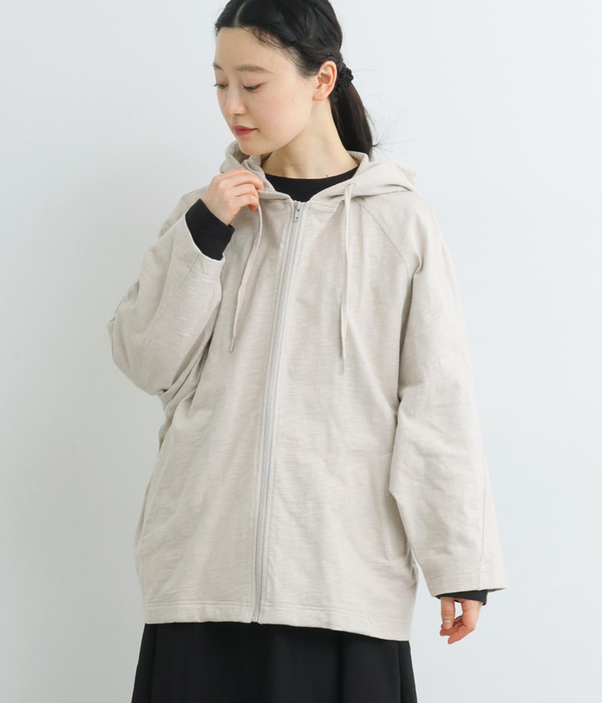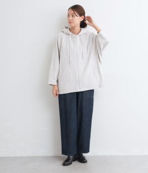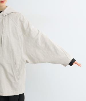 ゆったりとしたドルマンスリーブにワイドシルエットが特徴的なフードつきパーカー。がばっと羽織りやすいのでデイリーに活躍し、袖口や裾はあえてリブに切り替えずラフにまとめています。ファスナーも同色にまとめて統一感を。