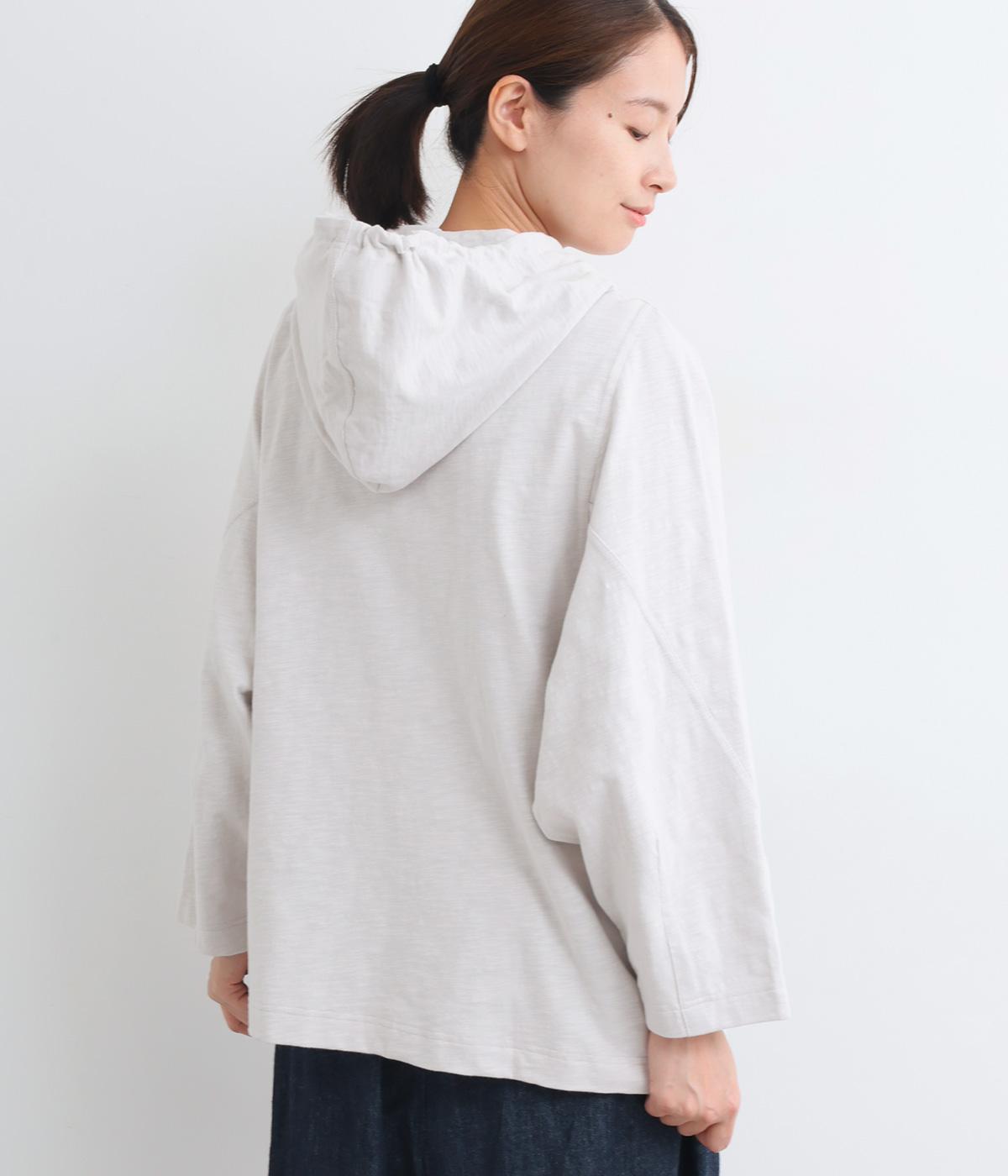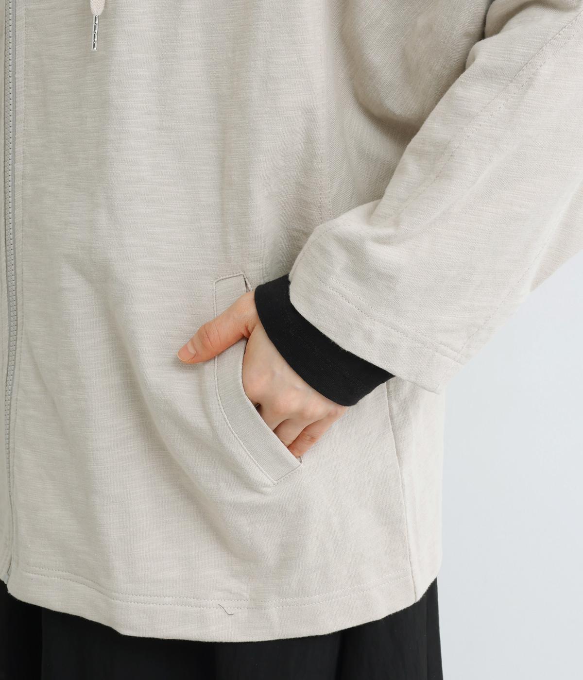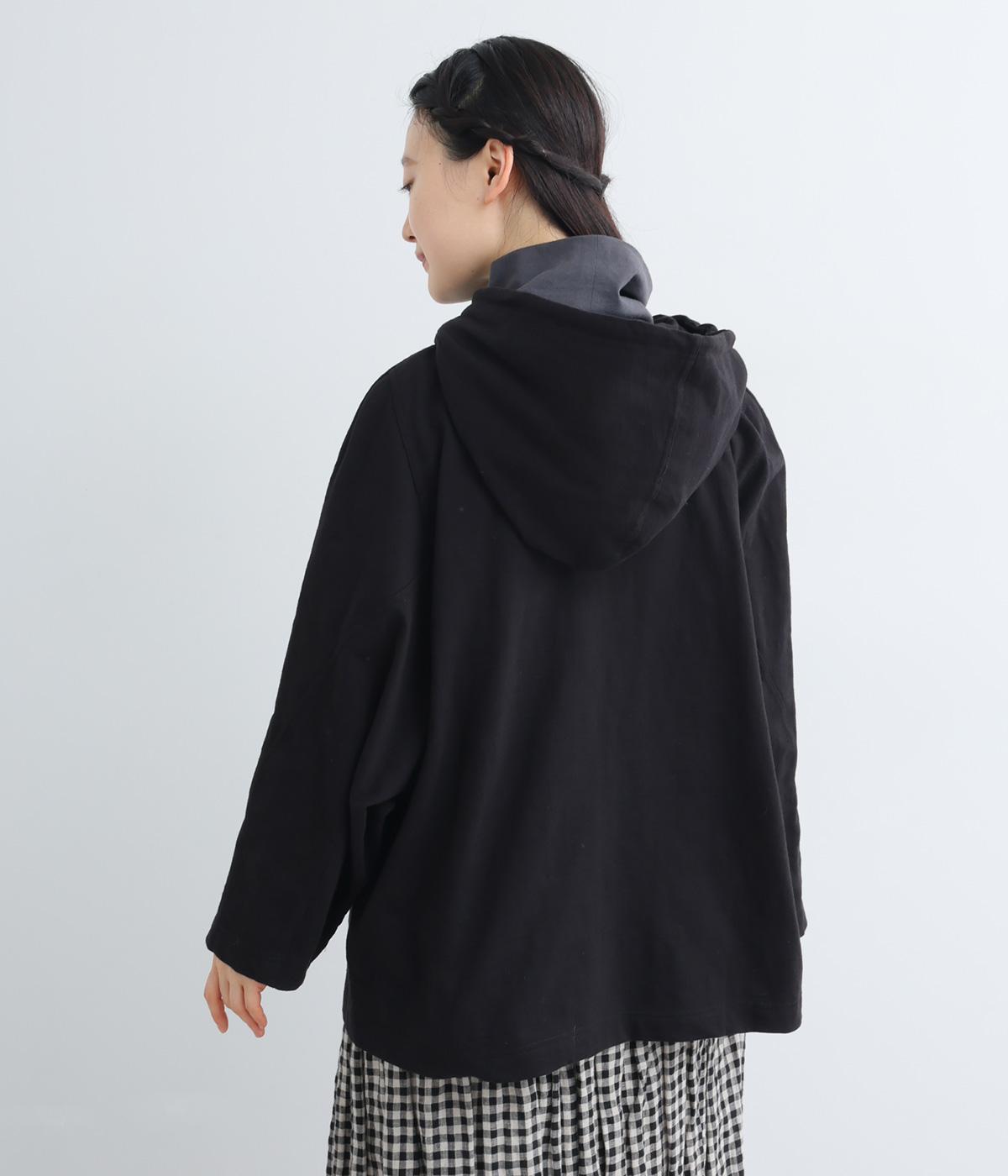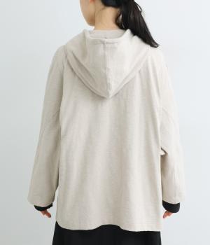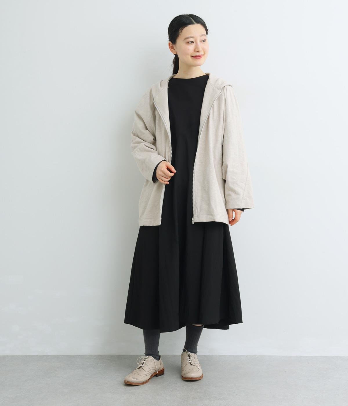 ゆったりとしたドルマンスリーブにワイドシルエットが特徴的なフードつきパーカー。がばっと羽織りやすいのでデイリーに活躍し、袖口や裾はあえてリブに切り替えずラフにまとめています。ファスナーも同色にまとめて統一感を。