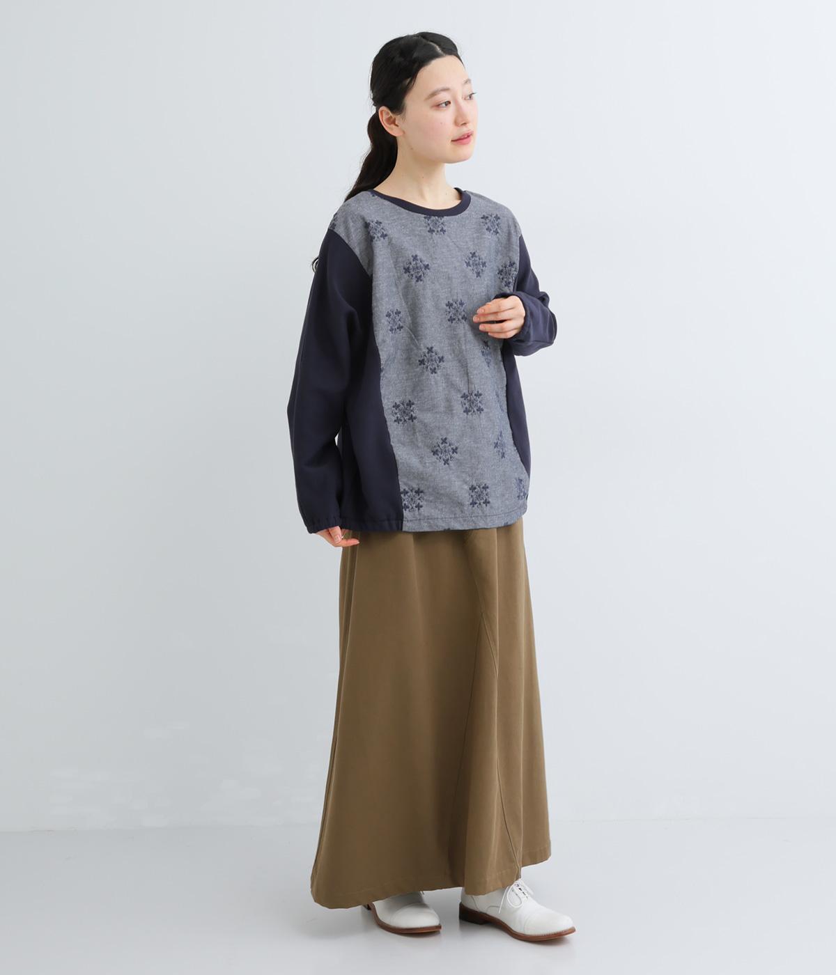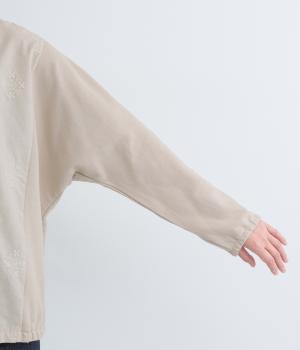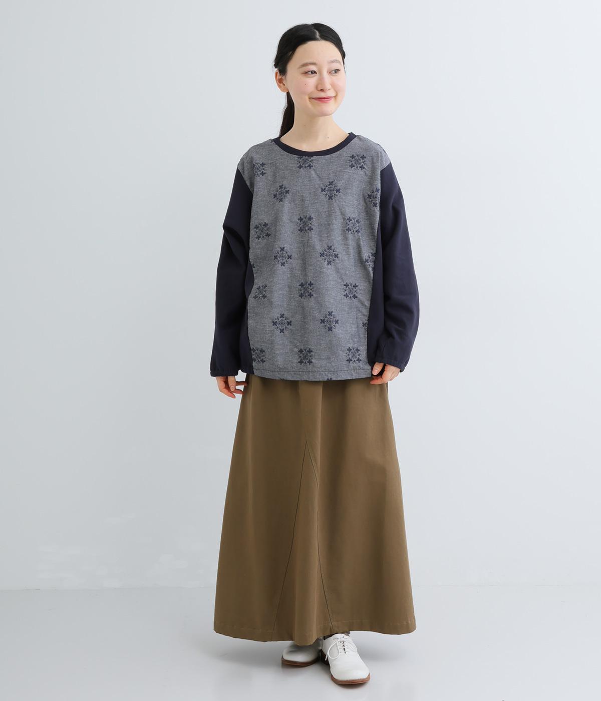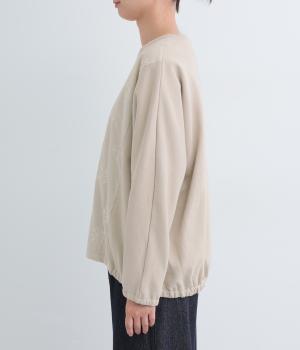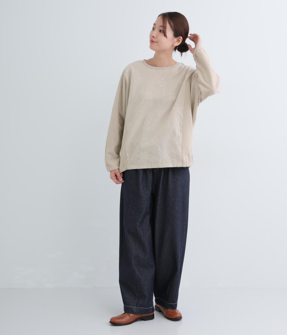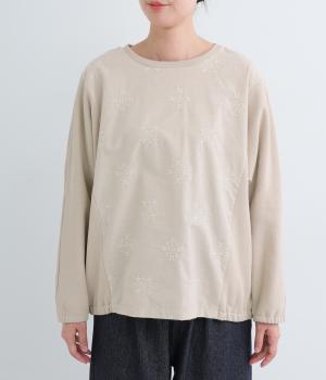 前身頃にはクラシカルな雰囲気の花柄刺しゅうをほどこし、プレーンな後身頃には裾にゴムを配してぽわんとしたシルエットを表現しました。定番のプルオーバーにデザイン性を持たせ、サッと着るだけでスタイリングが決まる一枚です。